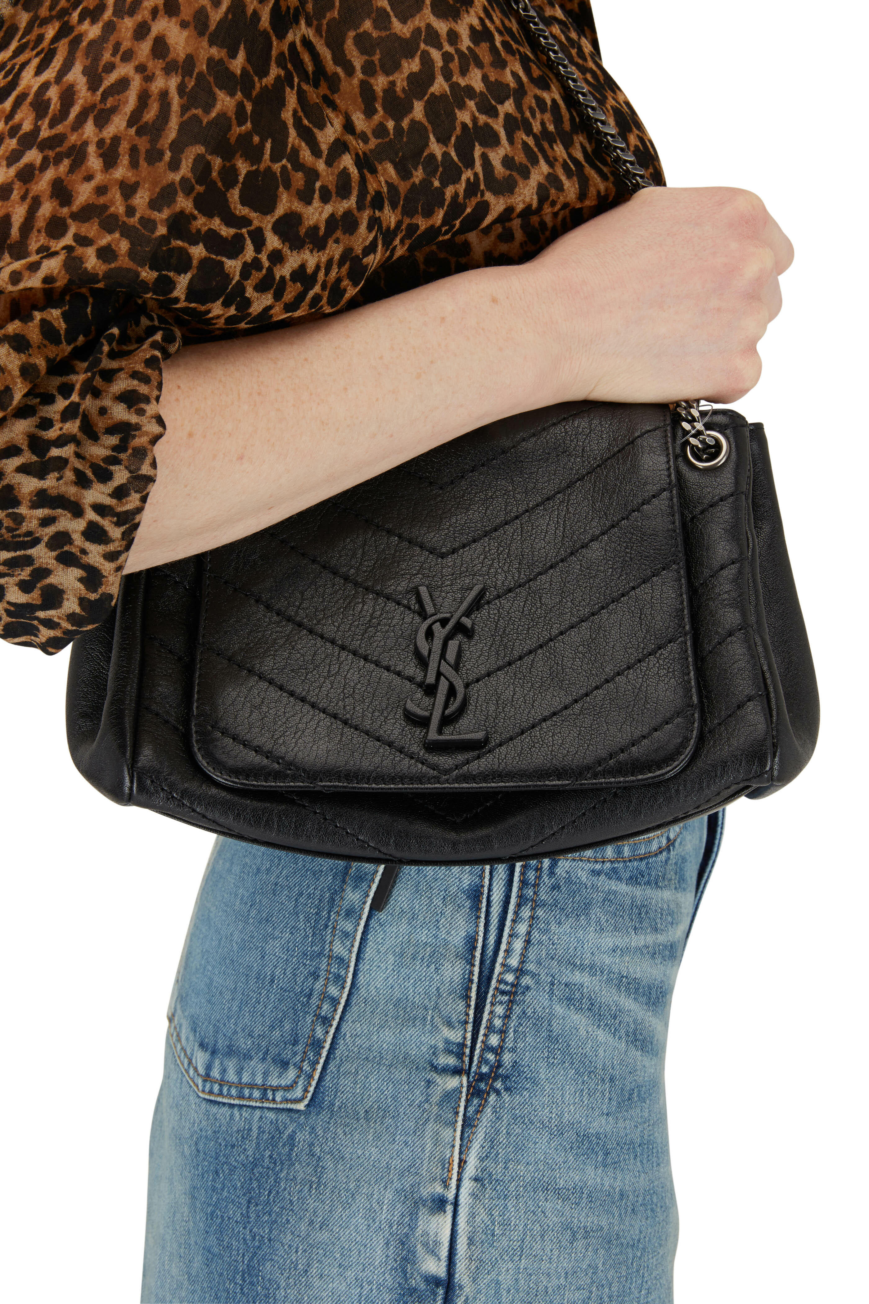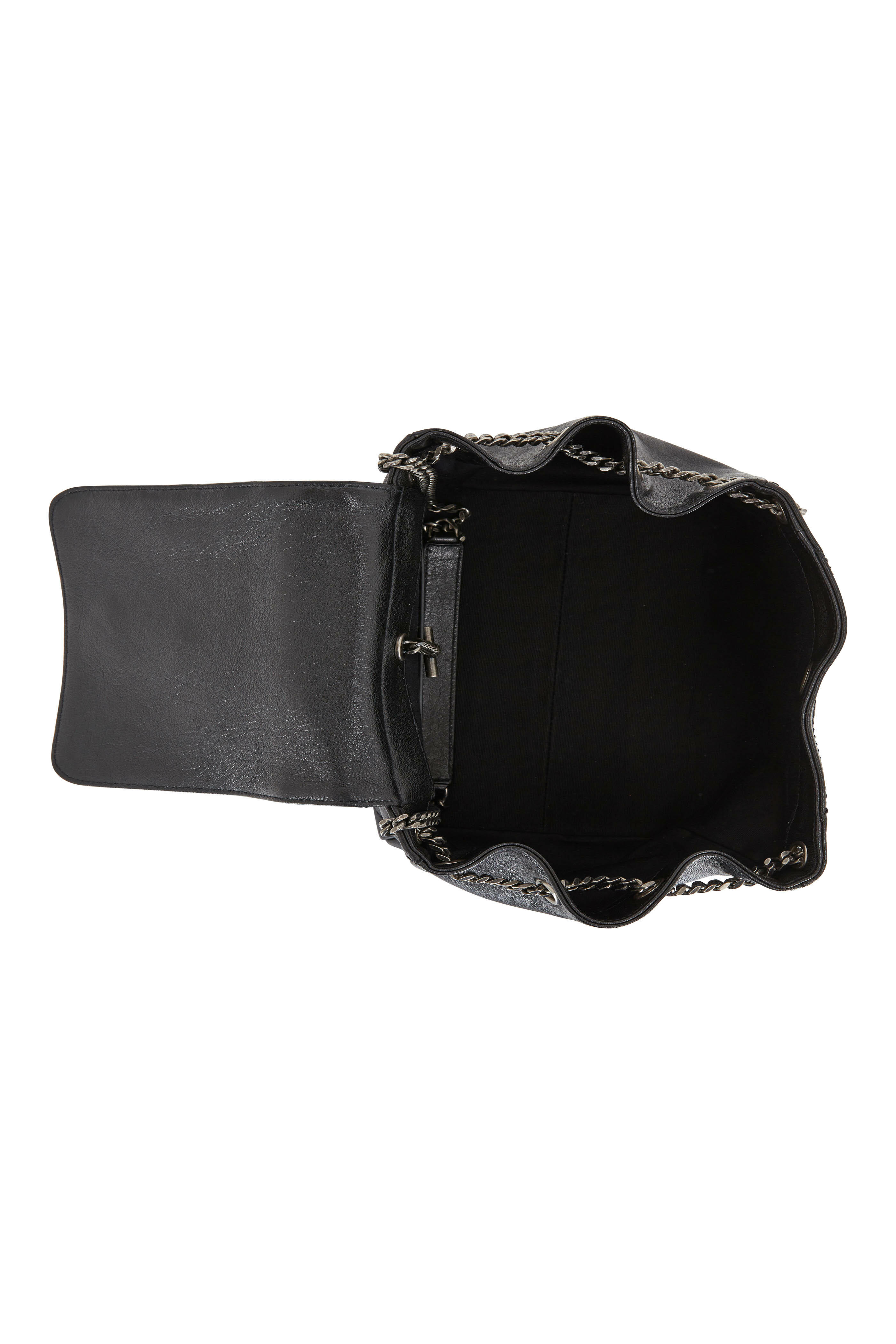 Lambskin leather. Convertible chain with leather inset strap. Flap front, tonal lacquer logo detail. Gusseted sides. Interior chain lock closure. One interior open pocket. Lined in leather. Made in Italy. Width: 9". Height: 6". Depth: 5". Strap drop: 10".