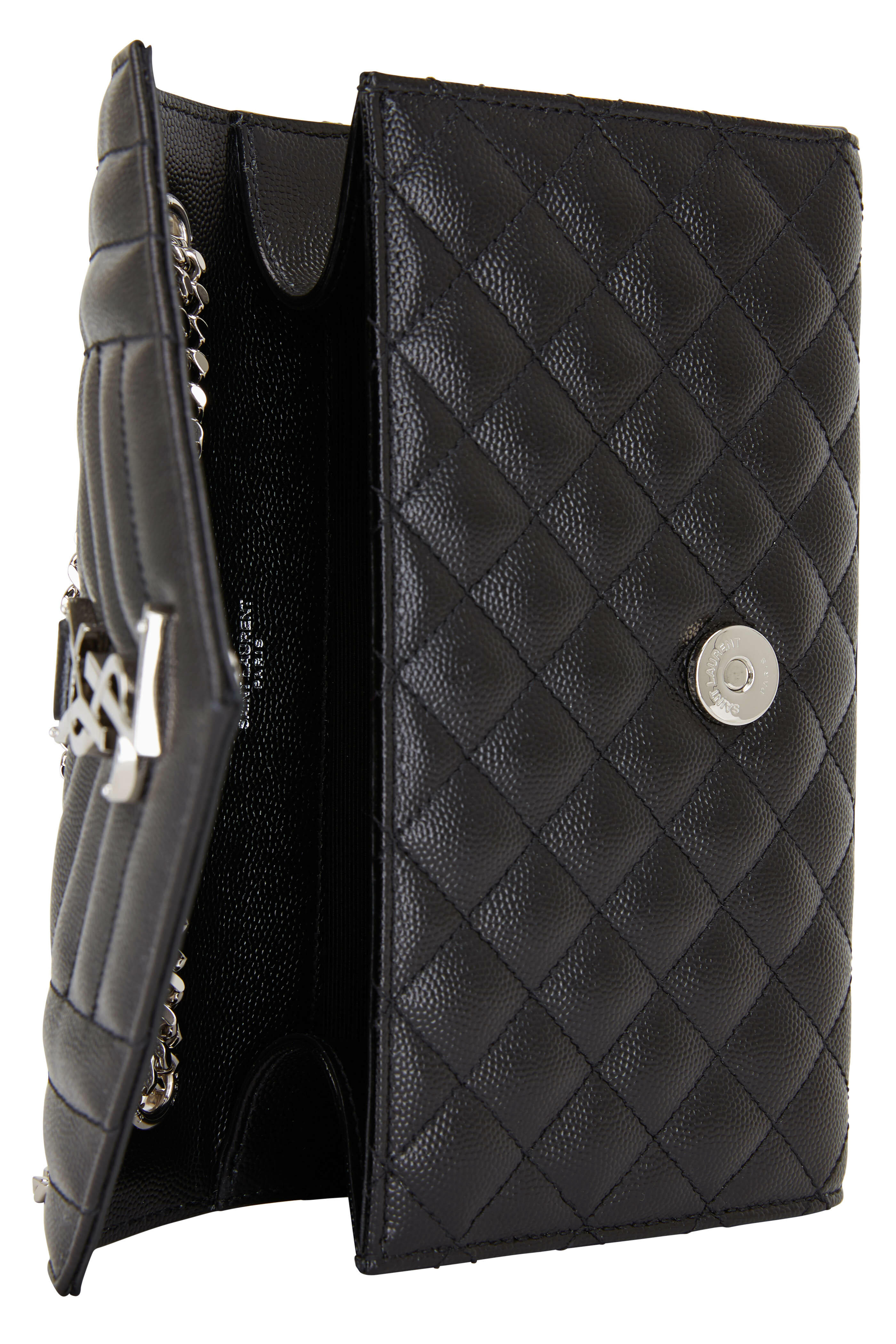 Quilted calfskin leather. Flap front; magnetic snap closure. Detachable silver chain with leather inset strap. Silver metallic signature detail. Exterior back slip pocket. One interior card slot. Lined in canvas. Made in Italy. Width: 8 ½". Height: 5". Depth: 2 ½". Detachable chain strap drop: 21".