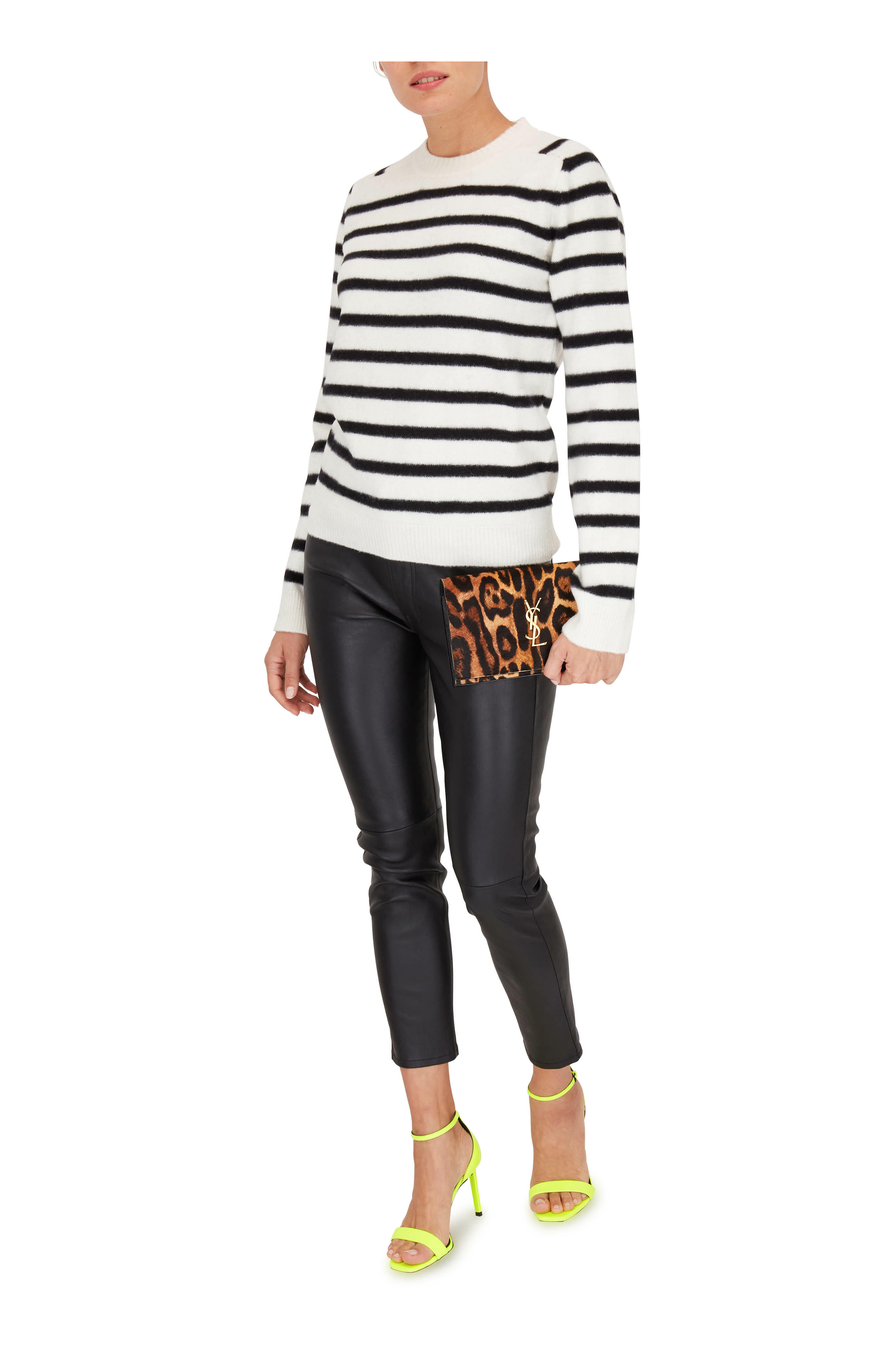 Crew neckline. Ribbed trim. Made in Italy. 100% virgin wool. Dry clean.