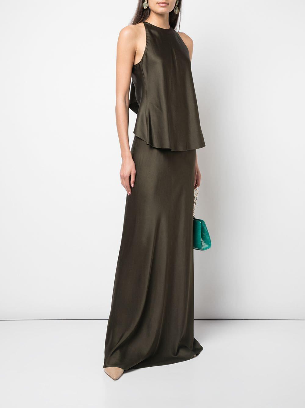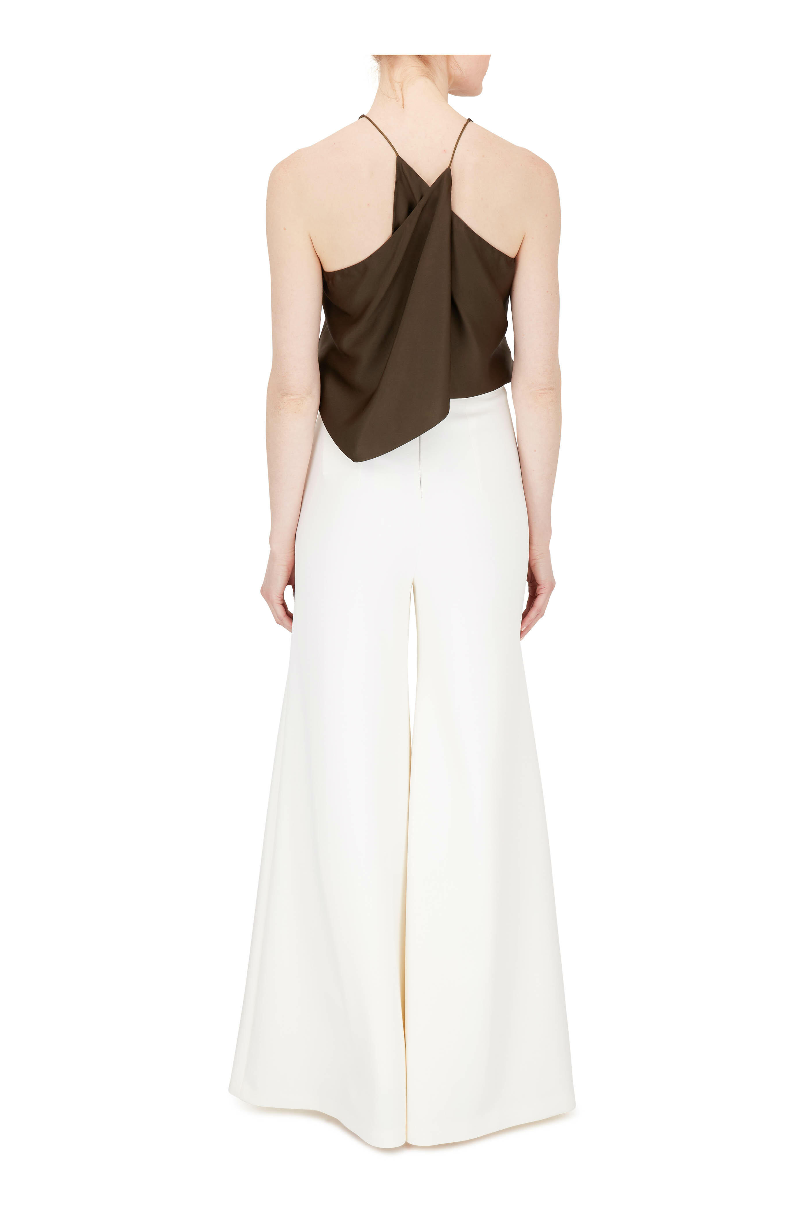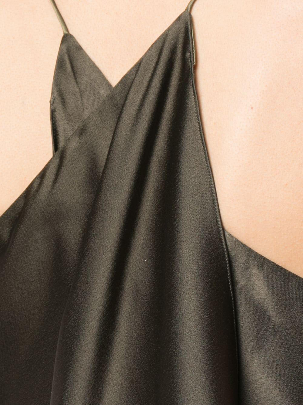 Halter neckline. Made in the USA. 82% acetate, 18% viscose. Dry clean.