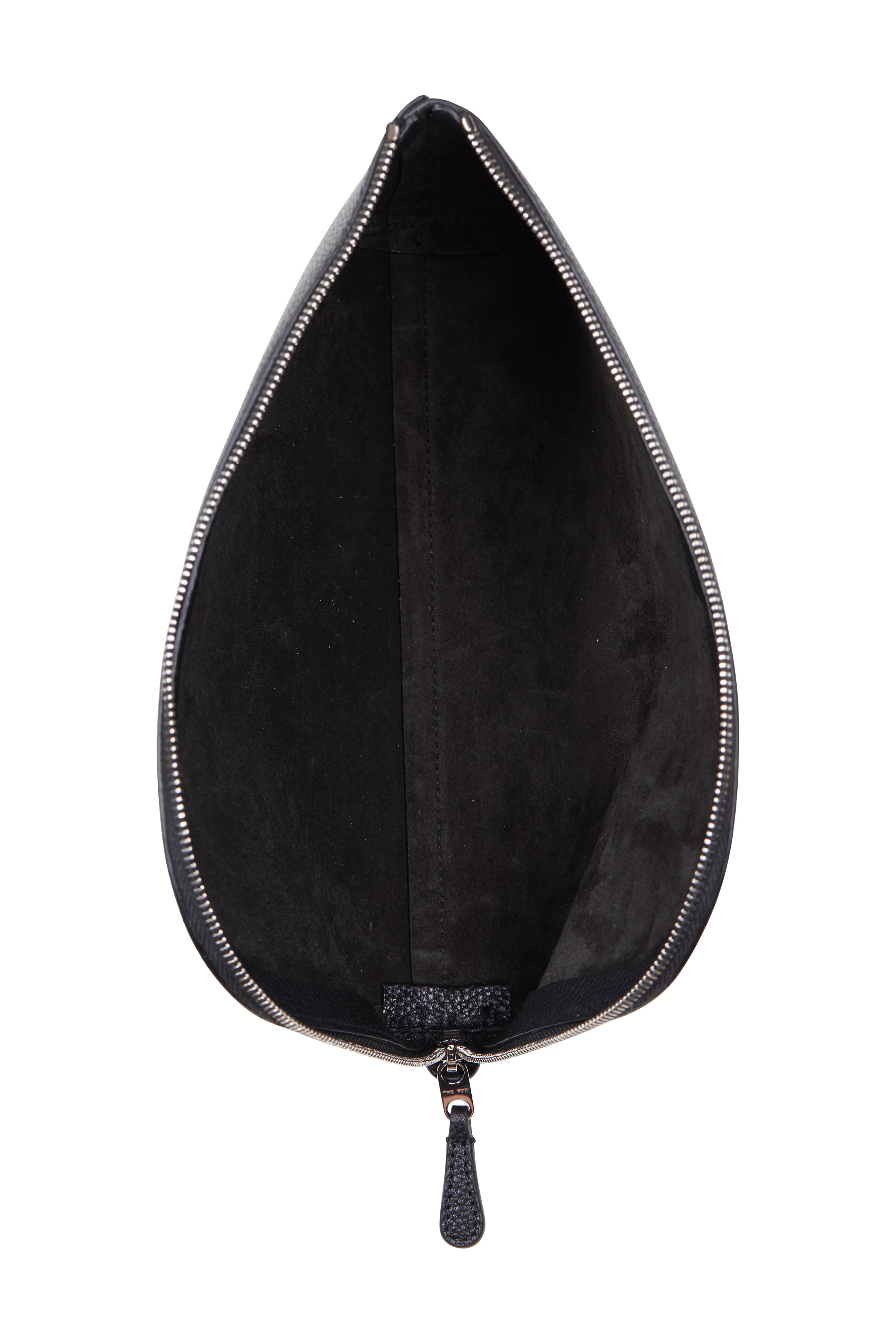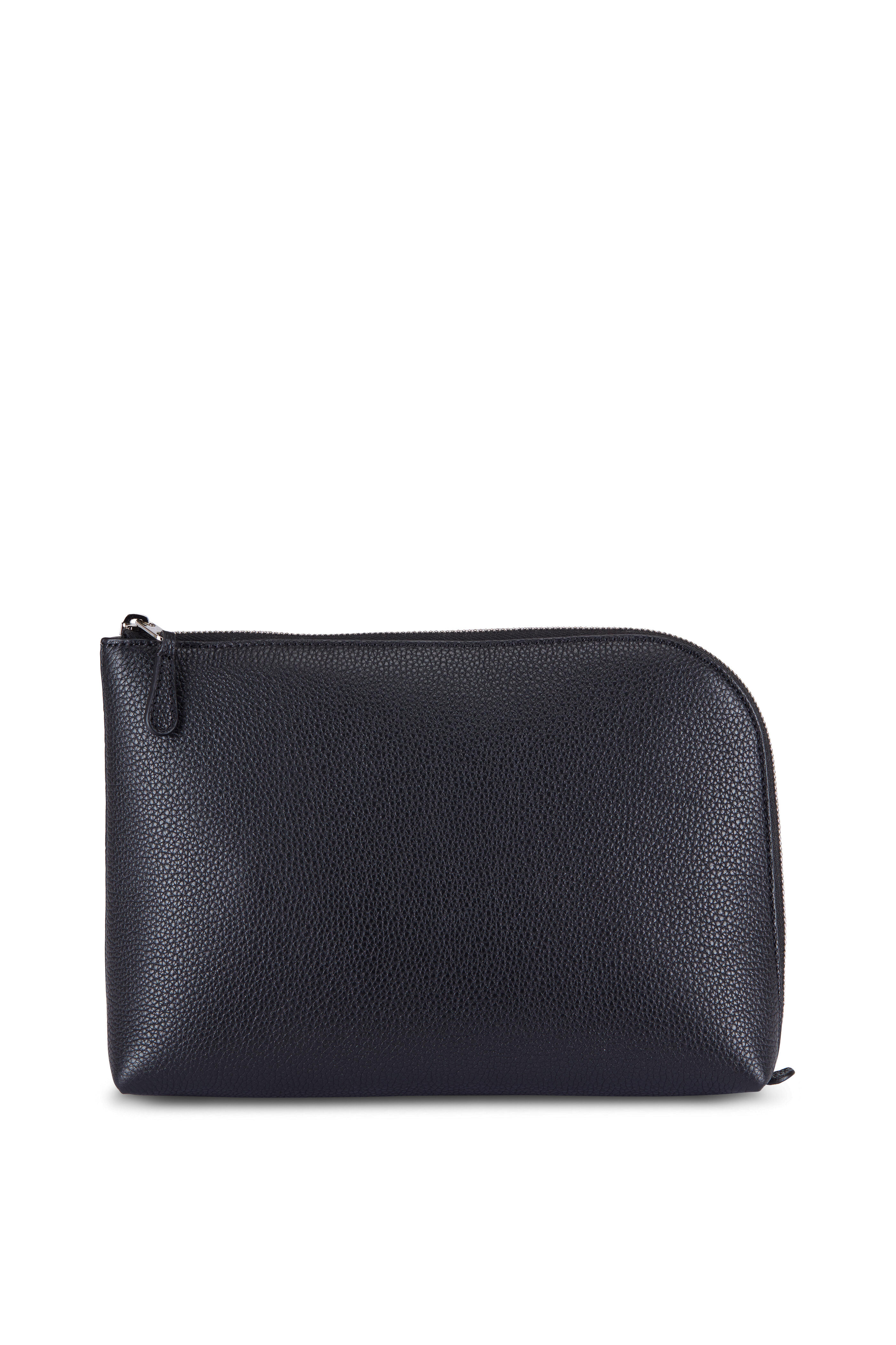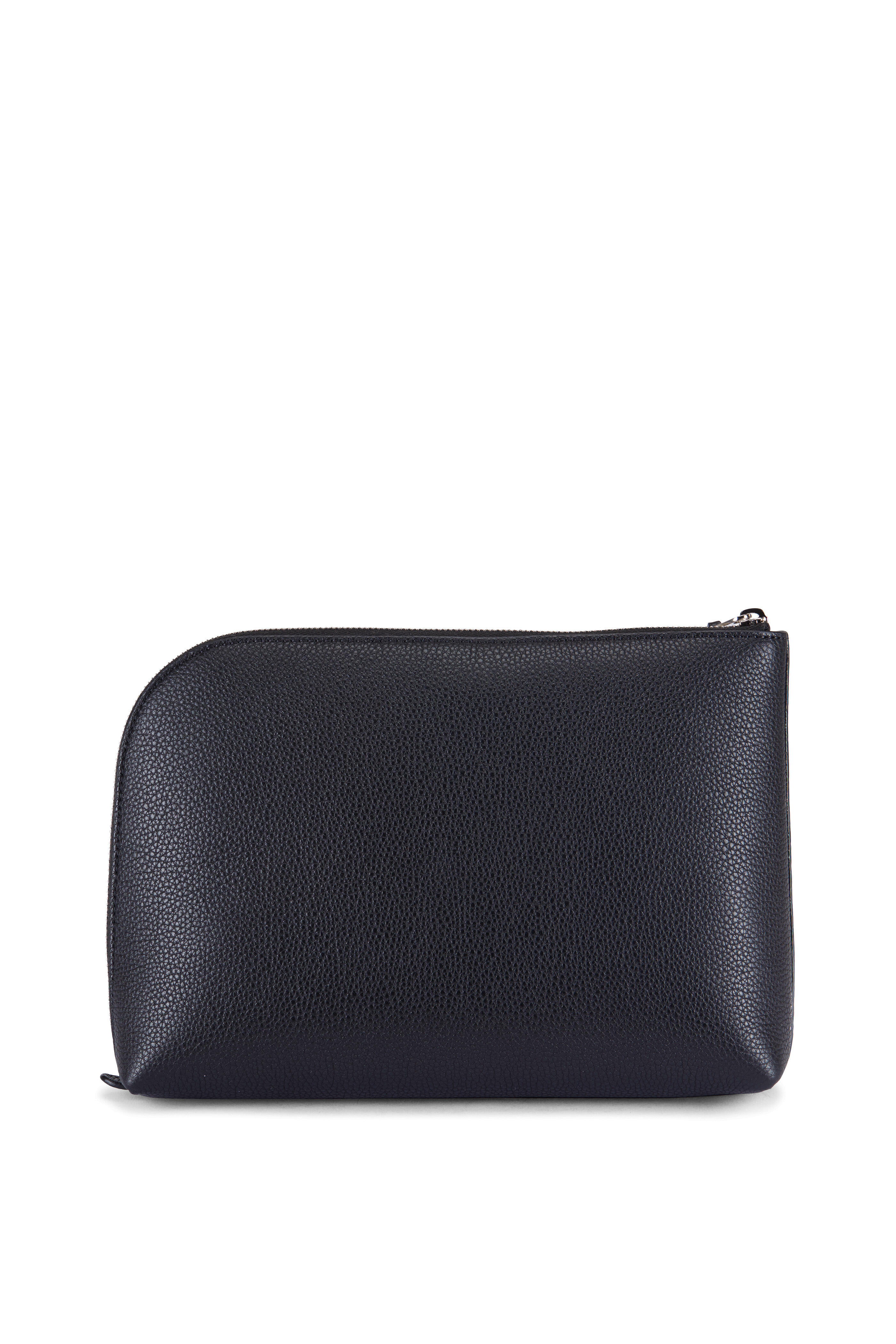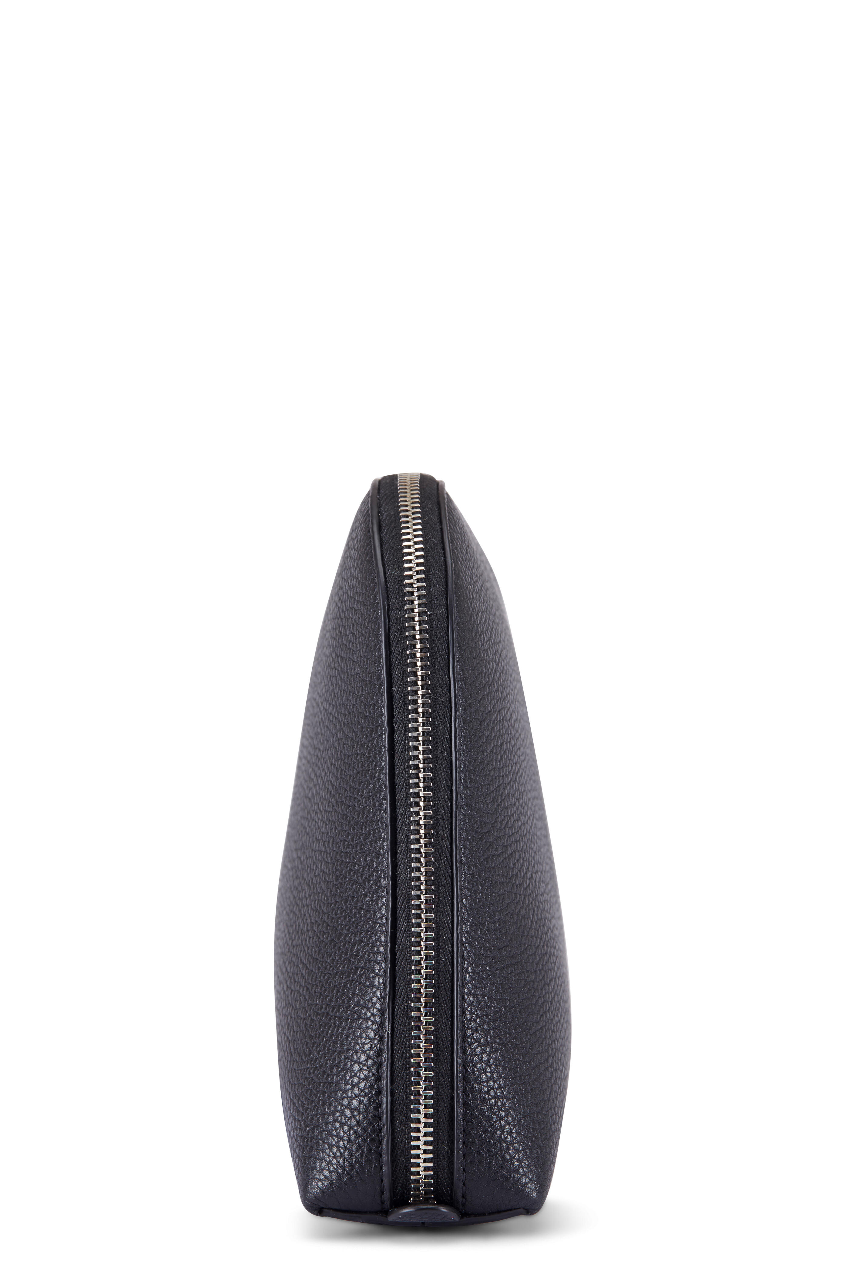 Grained calf leather. Zip top to side closure. Suede lining. Embossed signature lettering. Made in Italy. Width: 9". Height: 6 ½". Depth: 2".