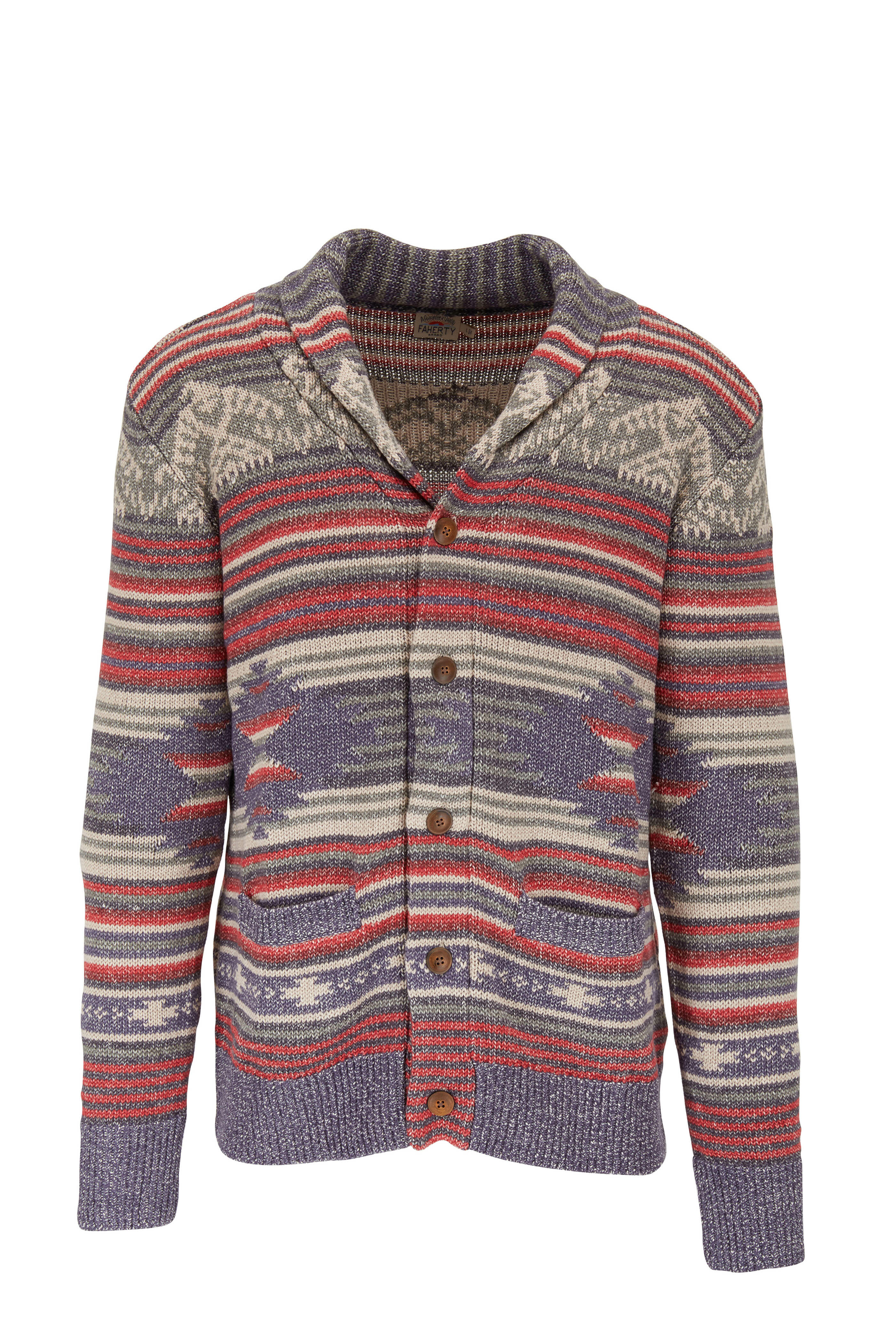 Shawl collar. Button placket. Lower welt pockets. Ribbed trim. Imported. 53% cotton, 47% acrylic. Hand wash.