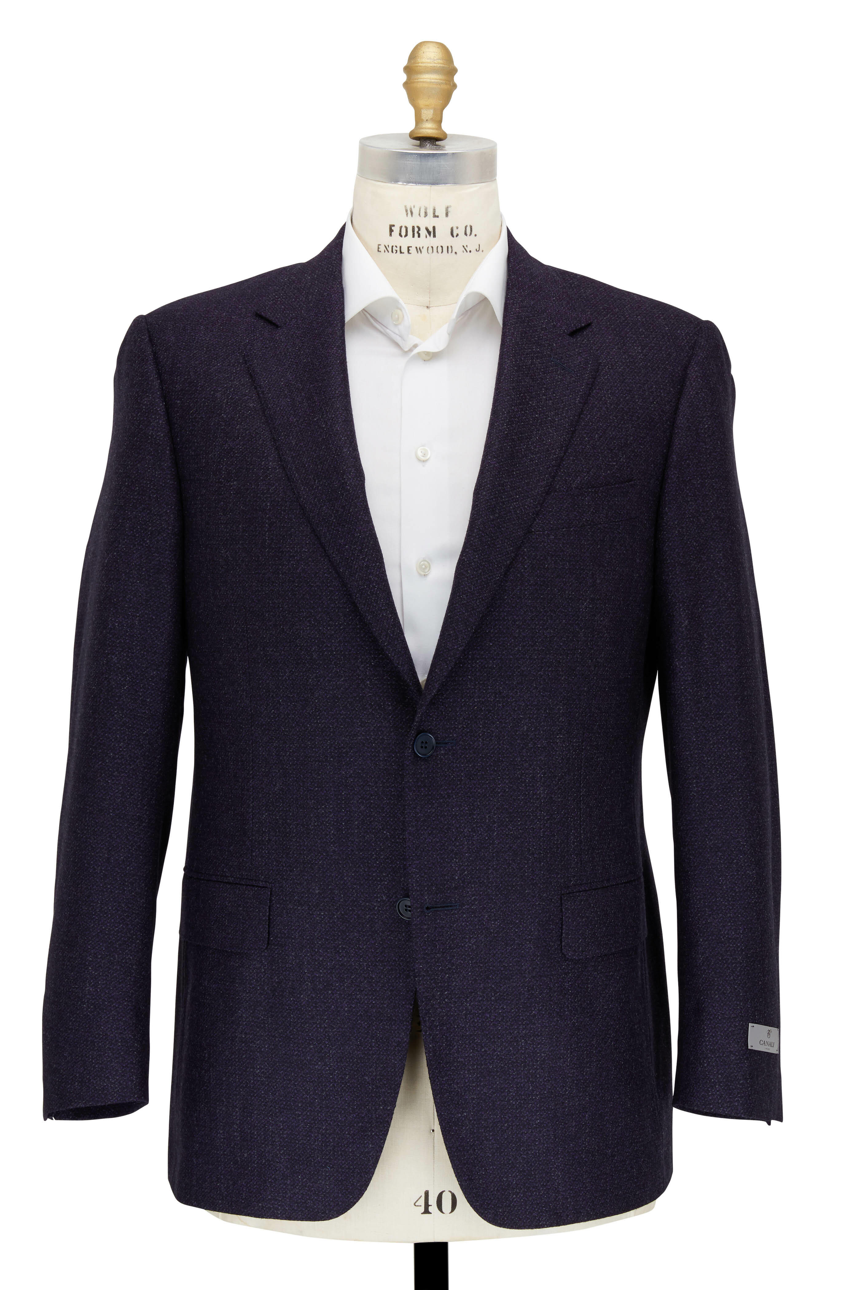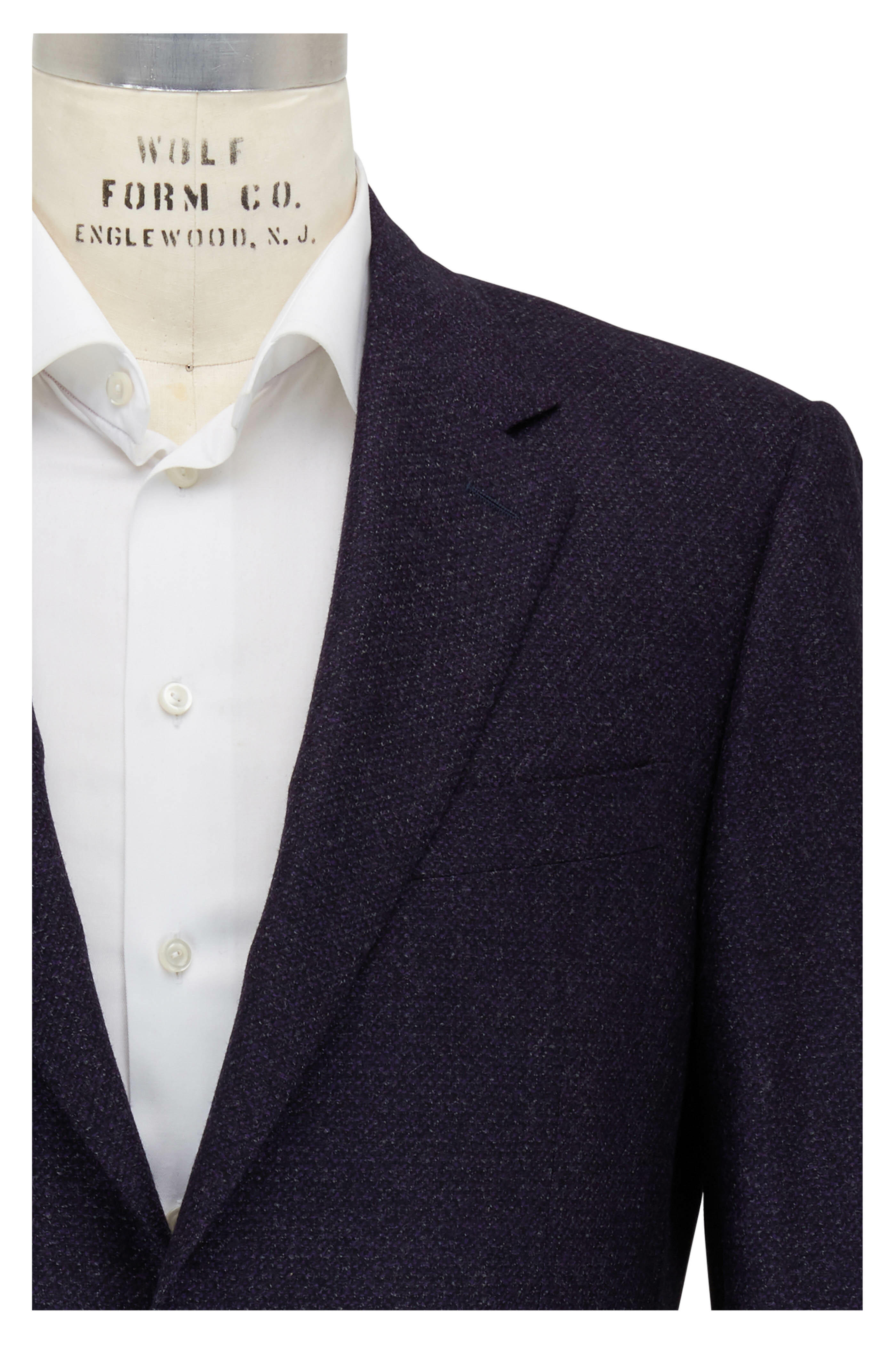 Notched lapels. Two button closure. Lower flap pockets; chest welt pocket. Double vent. Made in Italy. 100% wool. Dry clean.