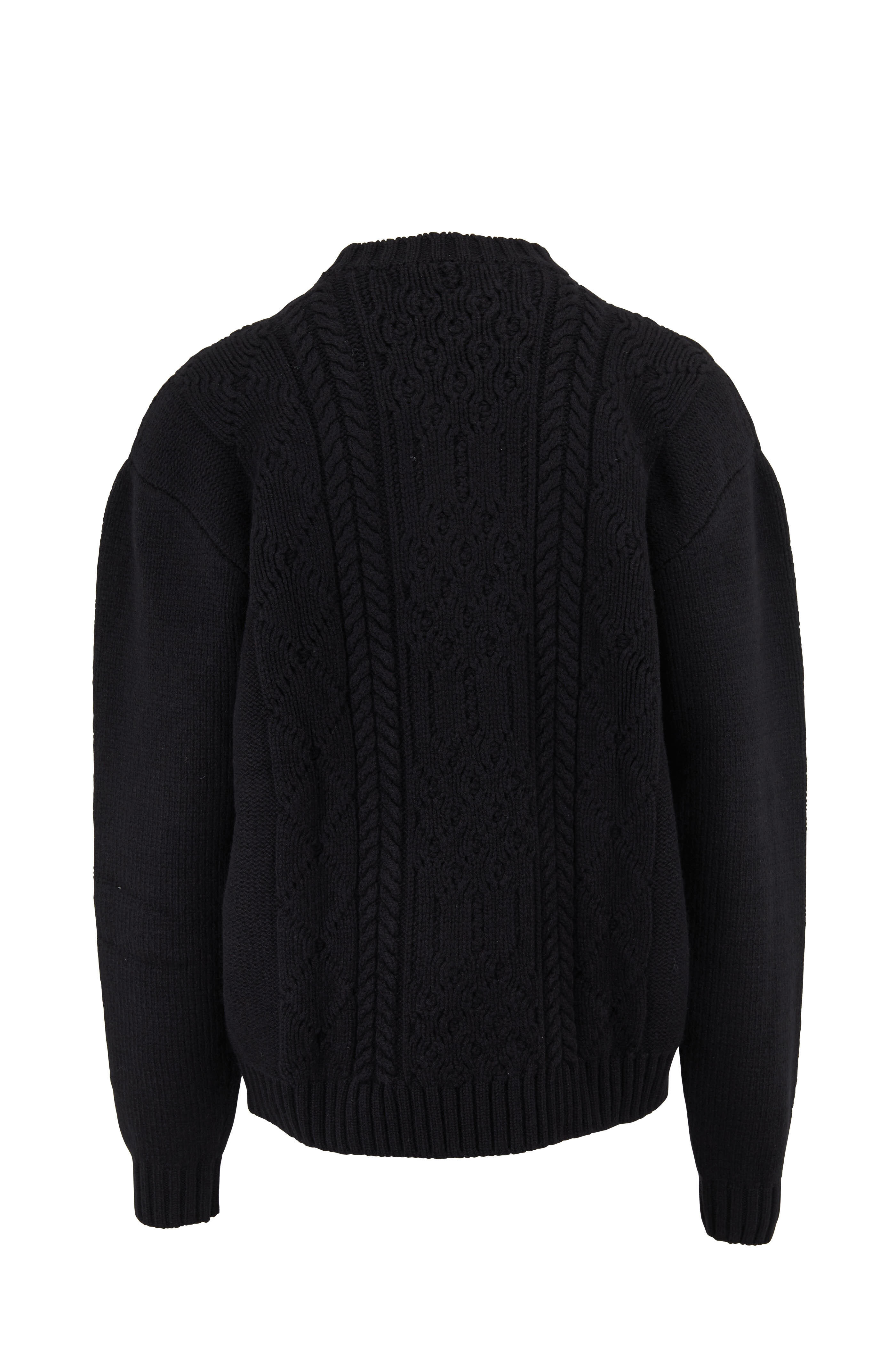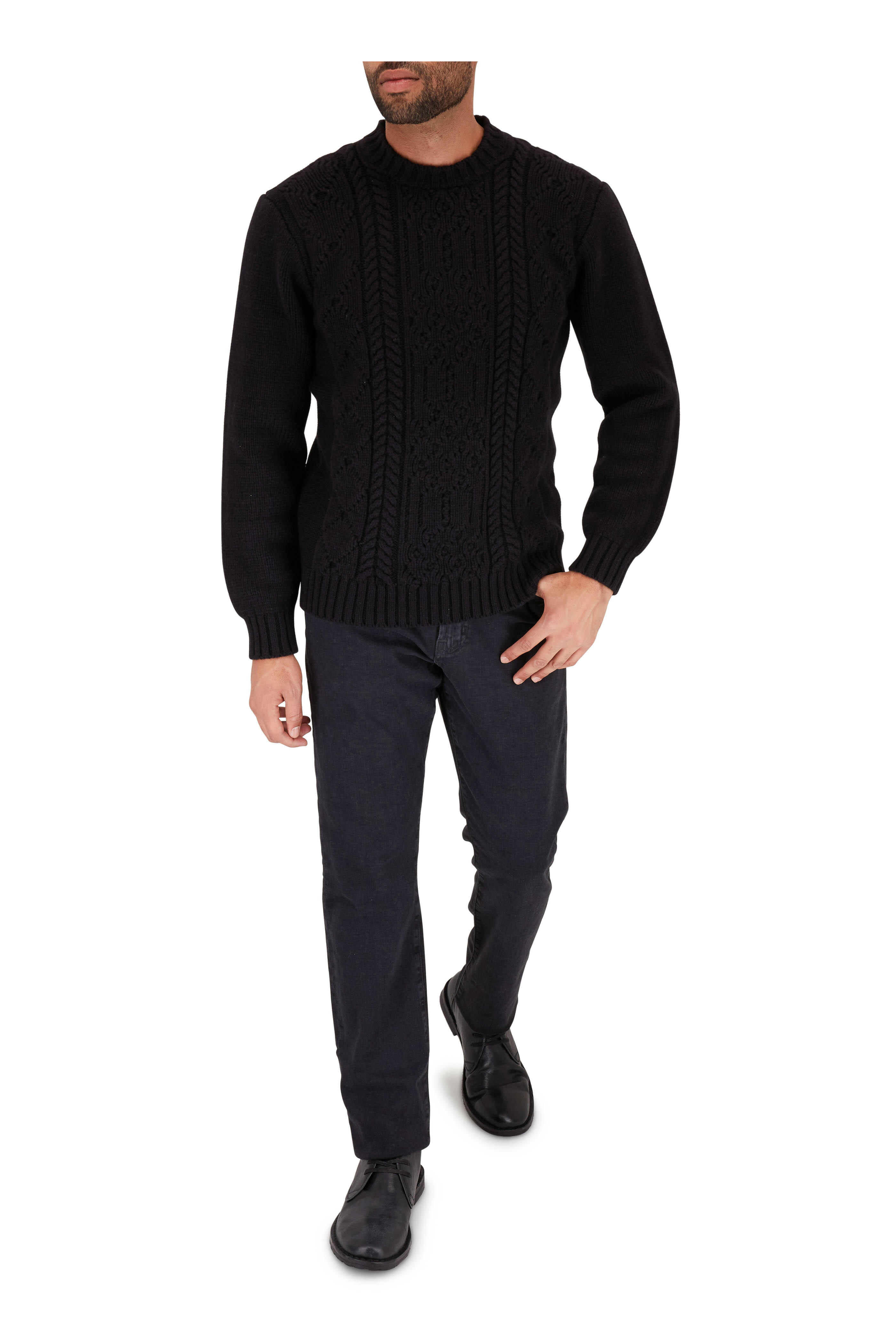 Crewneck. Ribbed trim. Made in Ireland. 100% wool. Dry clean.