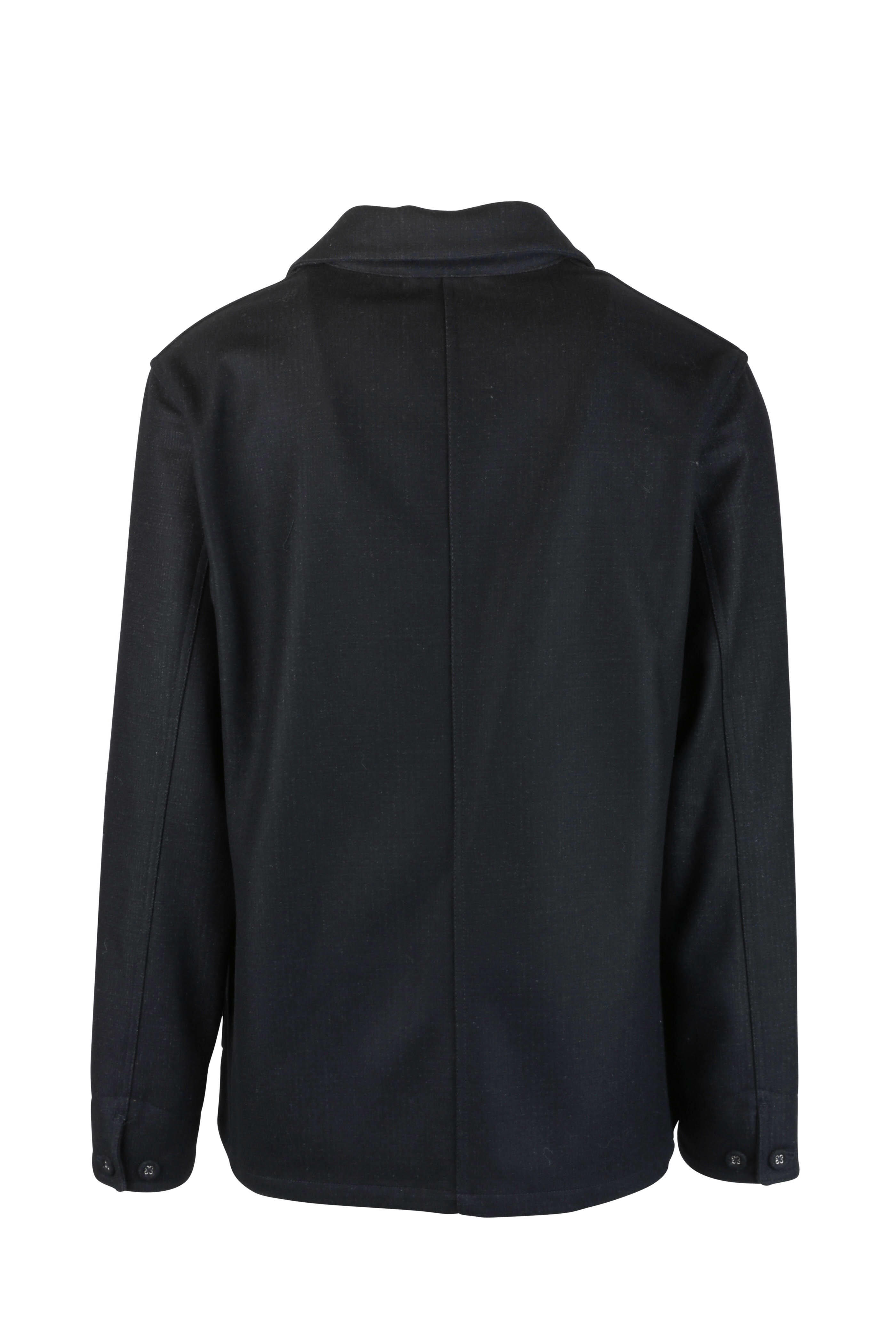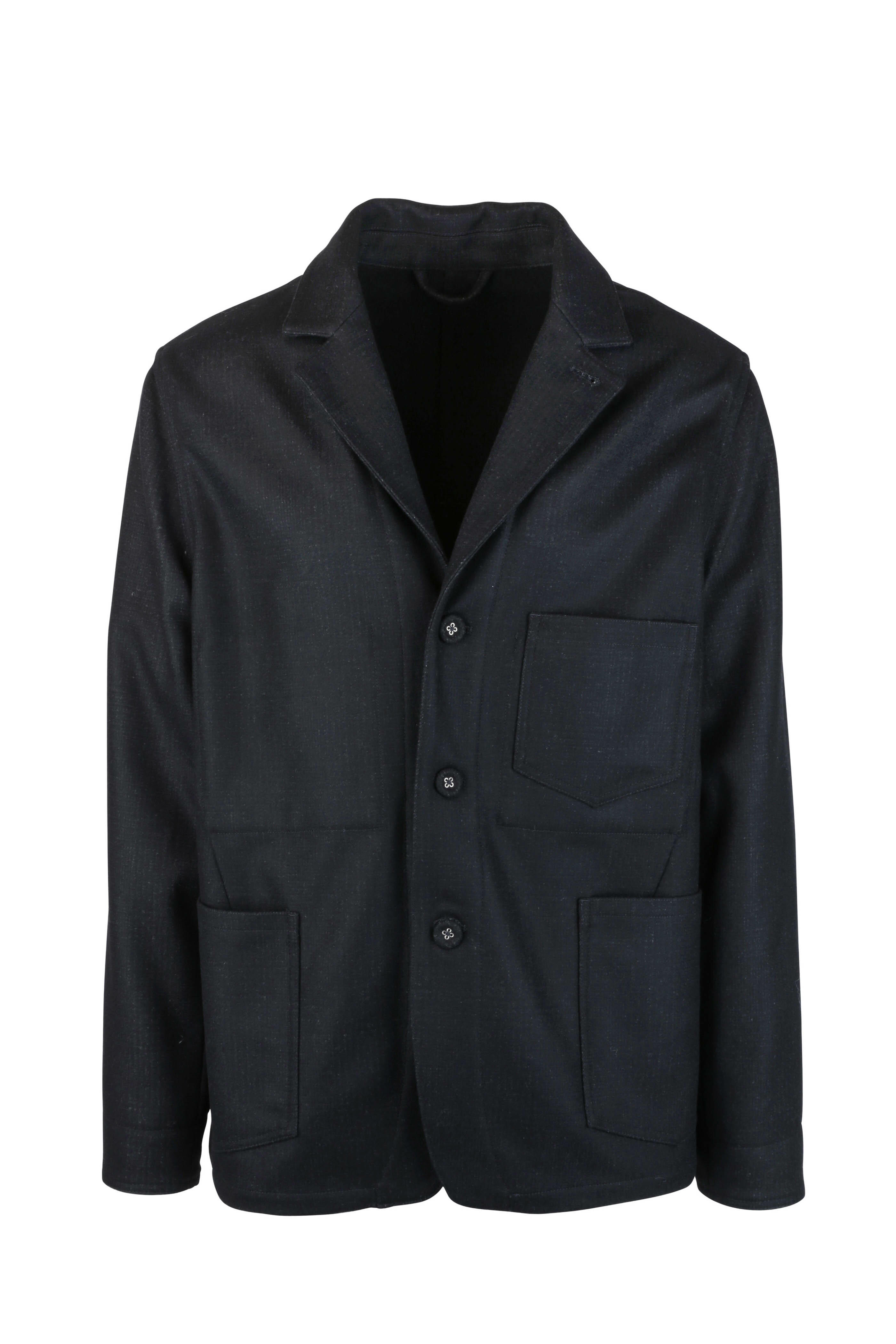 Notched lapels. Chest patch pocket, lower patch pockets. Button closure. Made in Portugal. 73% wool, 15% nylon, 12% polyester. Dry clean.