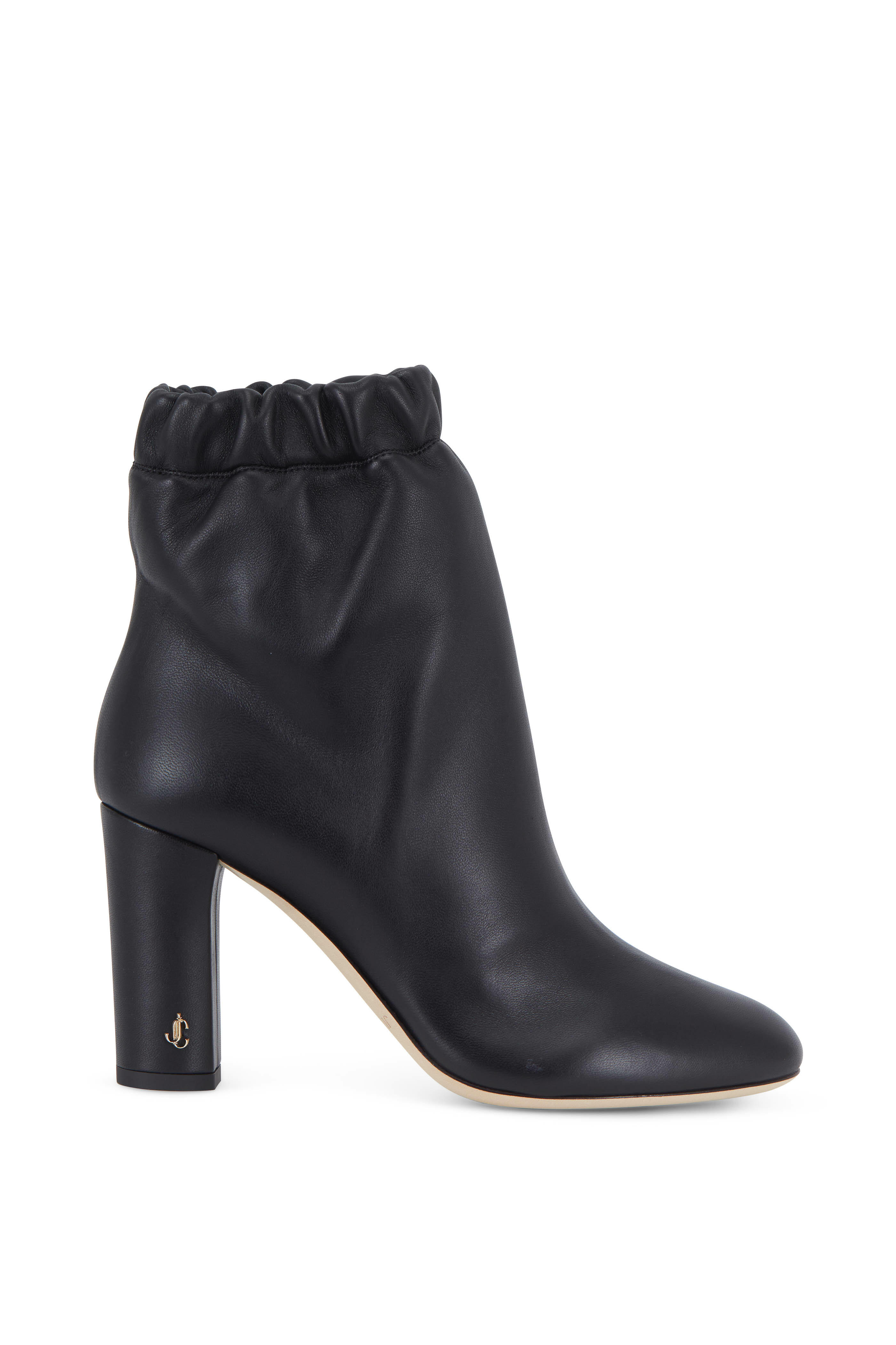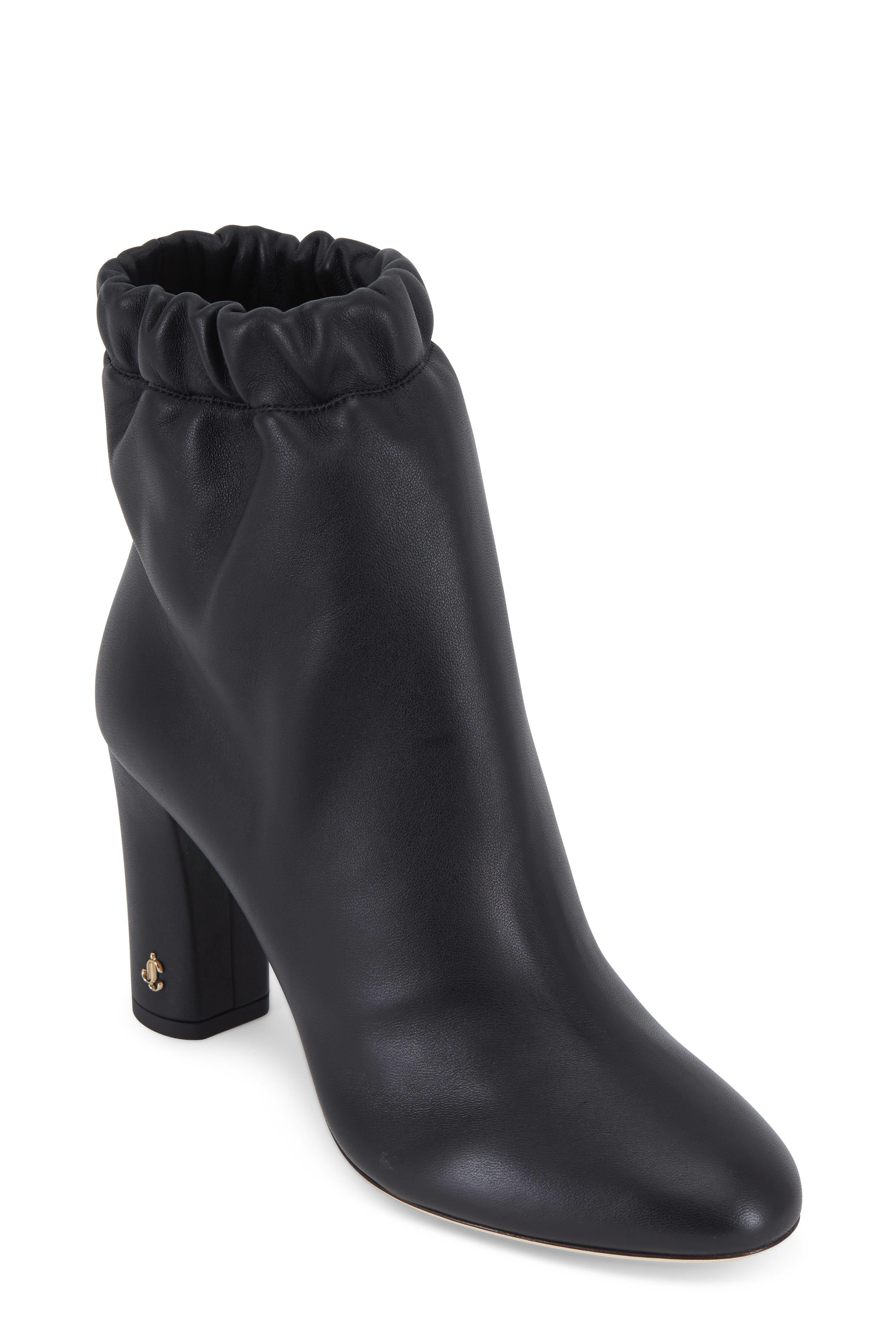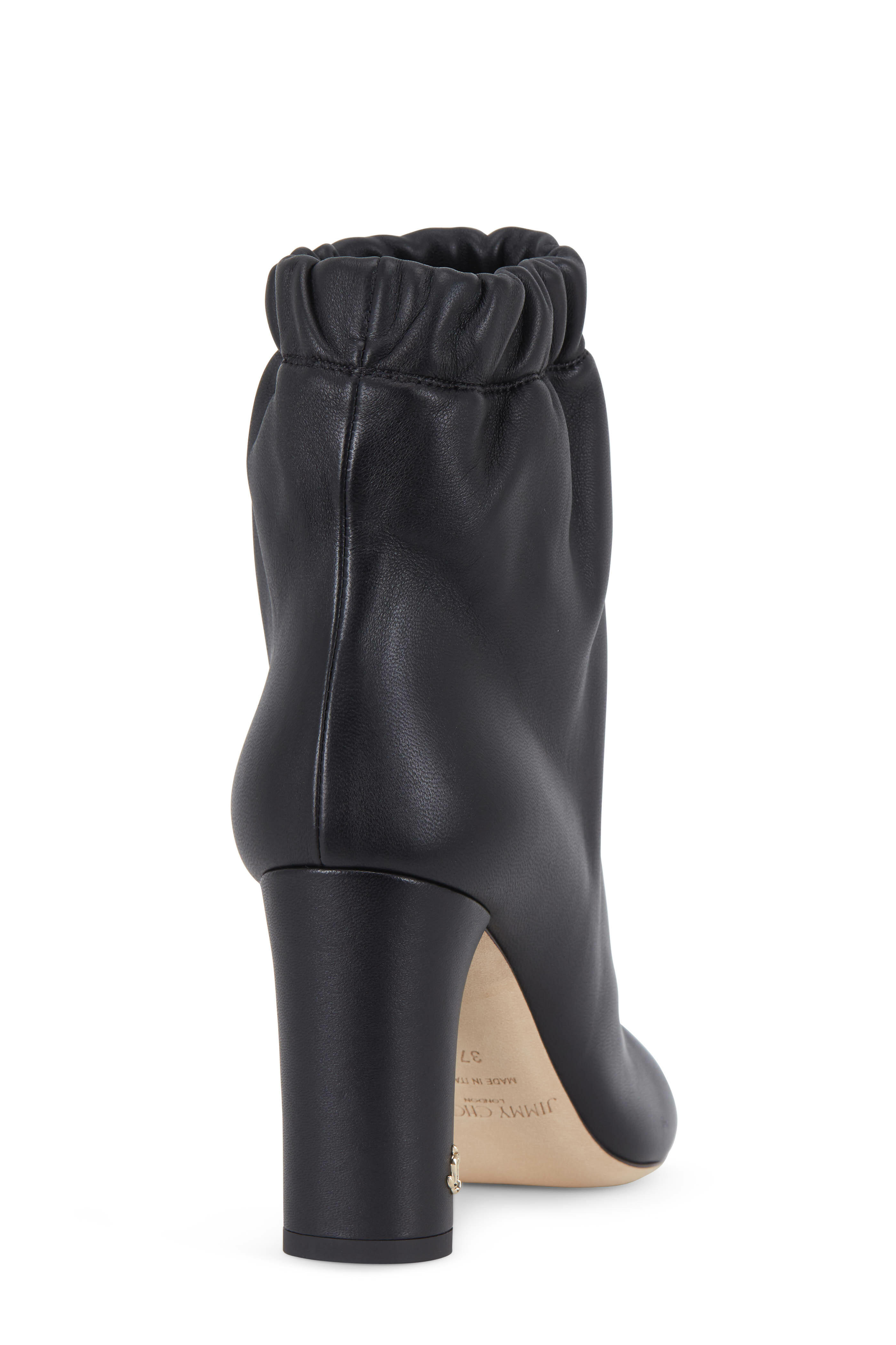 Nappa leather upper. Tapered toe. Pull-on style. Elasticized scrunch topline. Leather lining and insole. Self covered block heel. Leather sole. Made in Italy. Heel measurement: 85mm (3 ½").