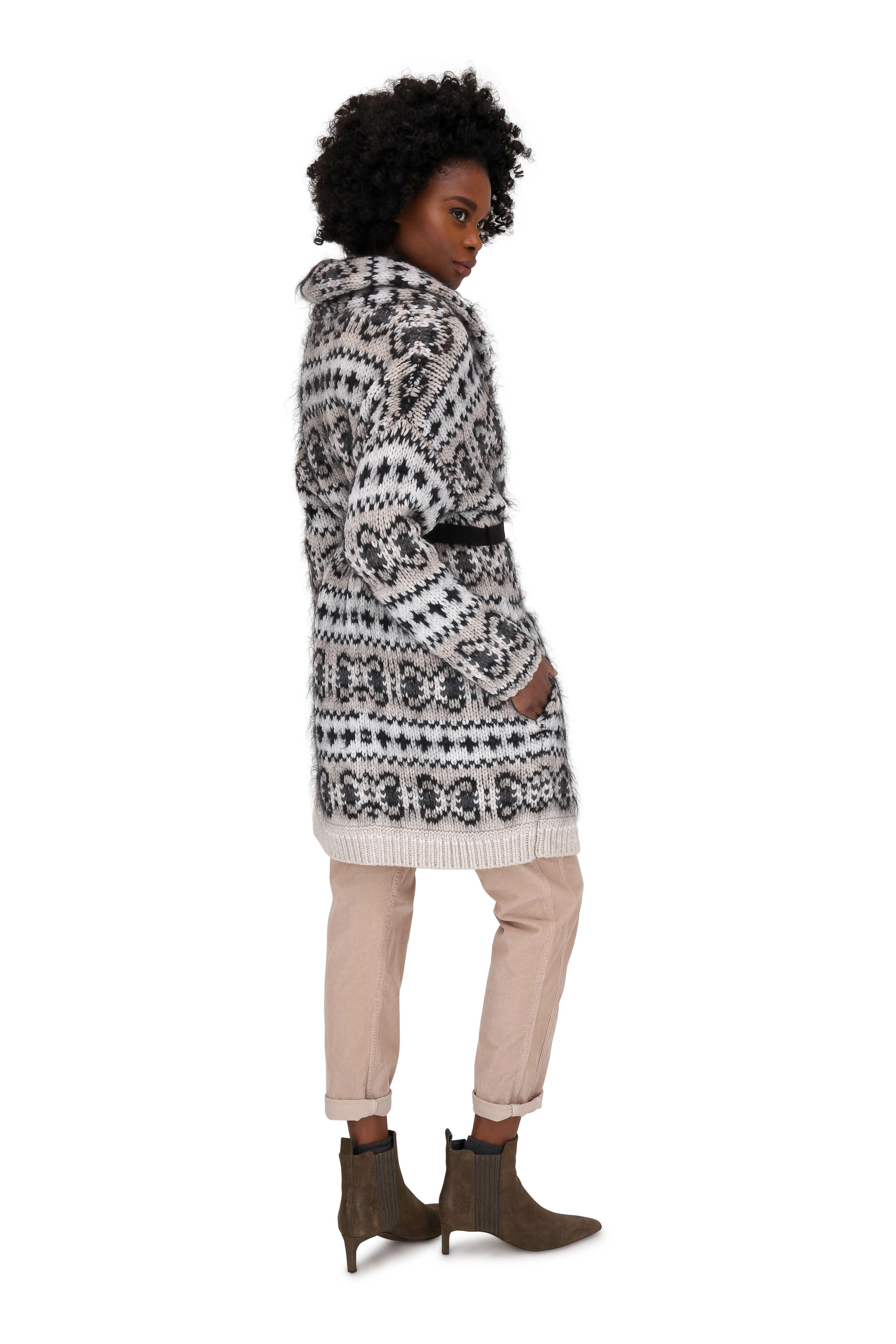 Shawl collar. Double breasted concealed closure. Detachable grosgrain ribbon belt. Side seam pockets. Ribbed trim. Made in Italy. 86% cashmere, 12% mohair, 2% nylon. Hand wash.