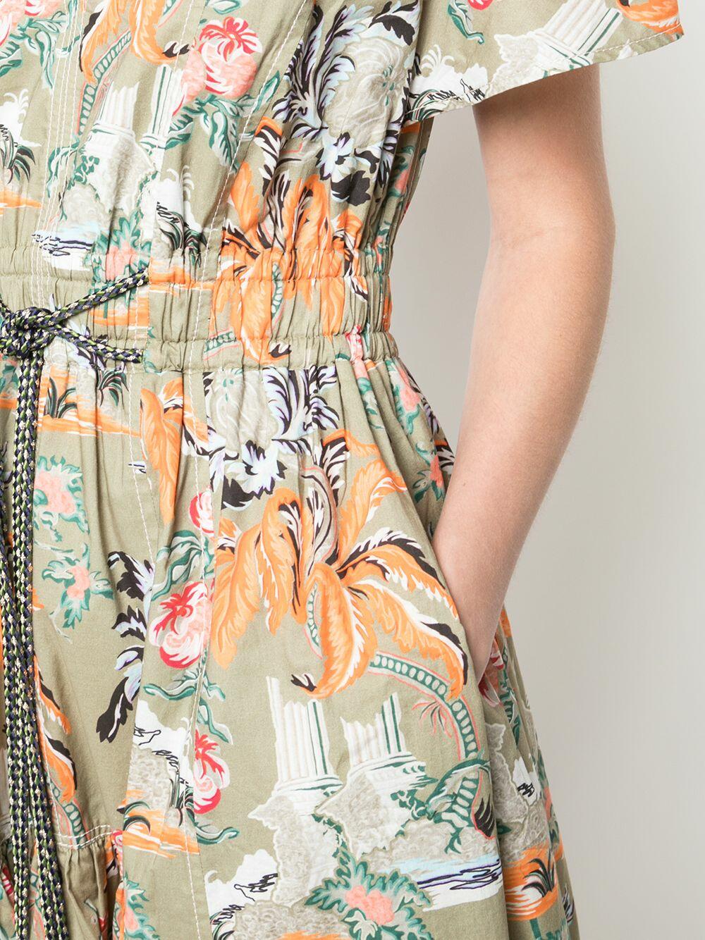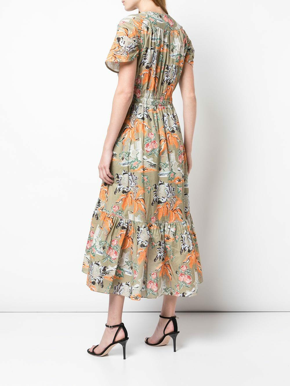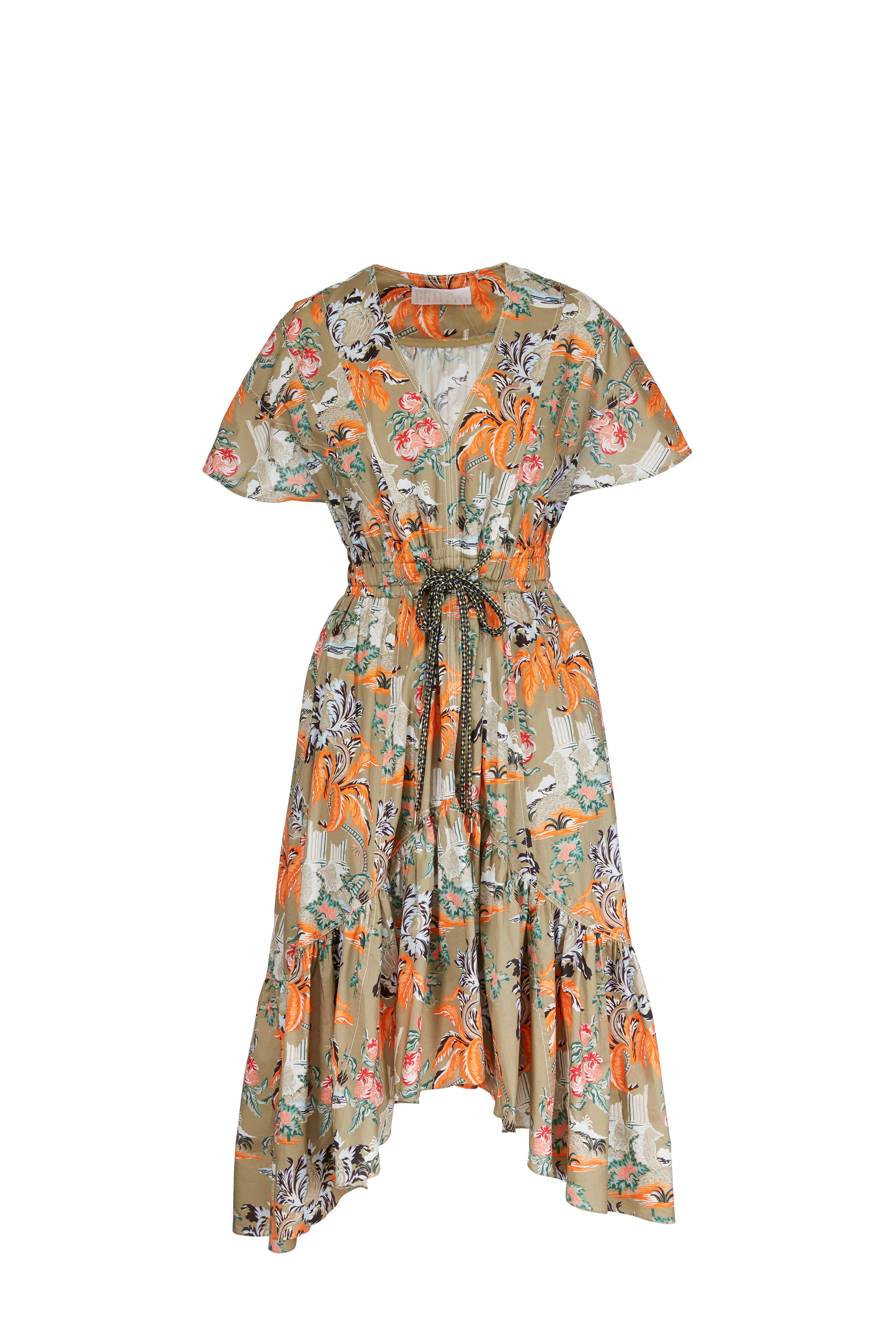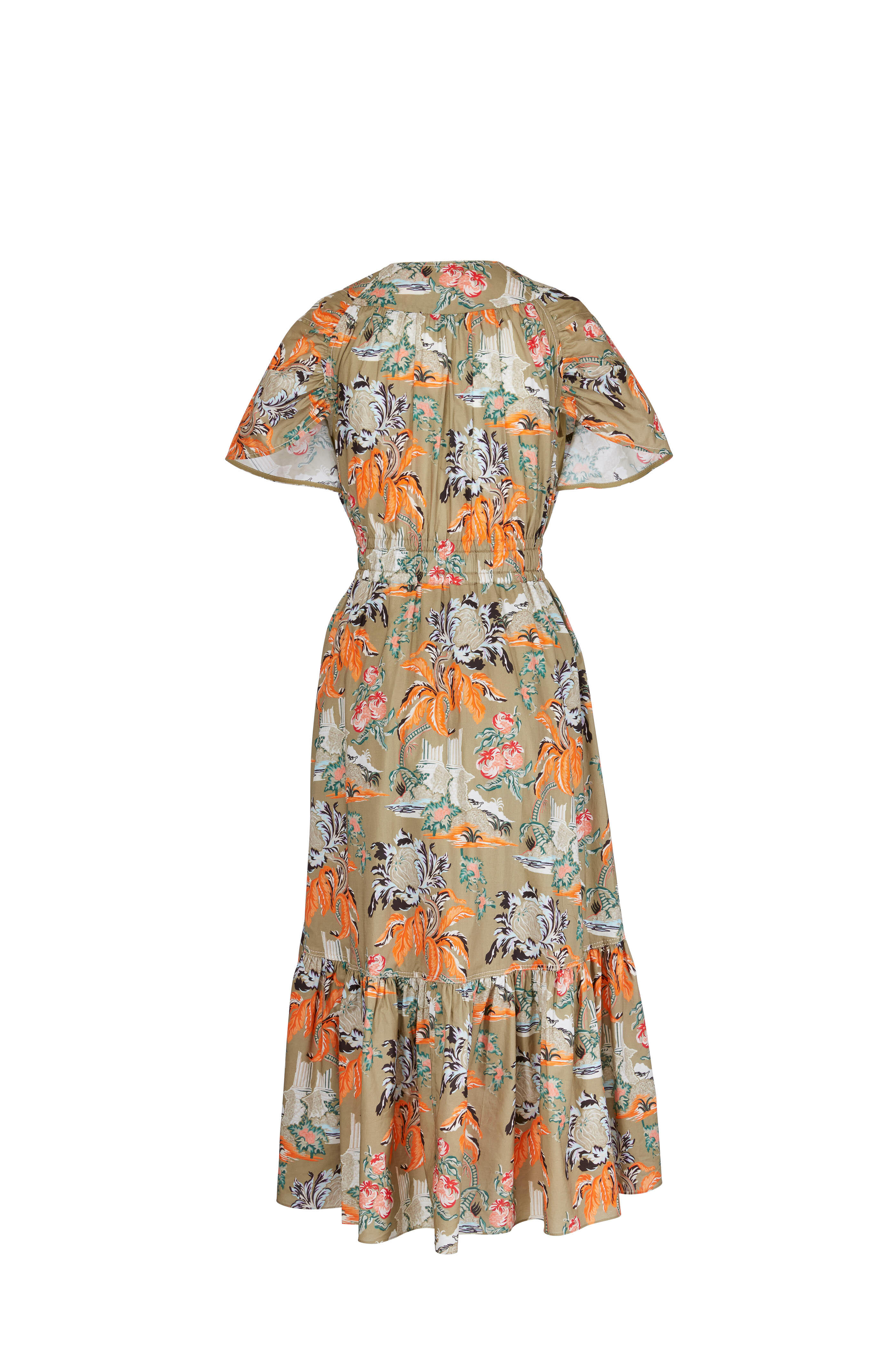 Khaki Cotton Floral Short Sleeve Gathered Dress