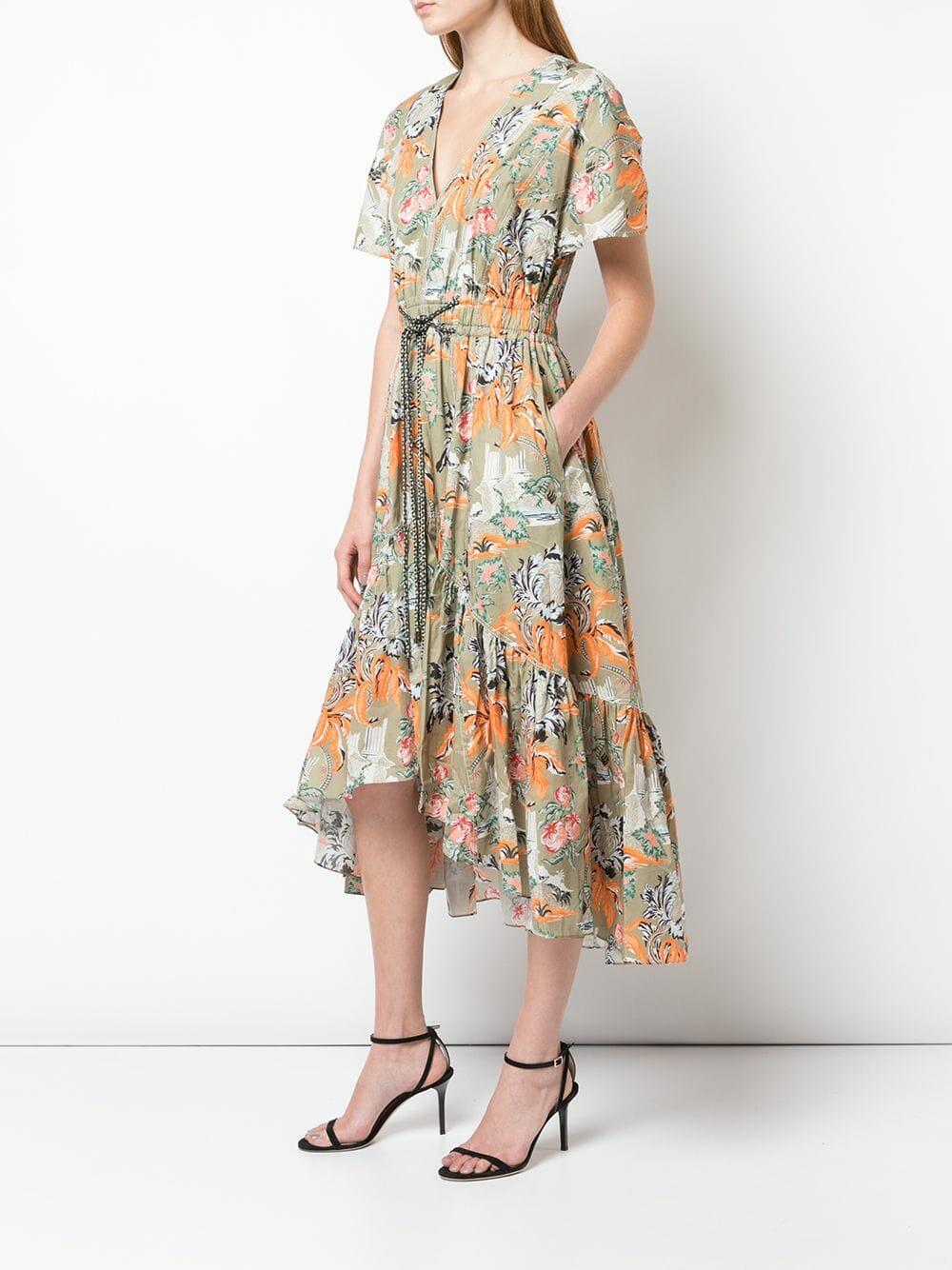 V-neckline. Cap sleeves. Side slip pockets. Ruffled high-low hem. Imported. Shoulder to hem: 51". 100% cotton; fully lined. Dry clean.