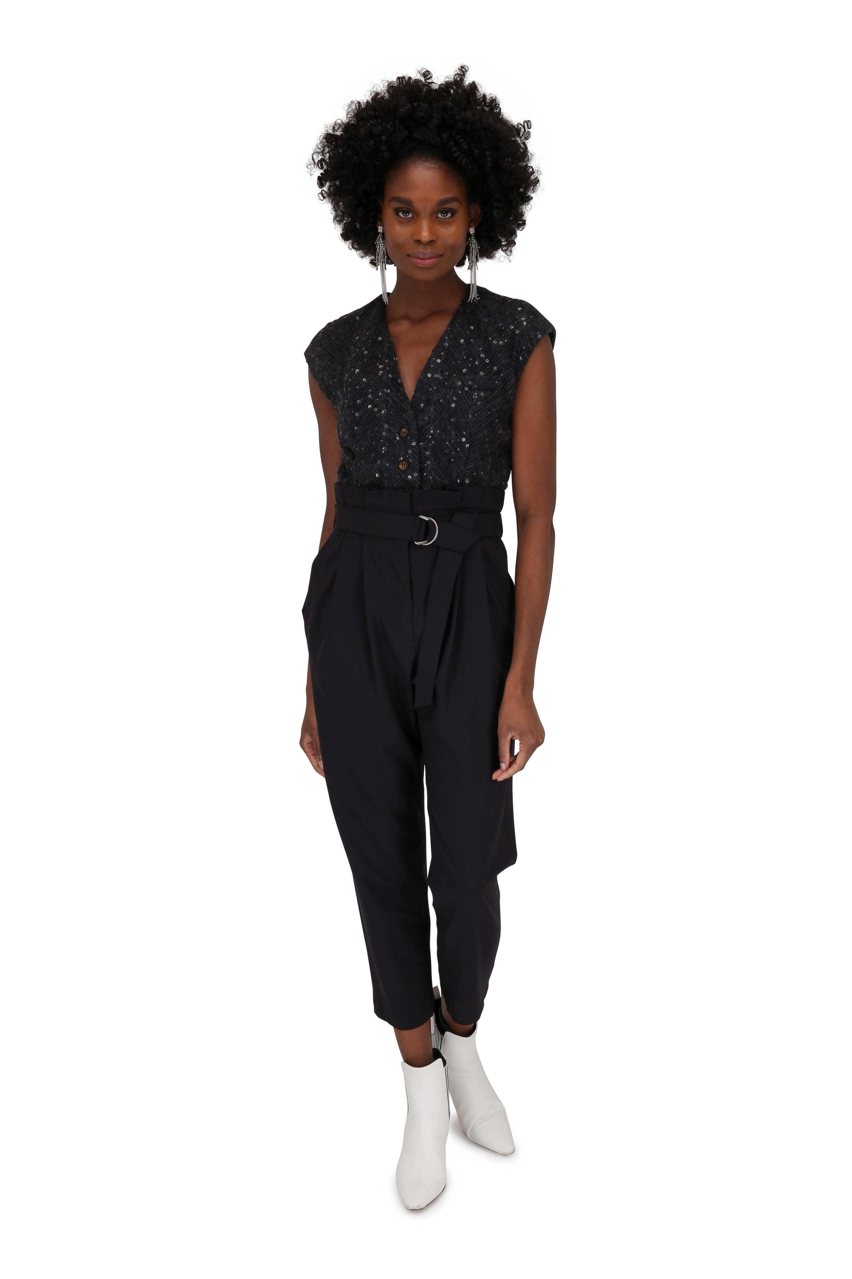 Draped v-neckline. Concealed front button placket; front zip; attached self d-ring belt. Cap sleeves. Chest welt pocket; lower slip pockets; back welt pockets. Paperbag waist. Paillette detailing. Made in Italy. 76% wool, 22% polyamide, 2% elastane. Dry clean.