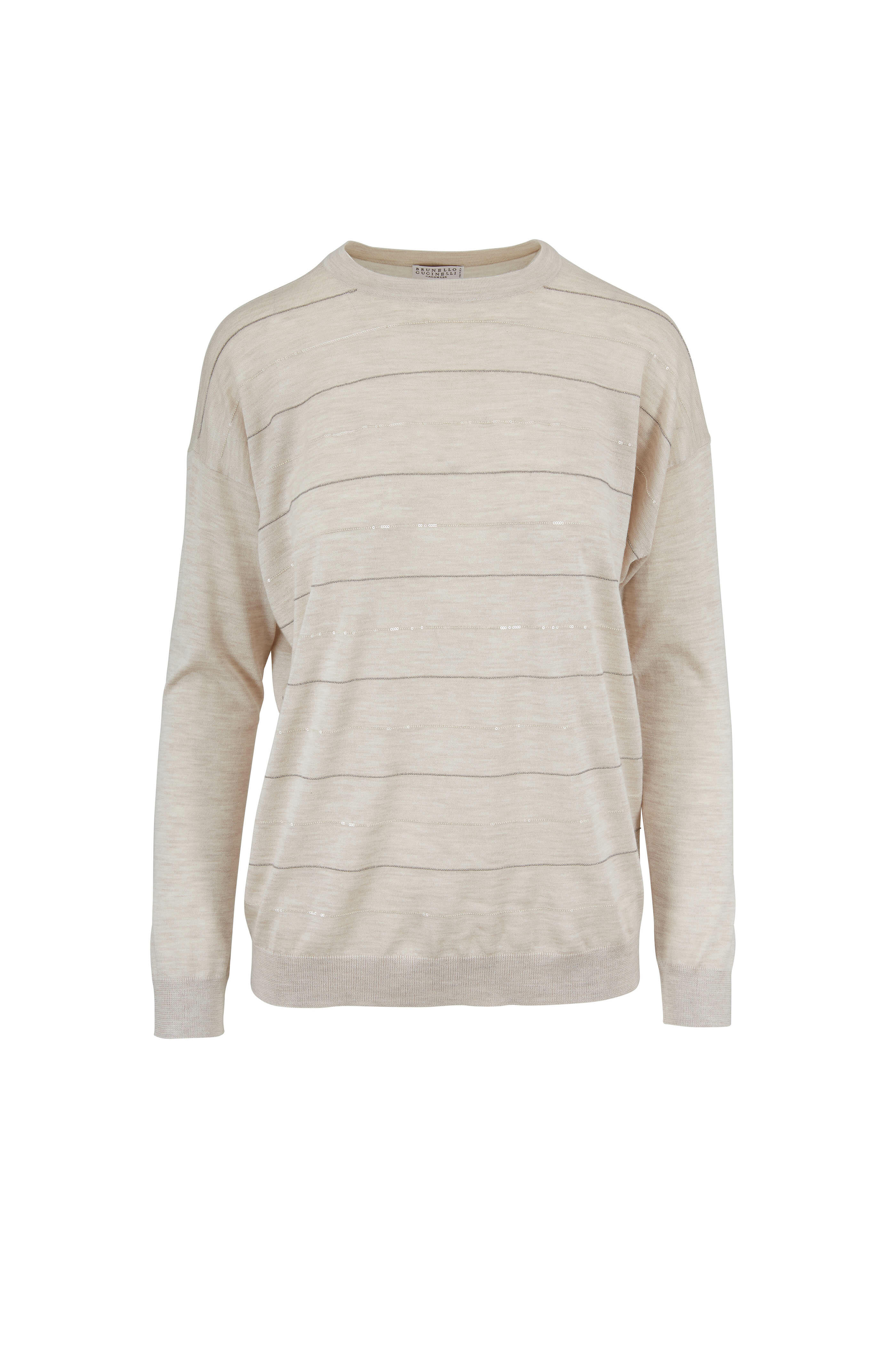 Crewneck. Ribbed trim. Alternating monili and pialette stripe detailing. Made in Italy. 70% cashmere, 30% silk. Hand wash.