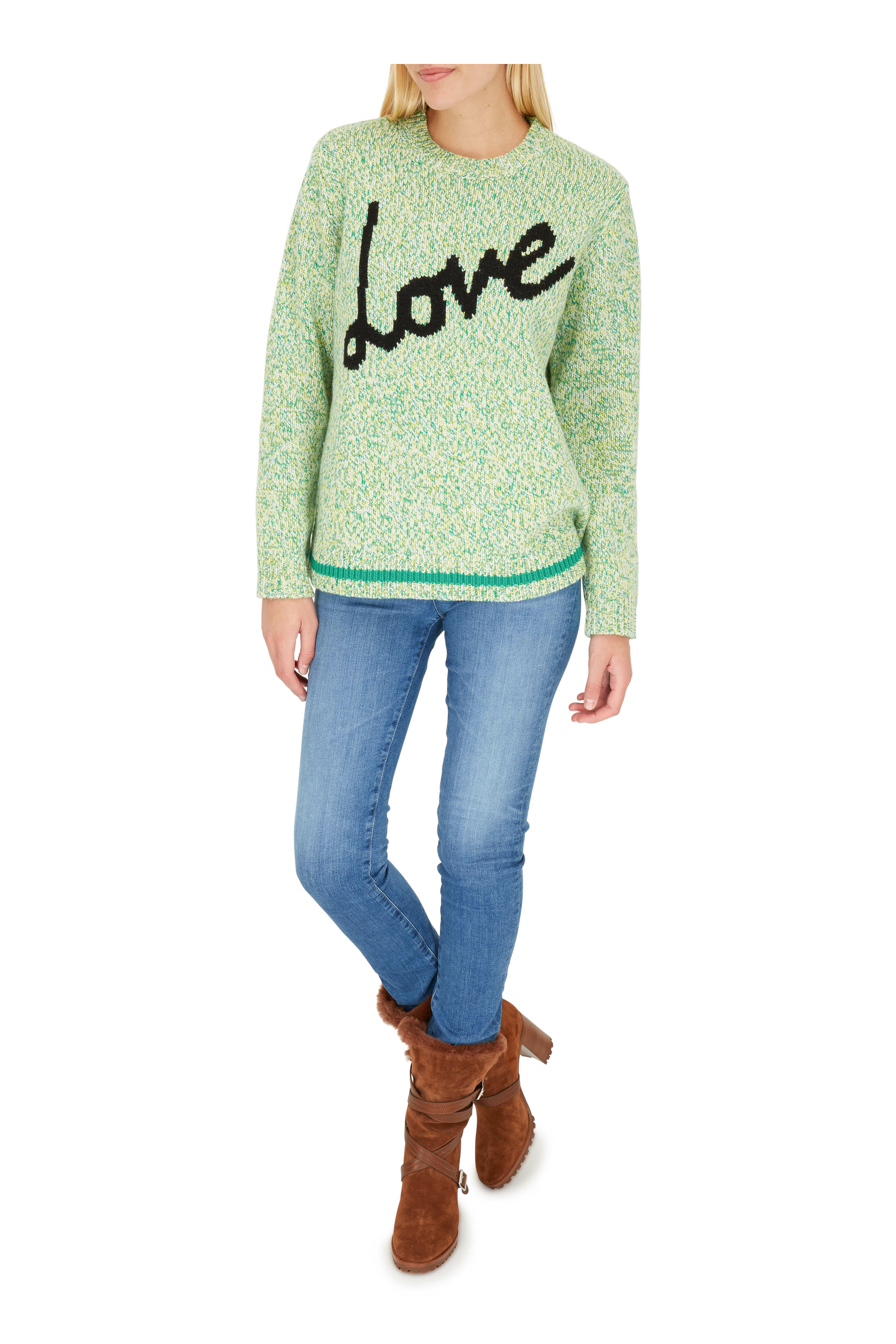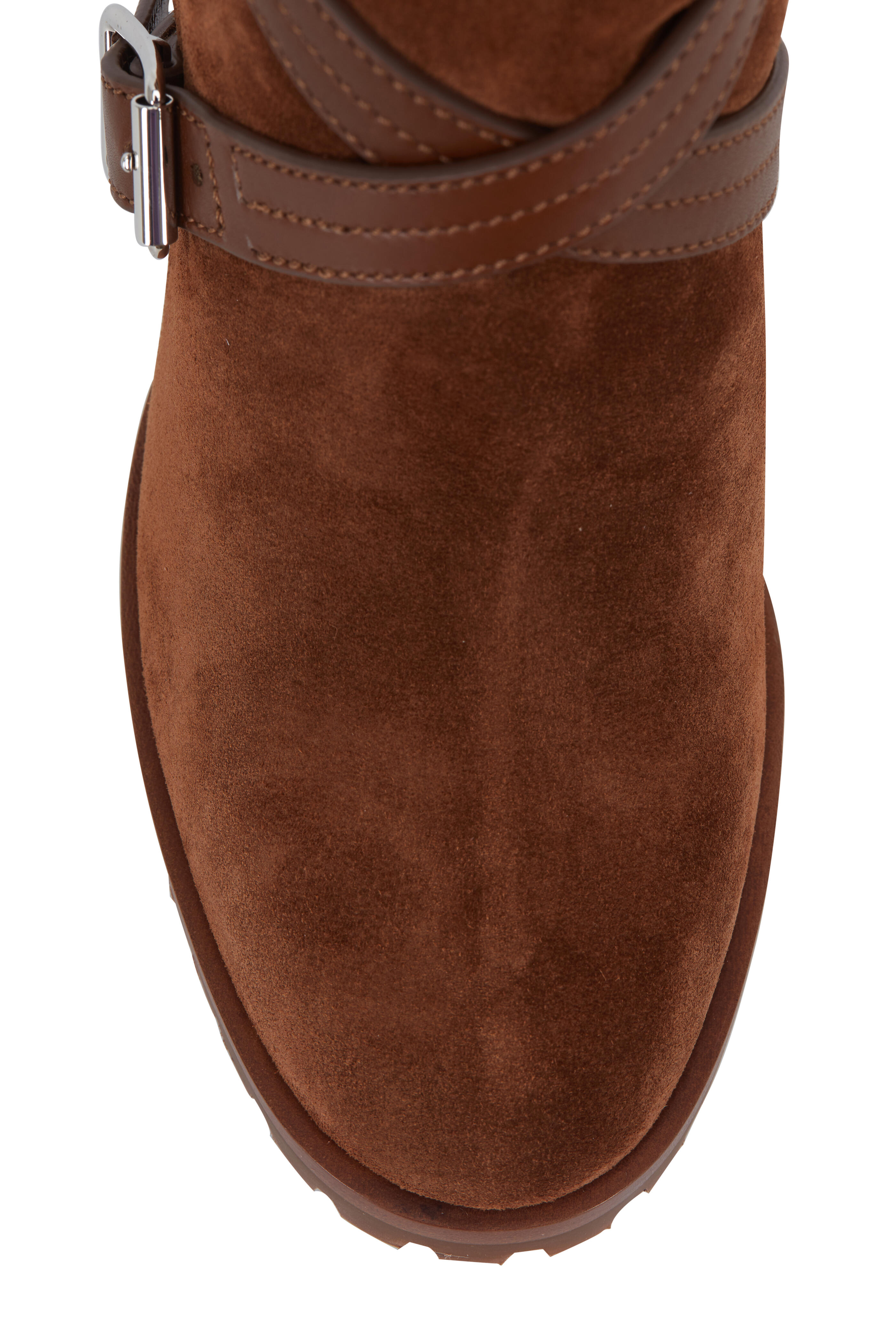 Calfskin suede and leather upper. Almond toe. Detachable criss-cross straps with adjustable buckles. Lined in genuine shearling. Stacked wooden heel. Lug rubber sole. Made in Italy. Heel measurement: 85mm (3 ½"). Shaft: 7".