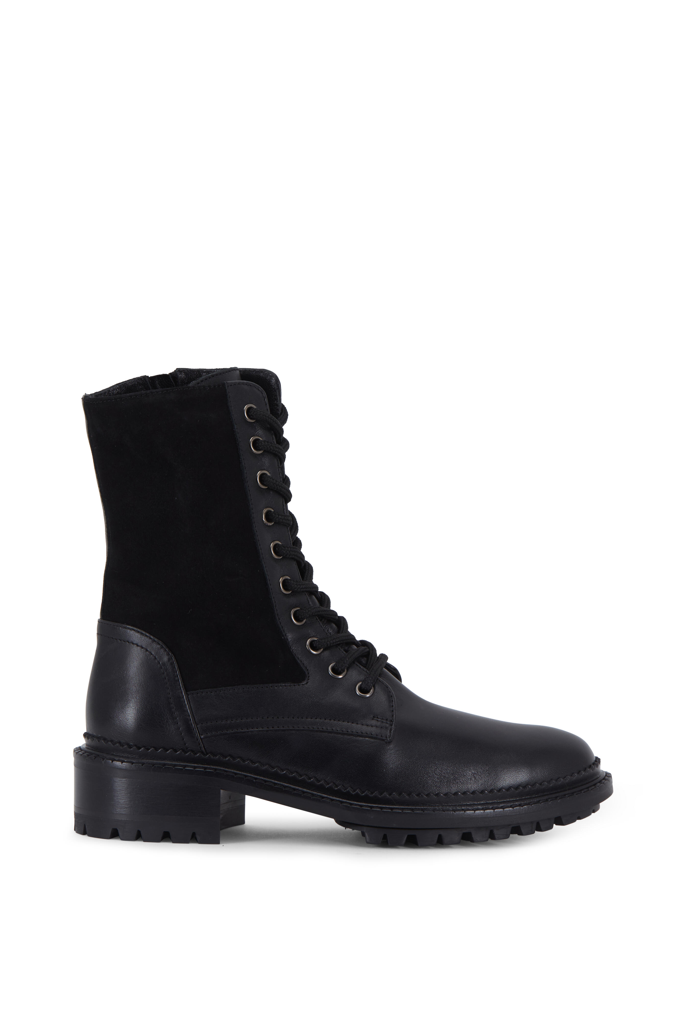 Weatherproof leather and stretch suede upper. Almond toe. Lace-up closure. Side zip closure. Sock lining, cushioned insole. Stacked wooden heel. Lug rubber sole. Made in Italy. Heel measurement: 50mm (2"). Shaft: 7".