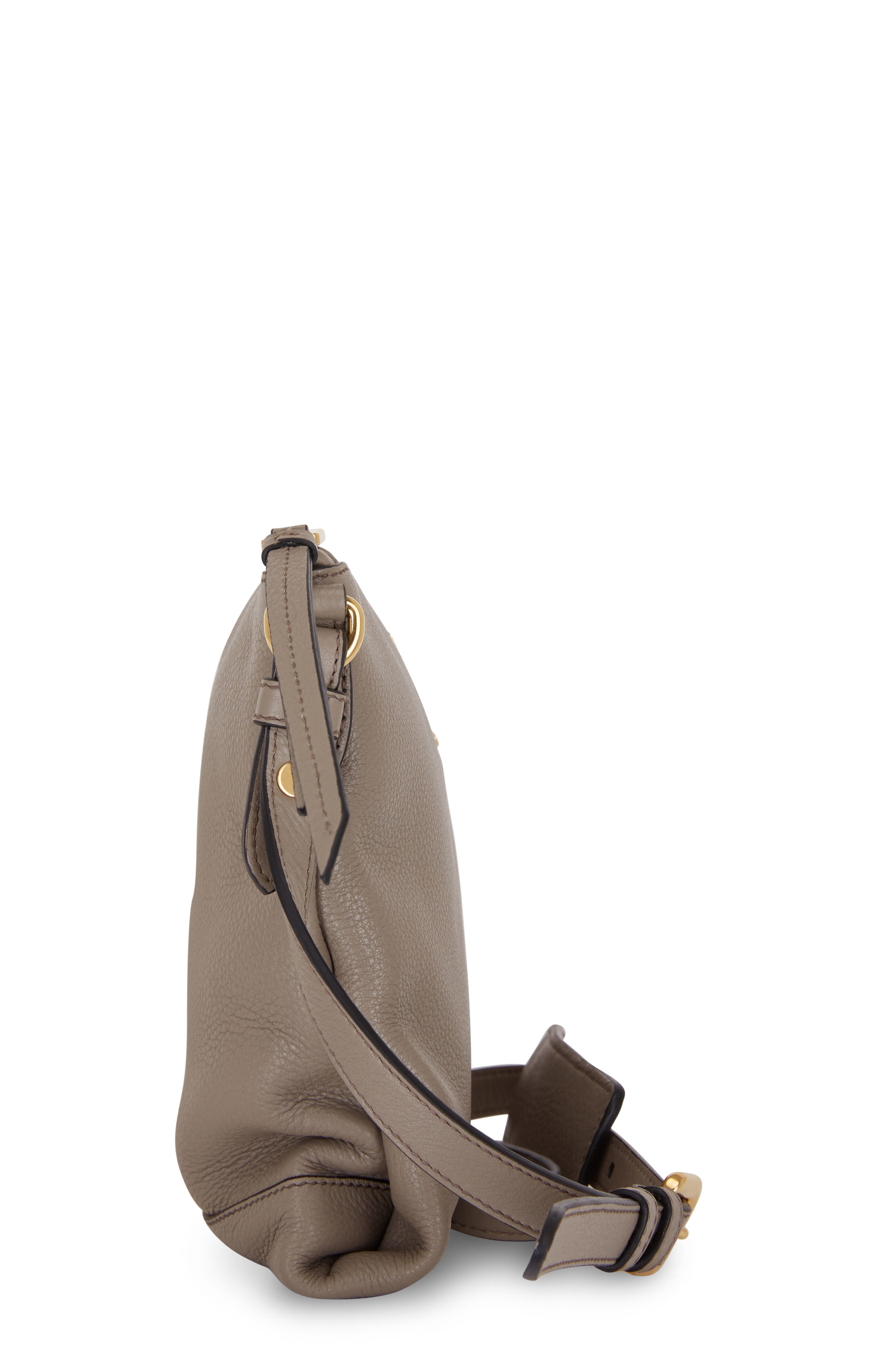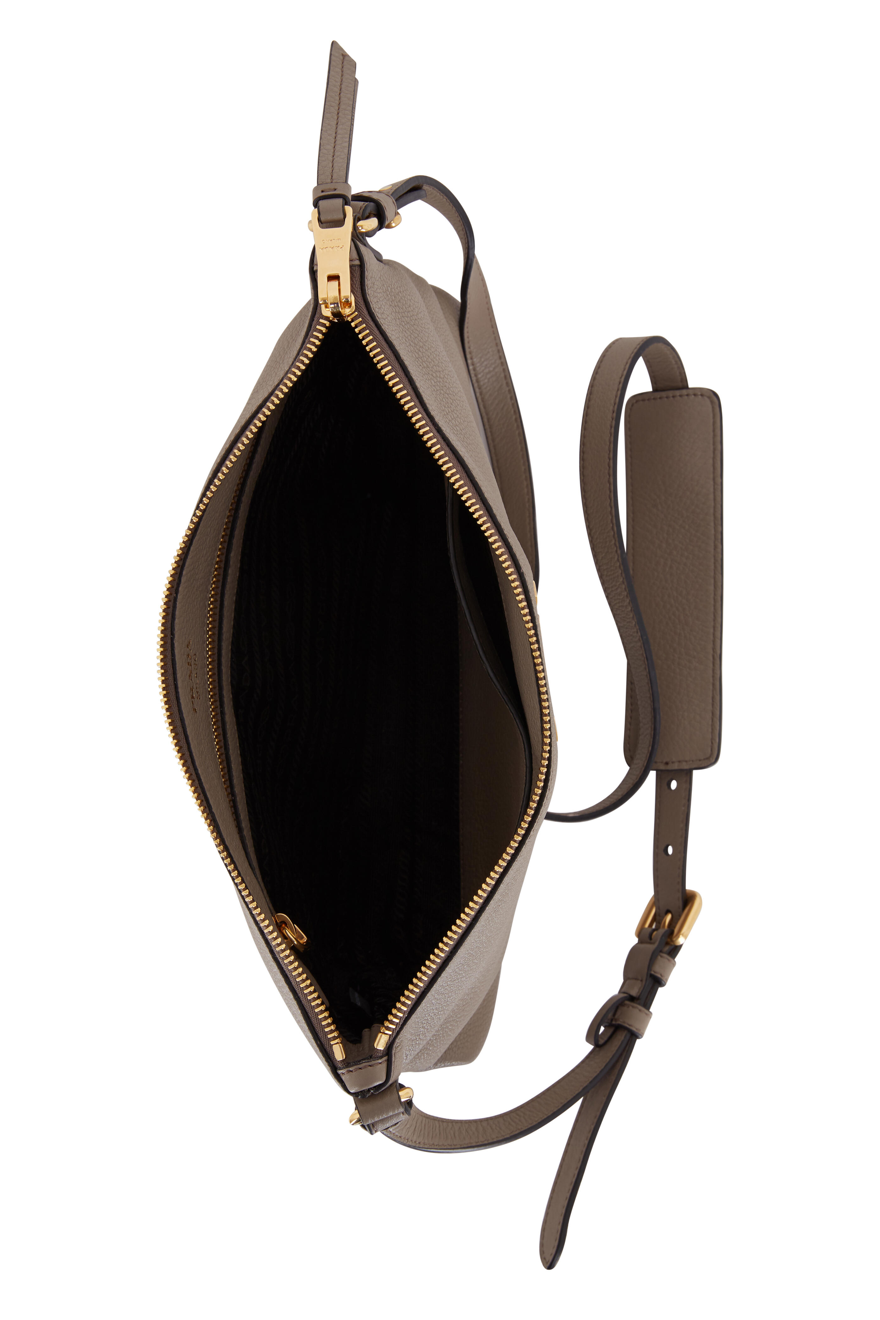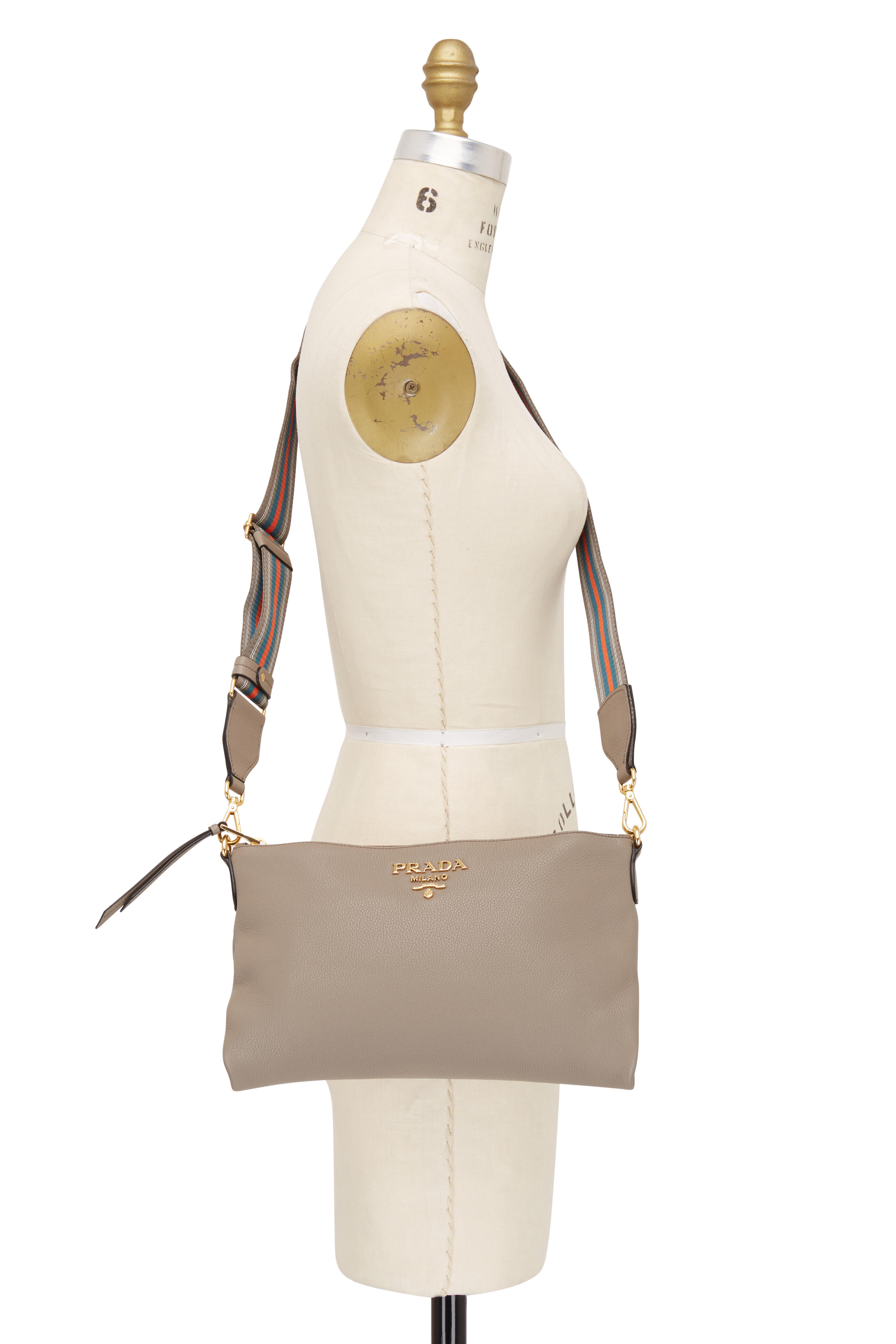 Vitello leather. Detachable and adjustable leather strap. Detachable and adjustable guitar strap. Top zip closure. One interior zip and one open pocket. Lined in signature logo textile. Made in Italy. Width: 11". Height: 8". Depth: 2". Strap drop: 20".