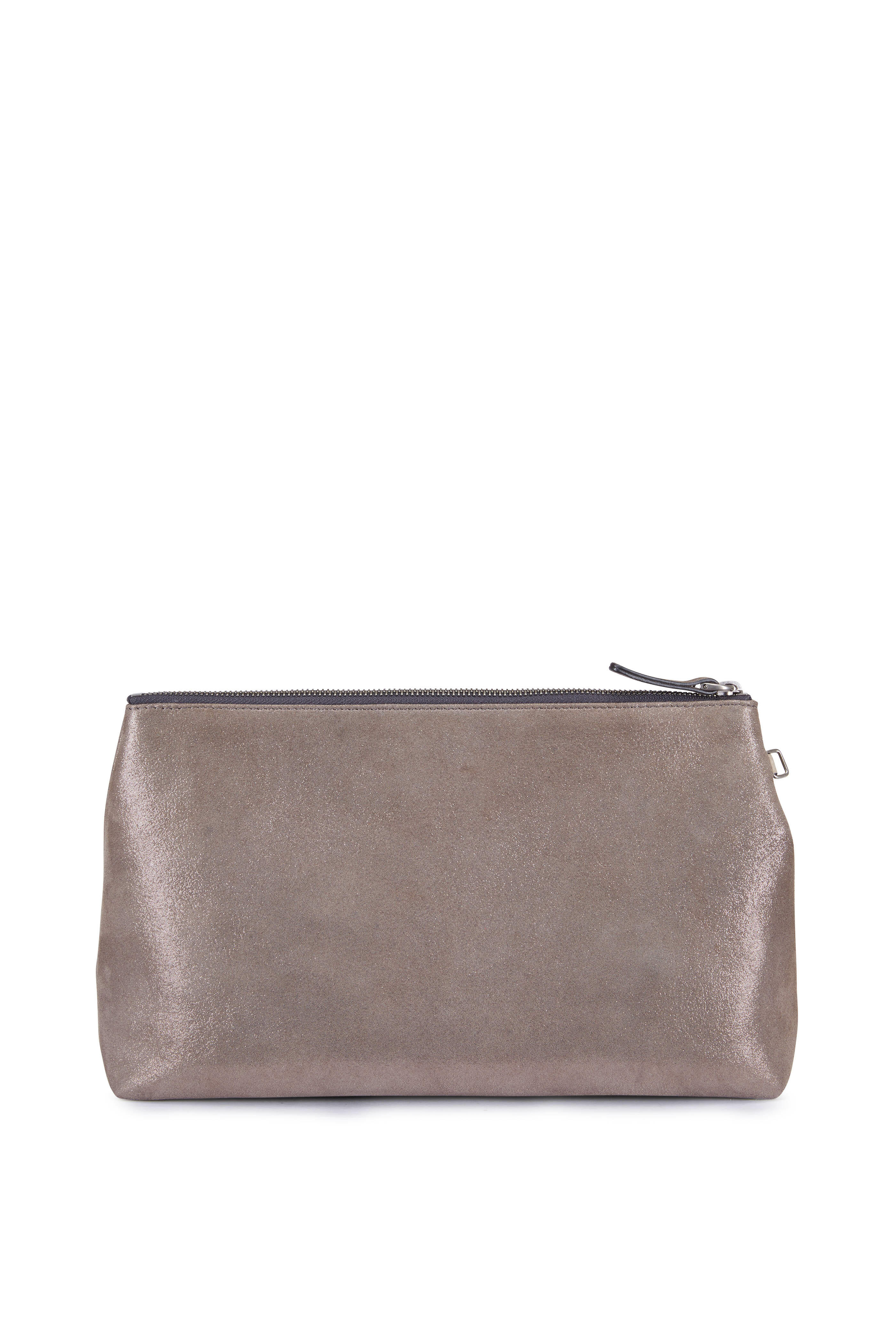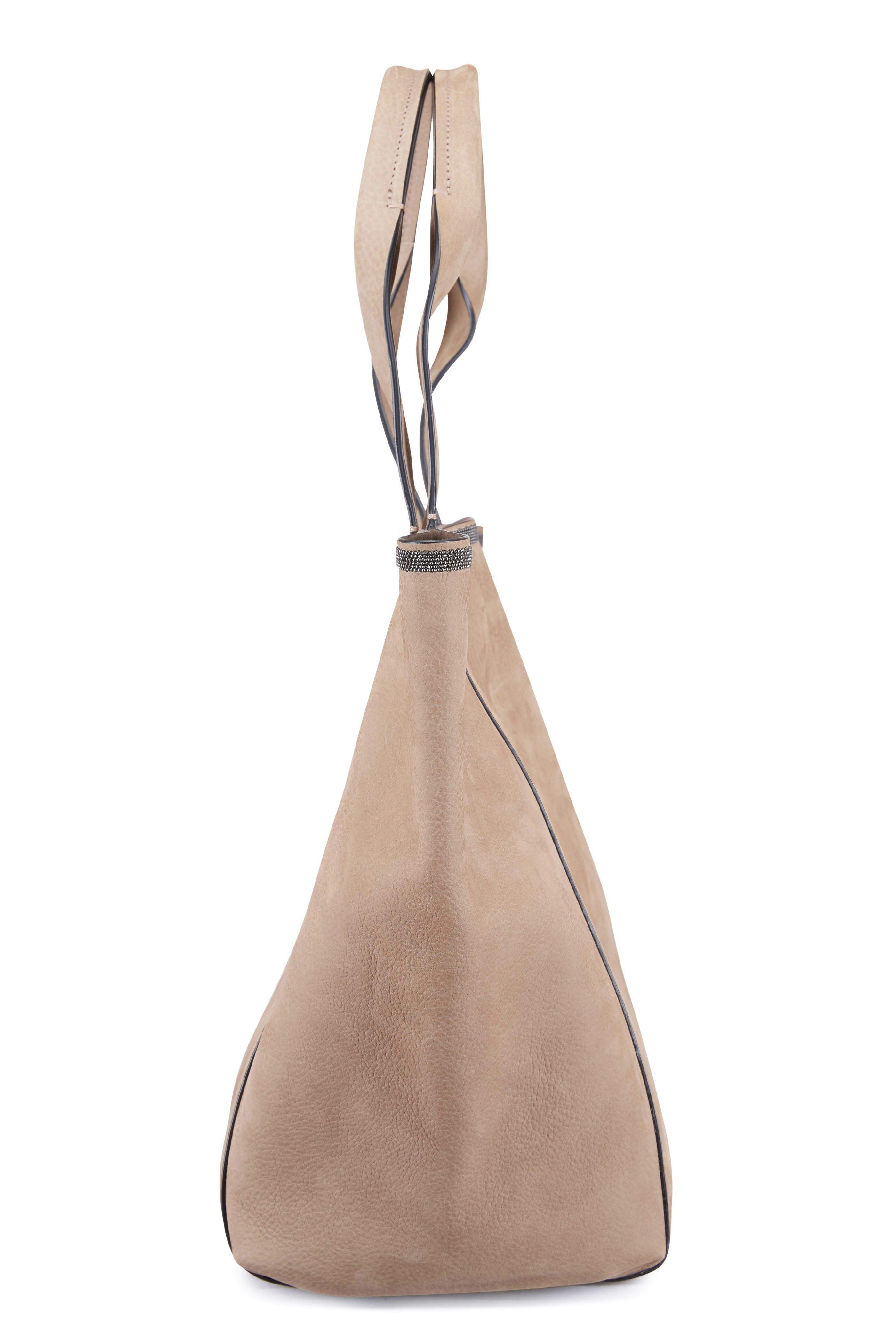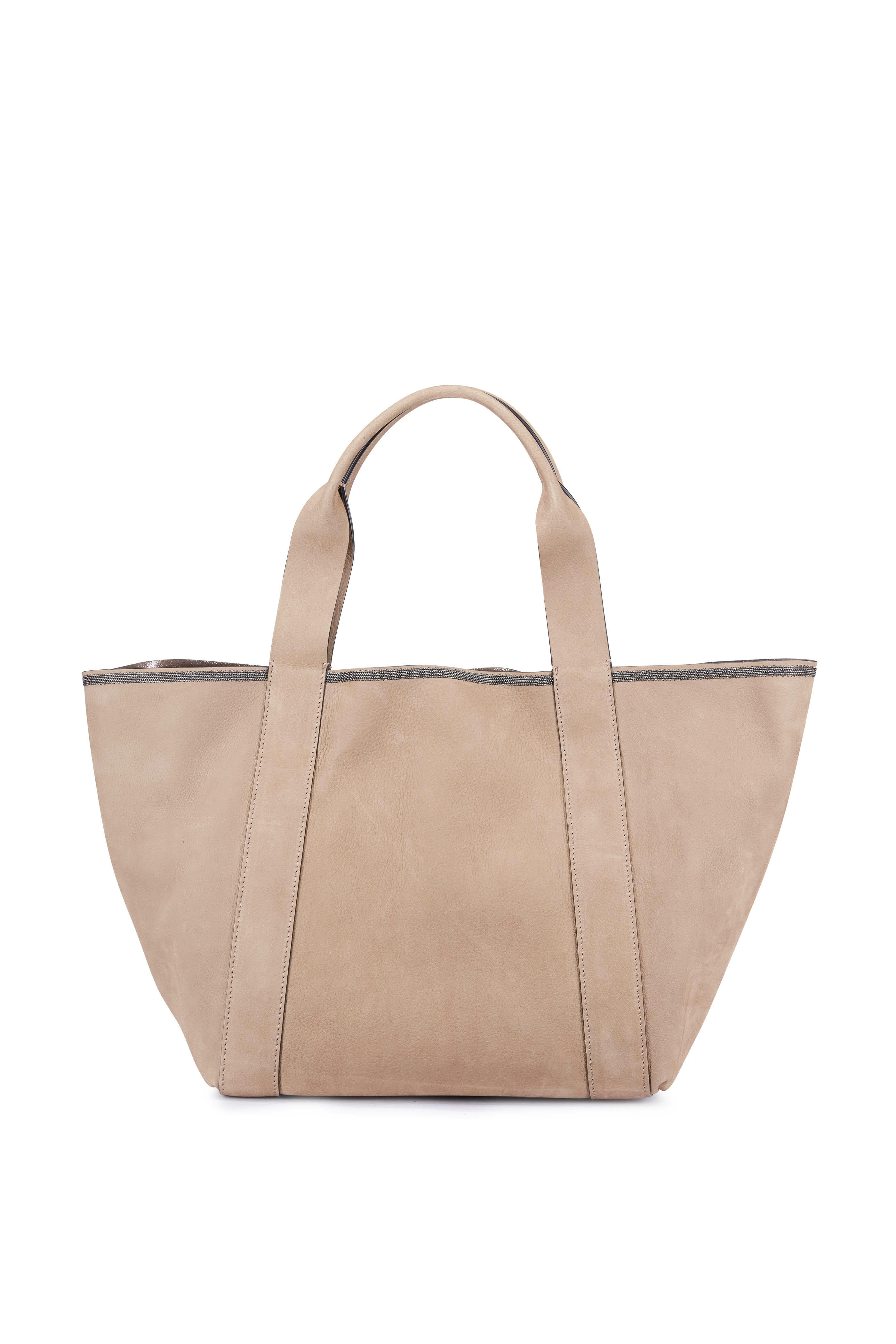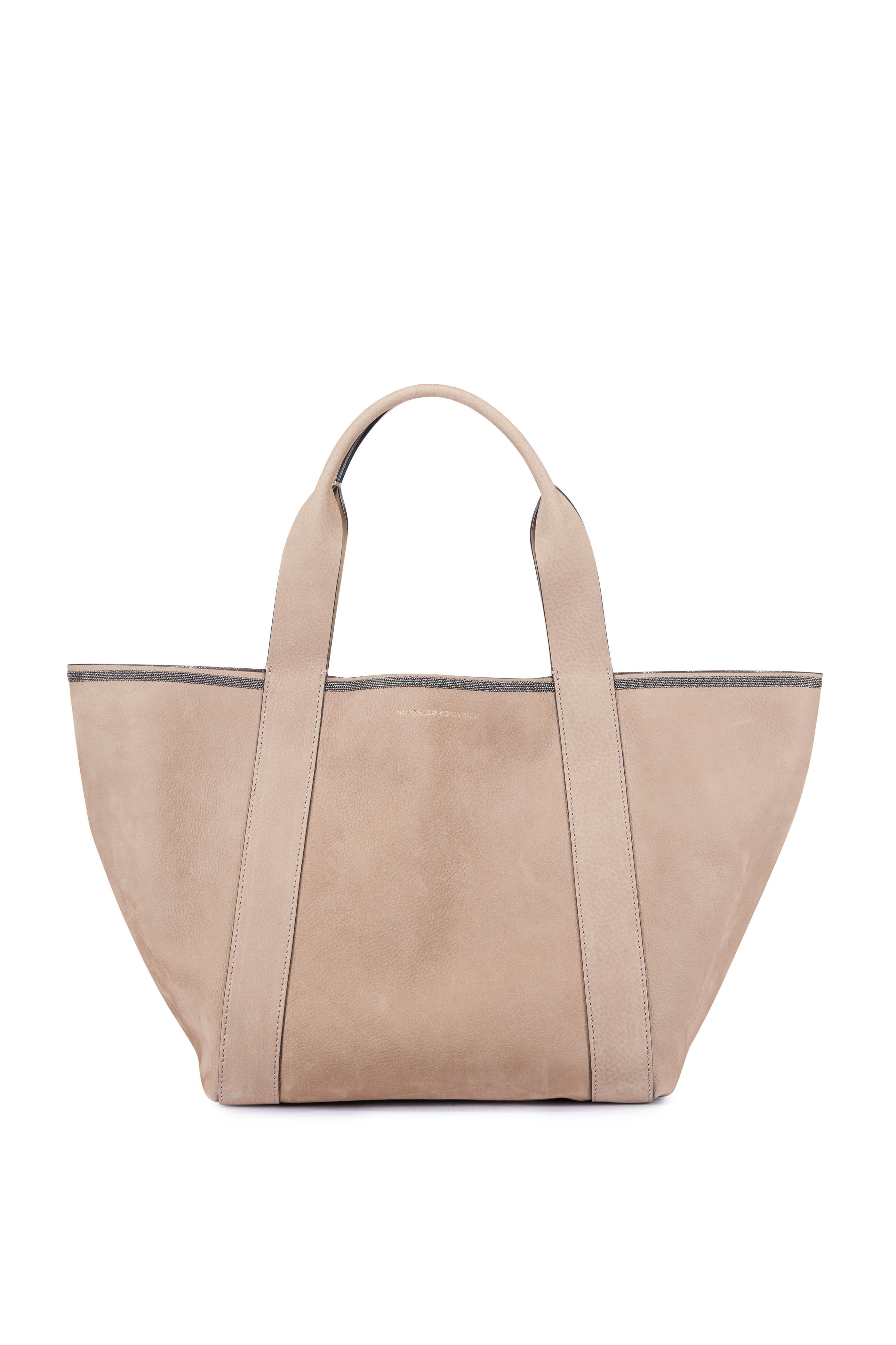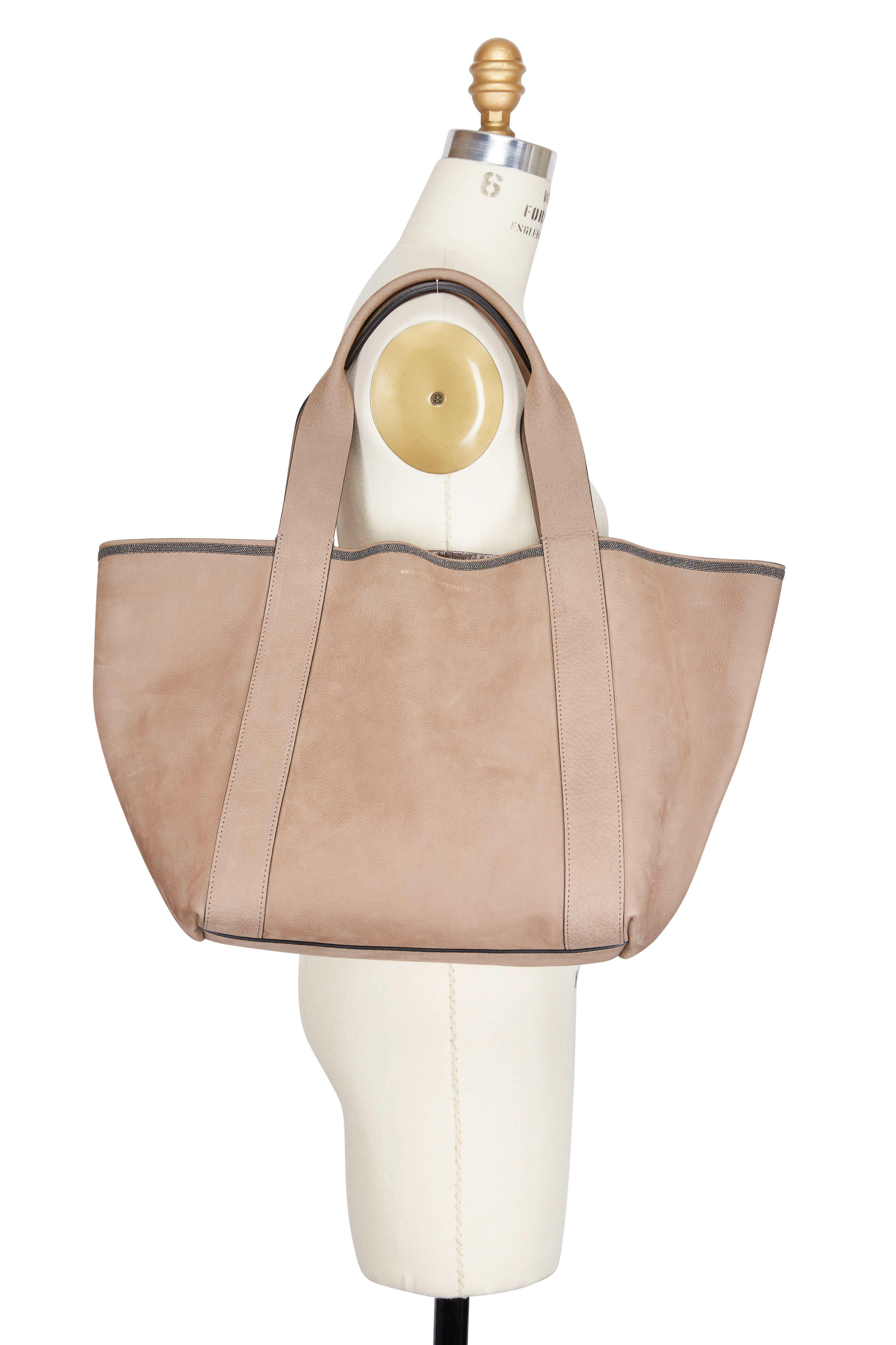 Suede leather. Padded top handles. Detachable zip pouch. Monili stripe detail. Shiny interior. Made in Italy. Width: 21". Height: 12. Depth: 7". Strap drop: 8".