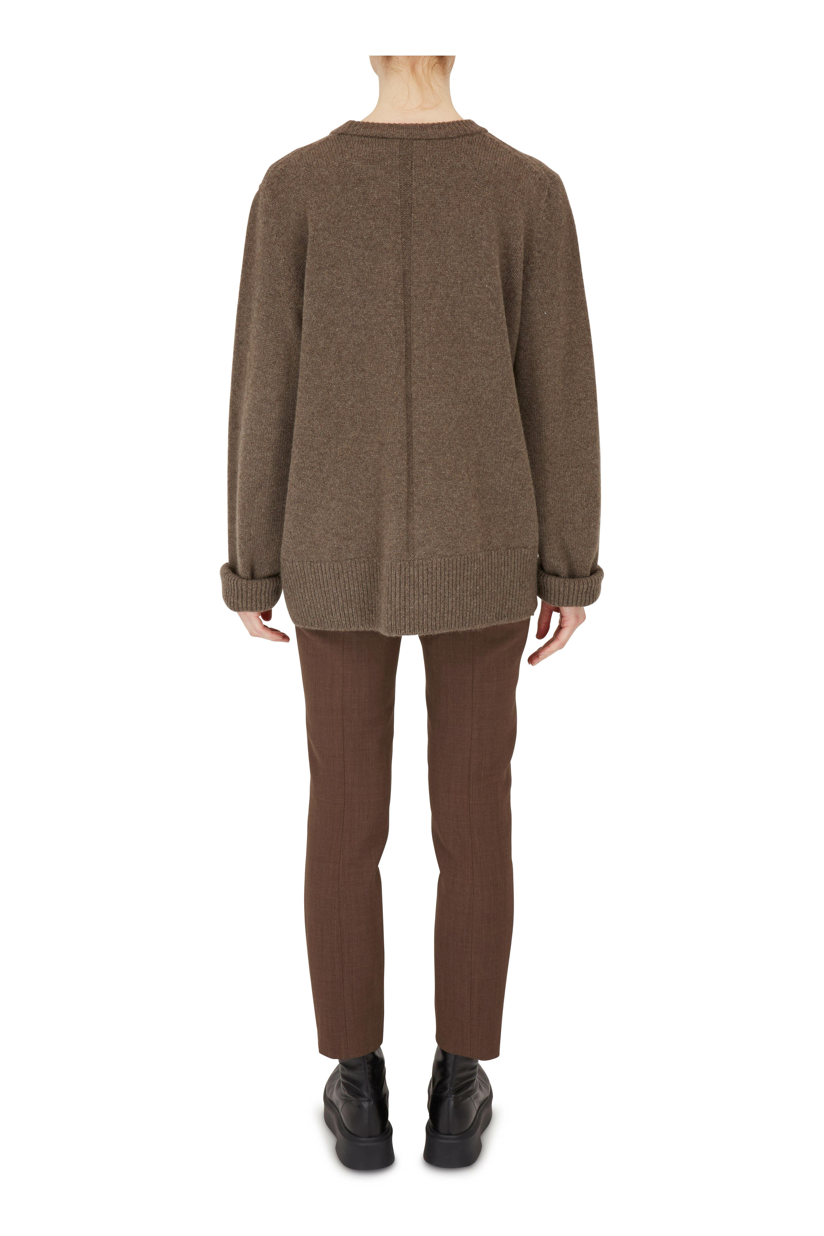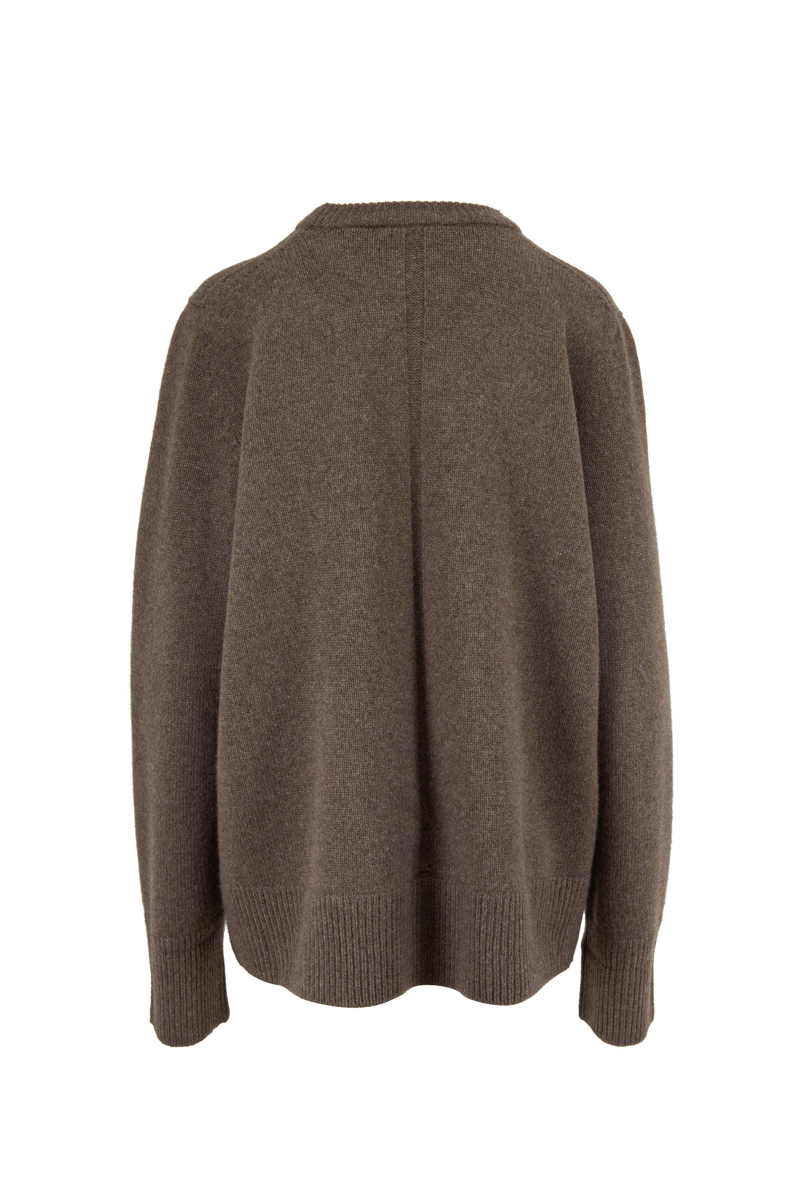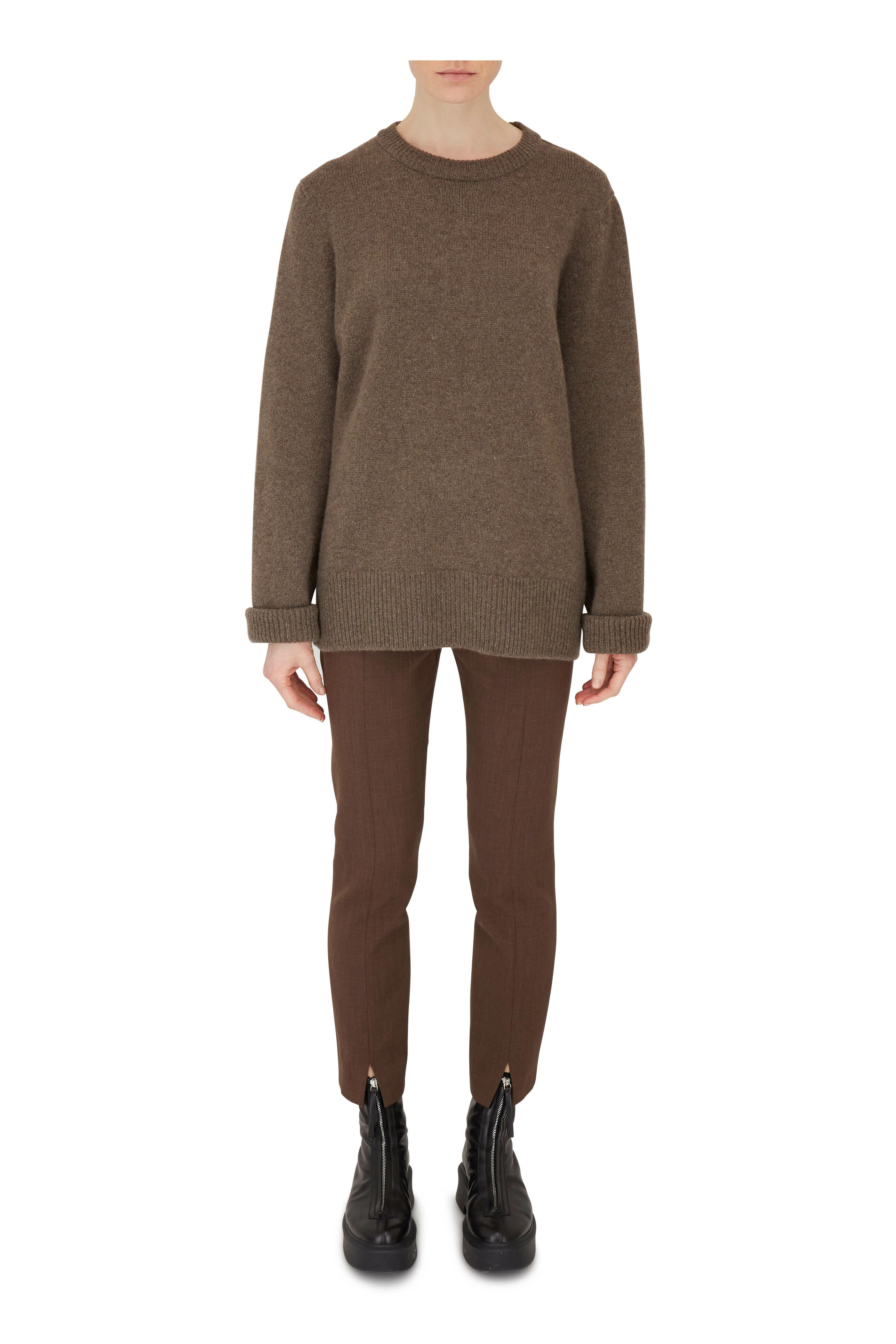 Crew neckline. Ribbed trim. Made in the USA. 65% wool 35% cashmere. Hand wash.