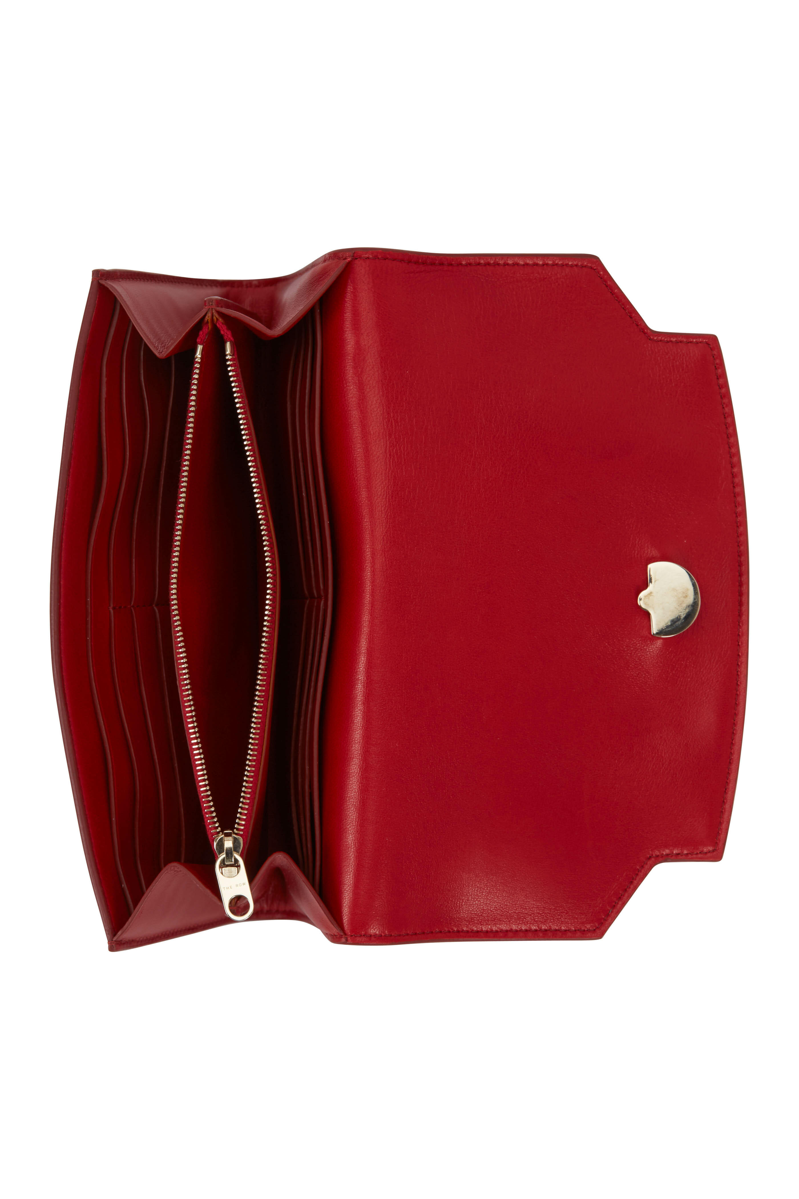 Leather. Flap front; front magnetic snap closure. Tonal top stitching. Interior zip compartment; twelve card slots; four open compartments. Leather lined. Made in Italy. Width: 8". Height: 4½". Depth: 1".