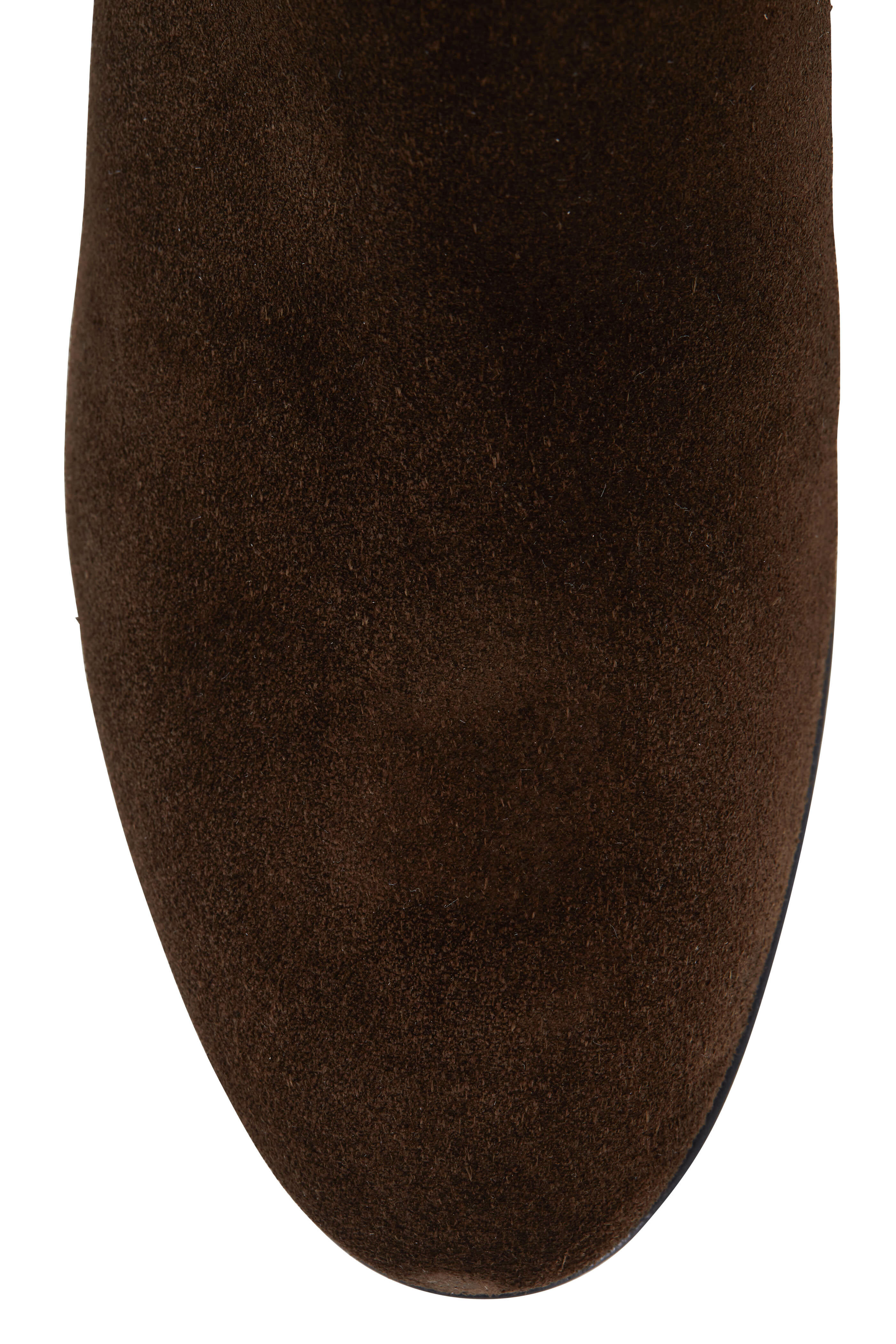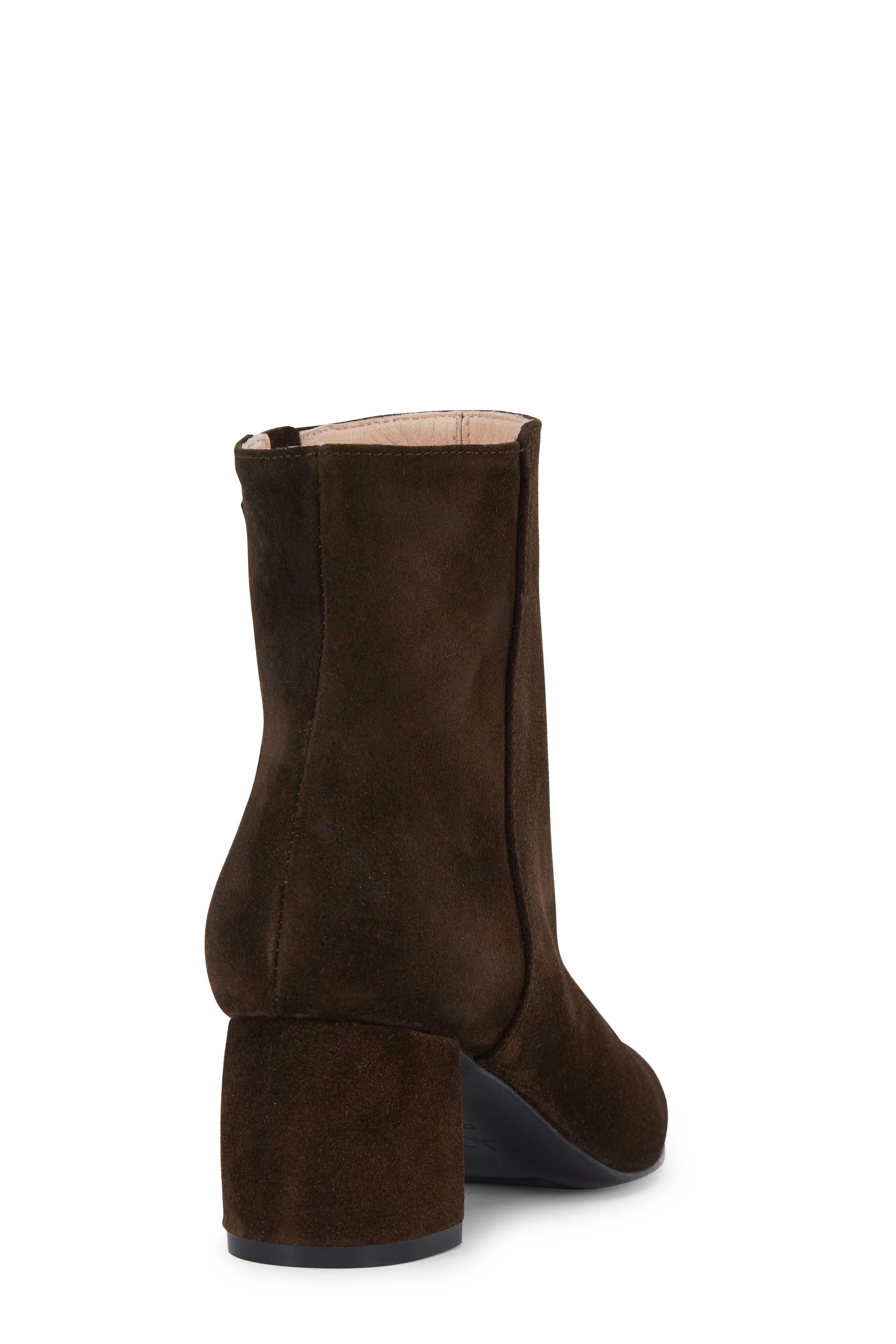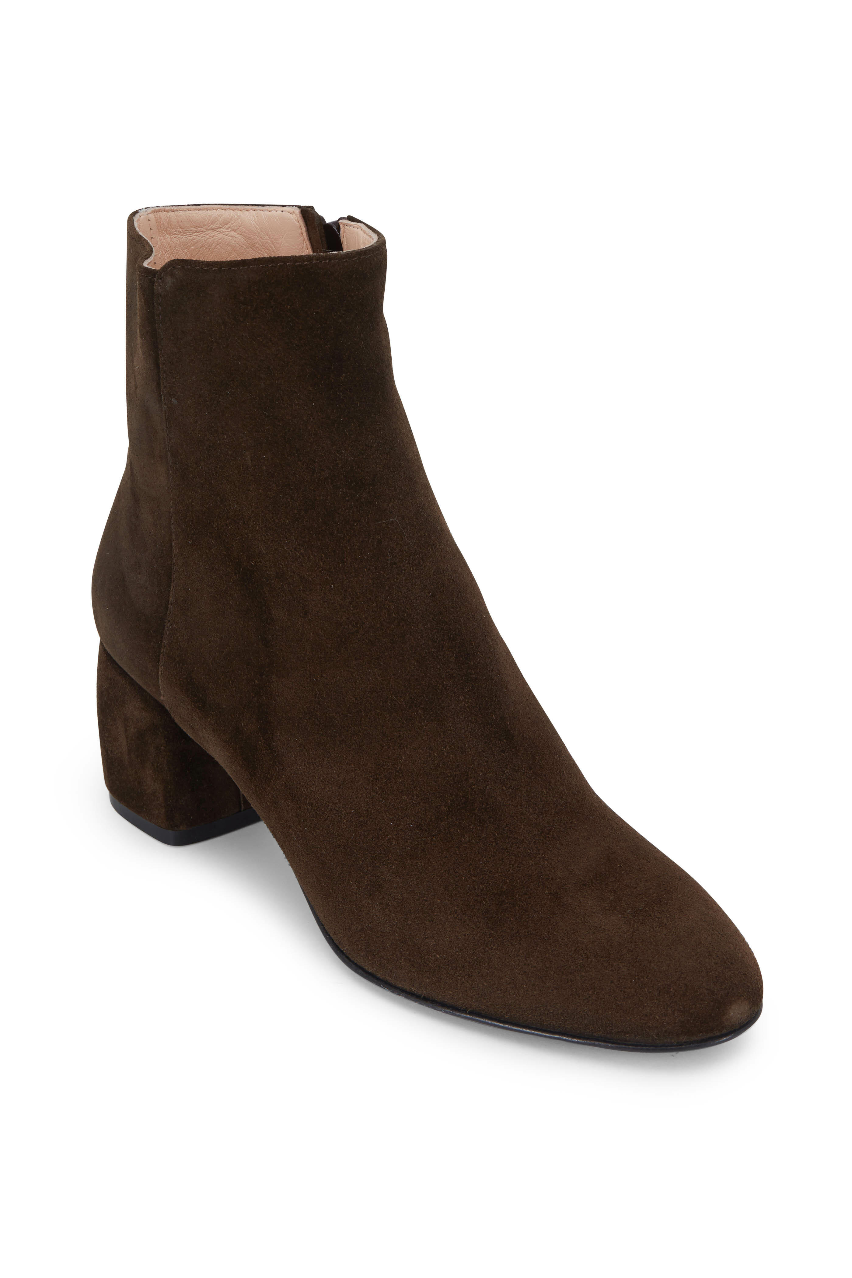 Suede upper. Tapered toe. Side zip closure. Leather lining, cushioned insole. Self covered curved block heel. Leather sole. Made in Italy. Heel measurement: 50mm (2"). Shaft: 5".
