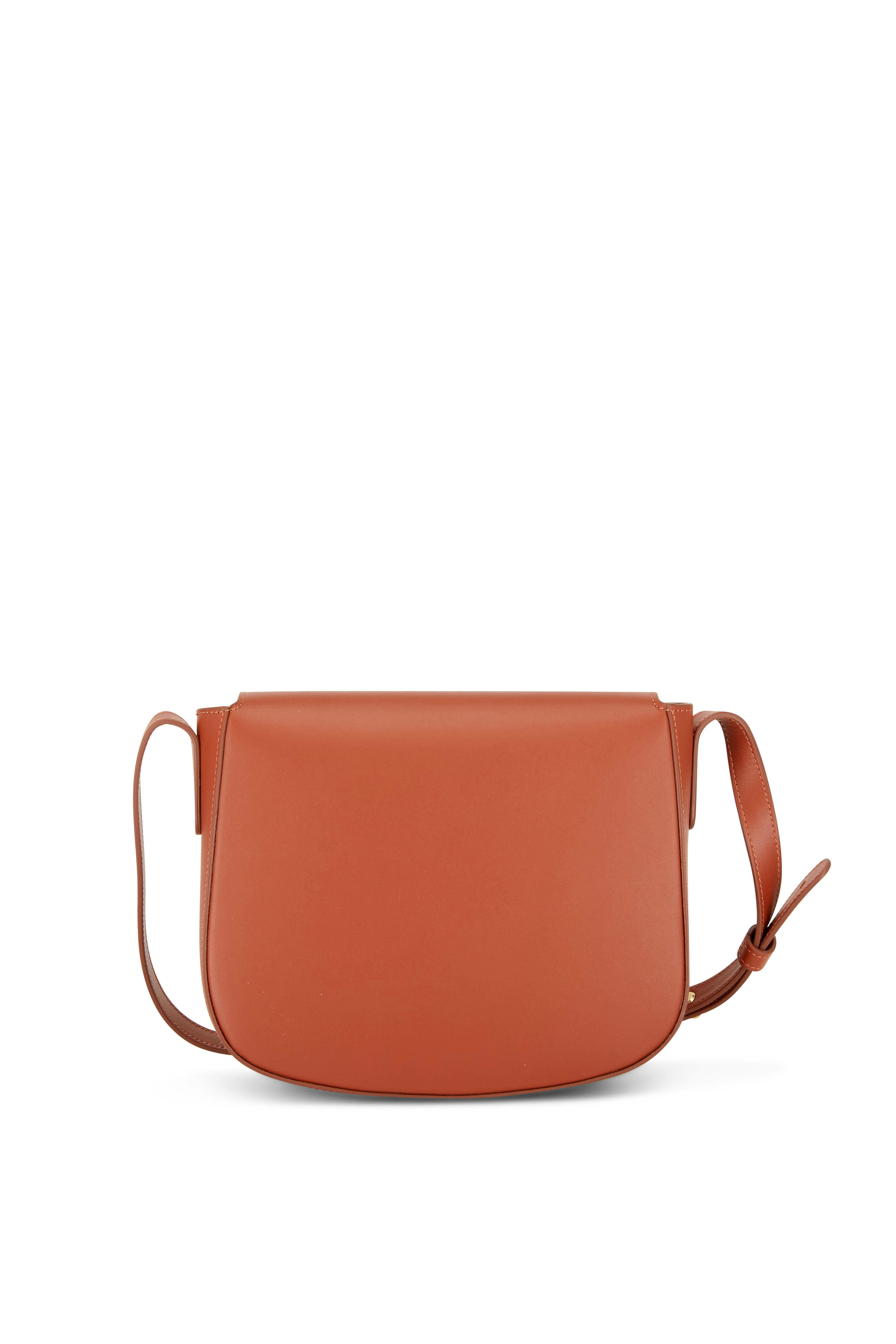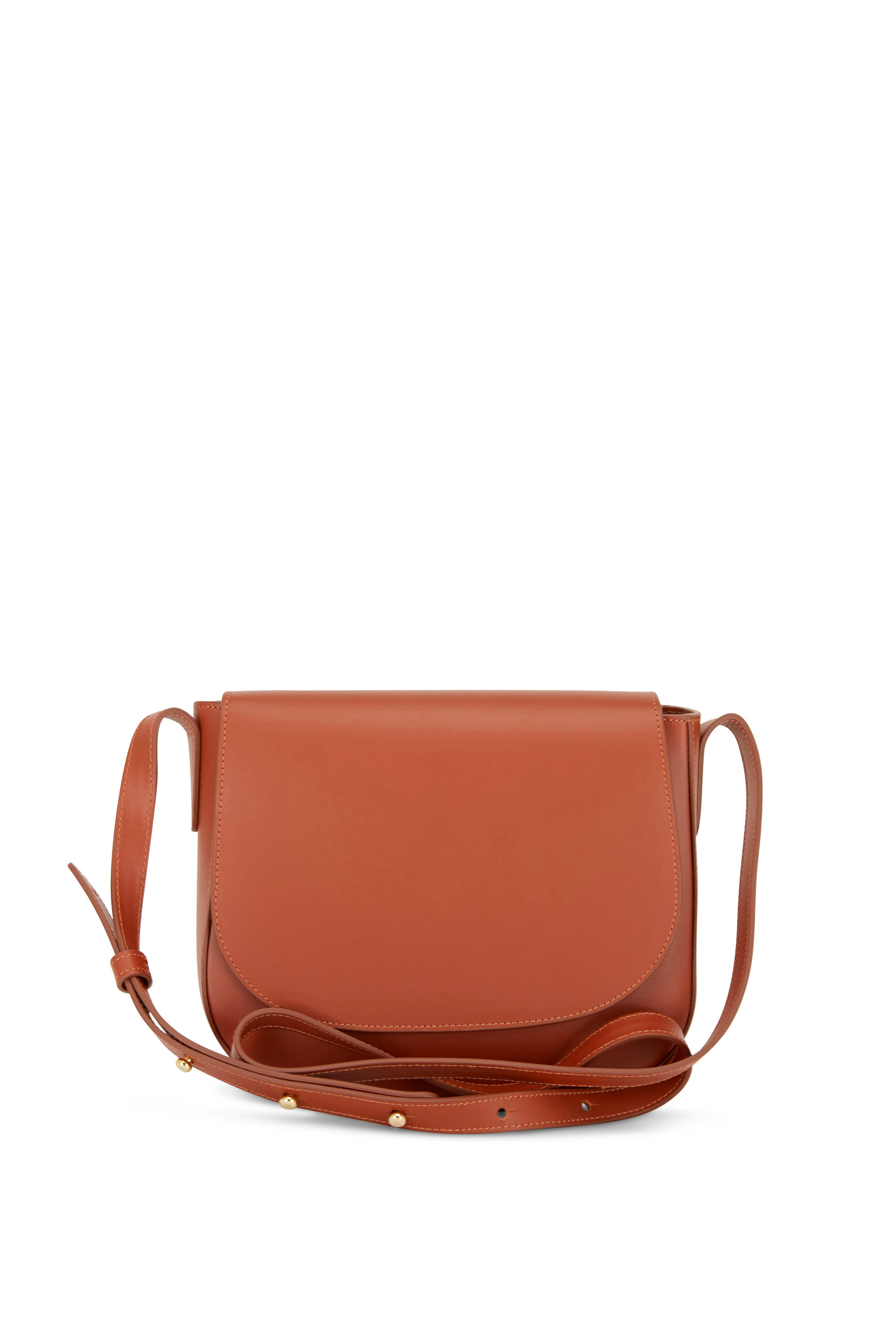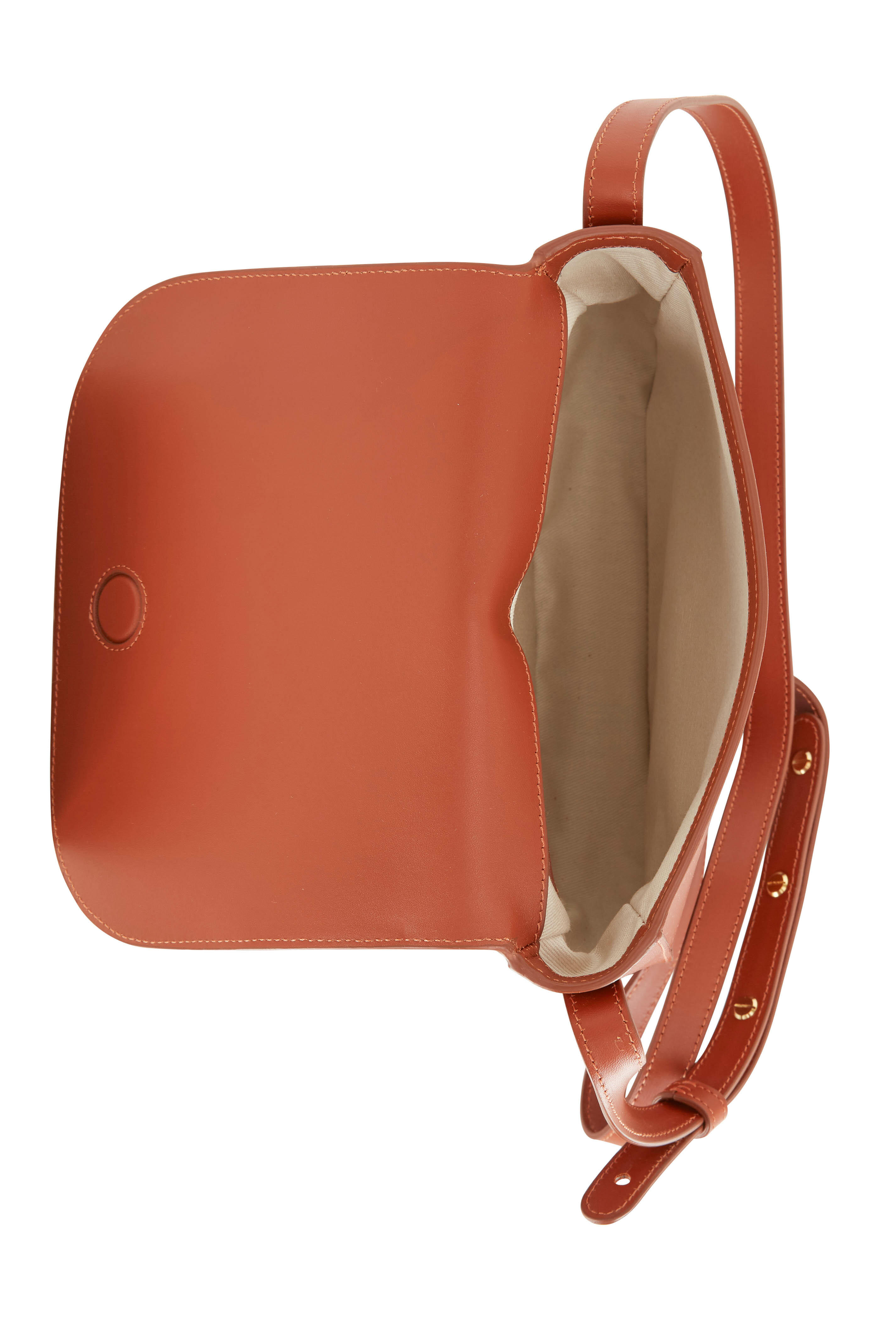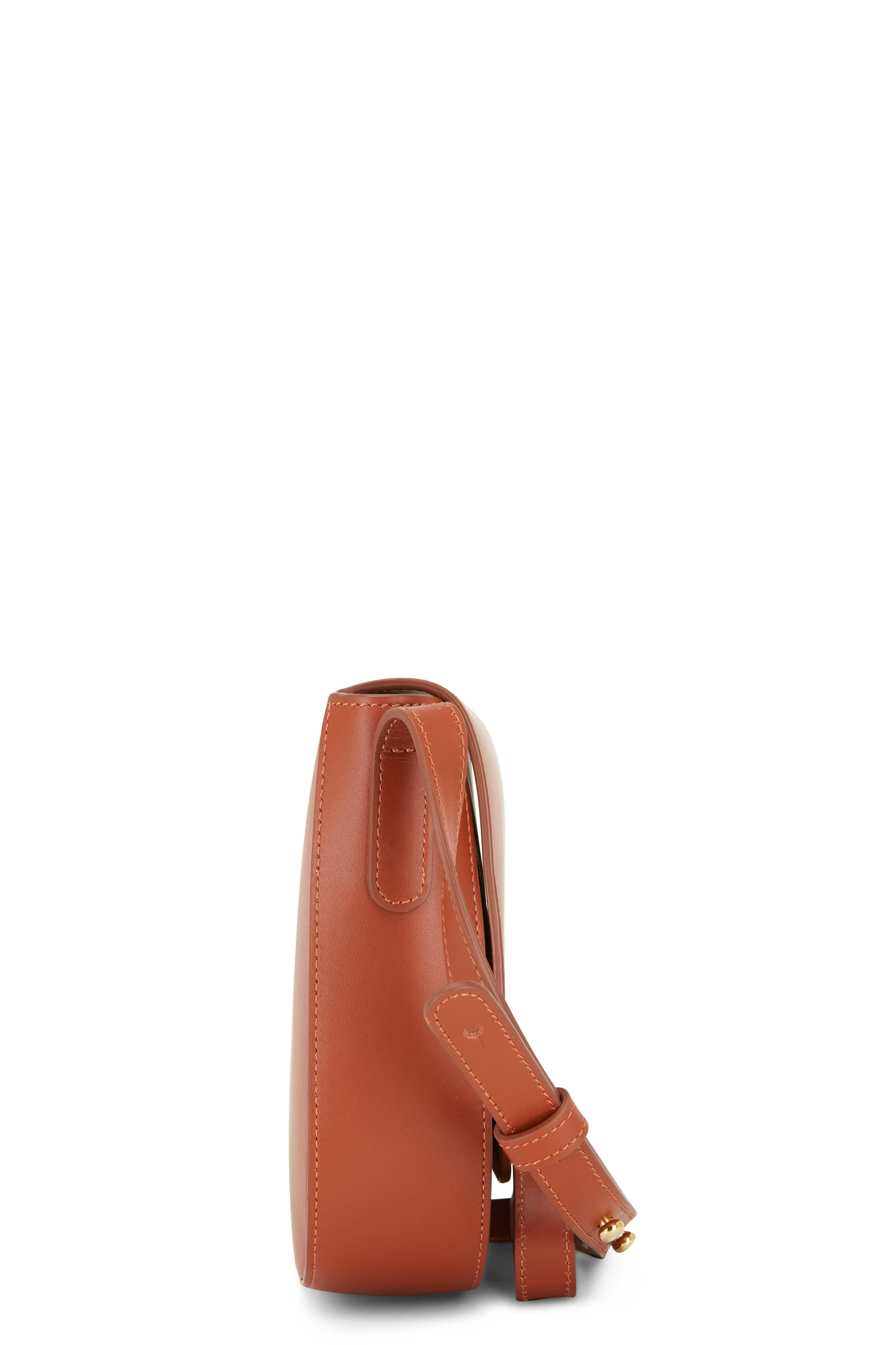 Calfskin leather. Adjustable flat strap. Flap front, magnetic snap closure. One interior open pocket. Lined in canvas. Made in Italy. Width: 9". Height: 7". Depth: 2". Adjustable strap drop: 20".
