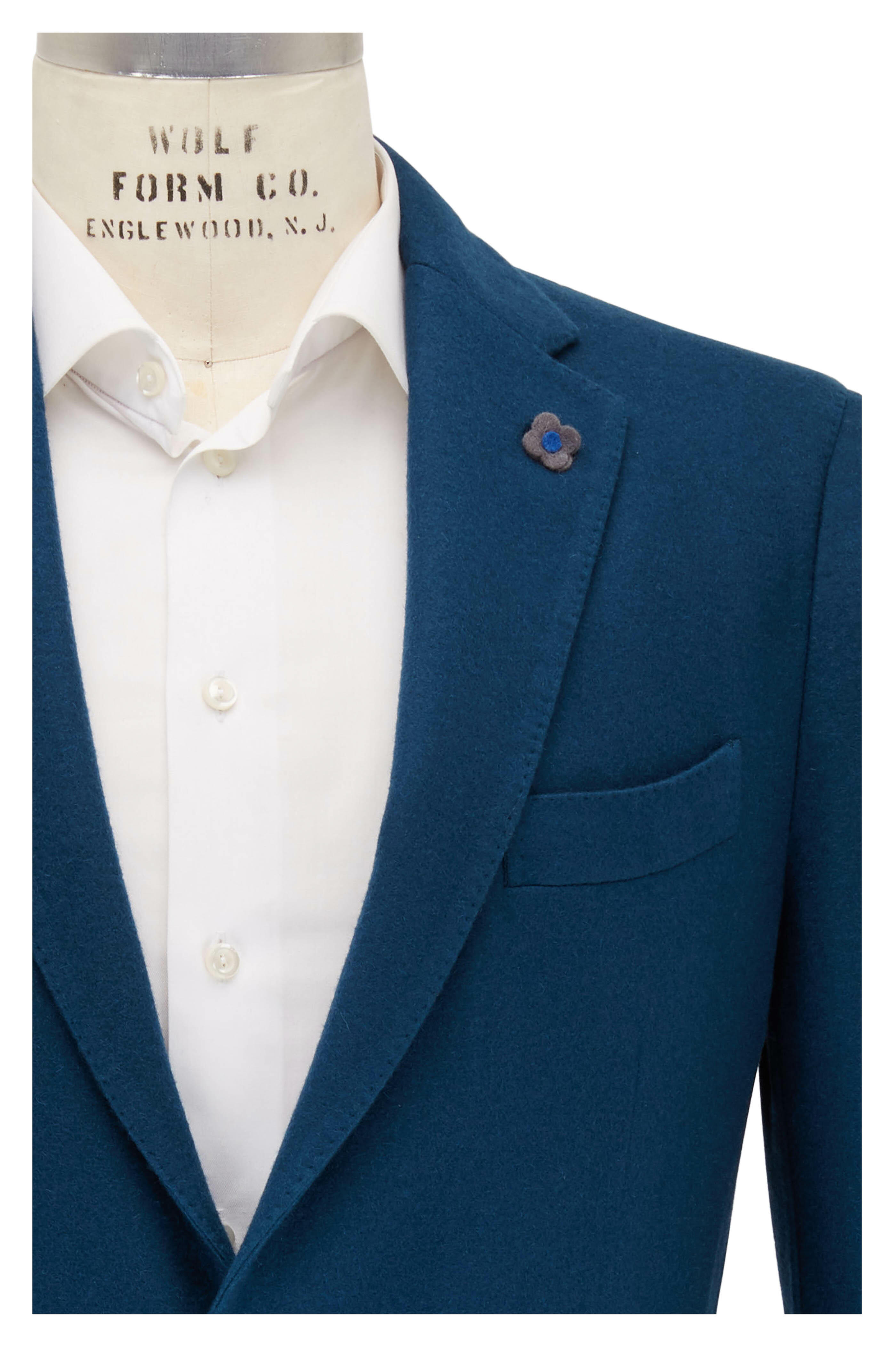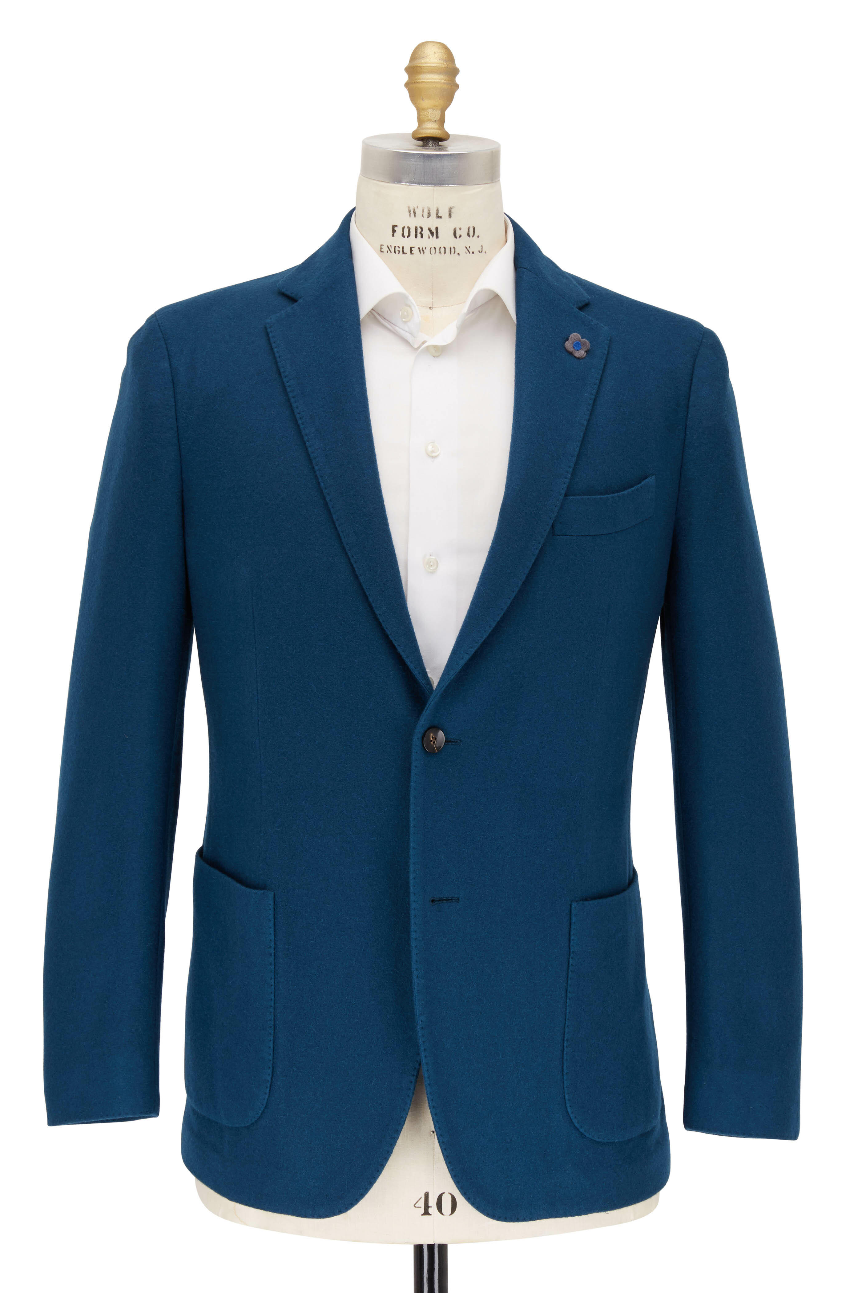 Notched lapels. Two button closure. Lined sleeves. Lower patch pockets; chest welt pocket. Double vent. Made in Italy. 100% cashmere; unlined. Dry clean.