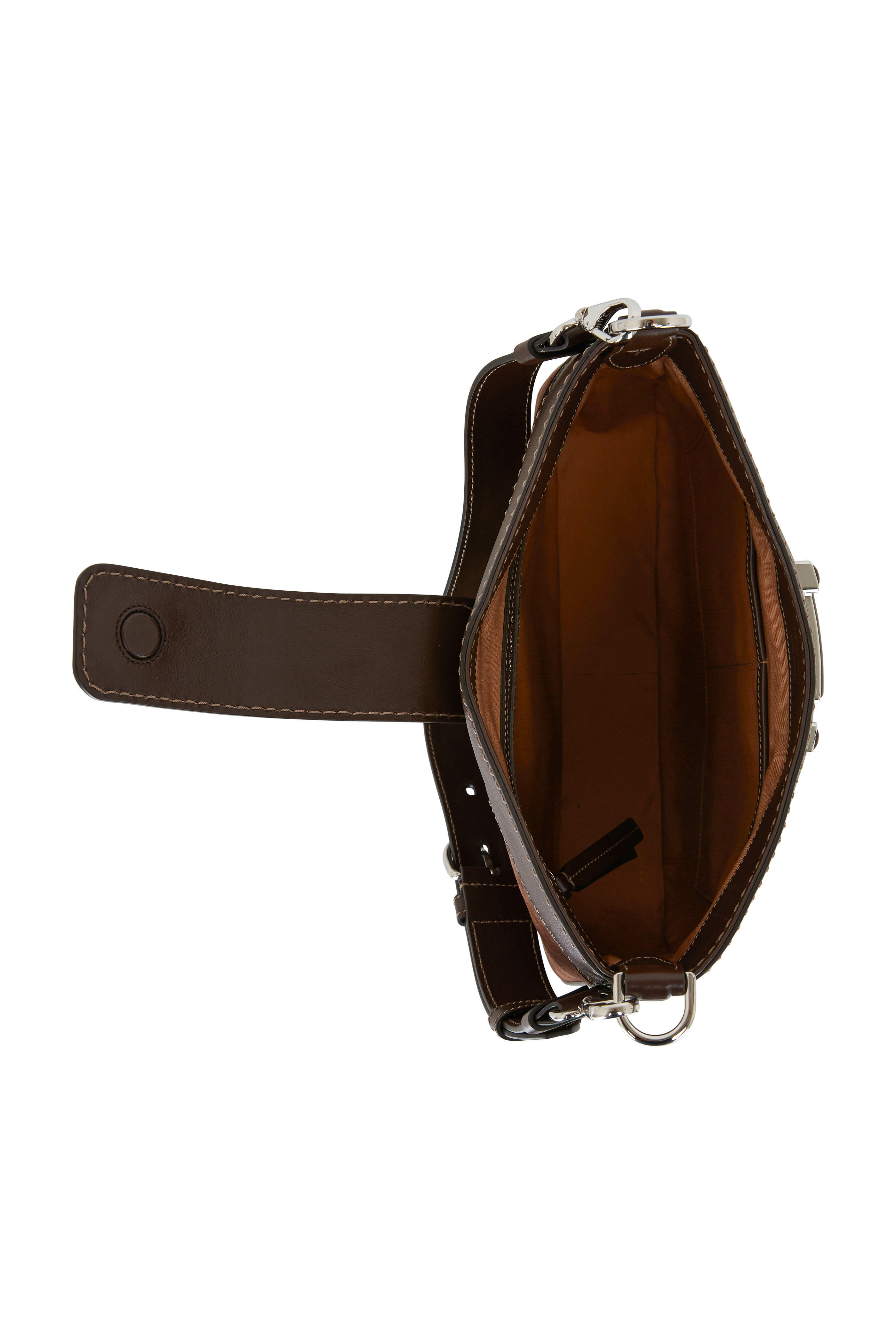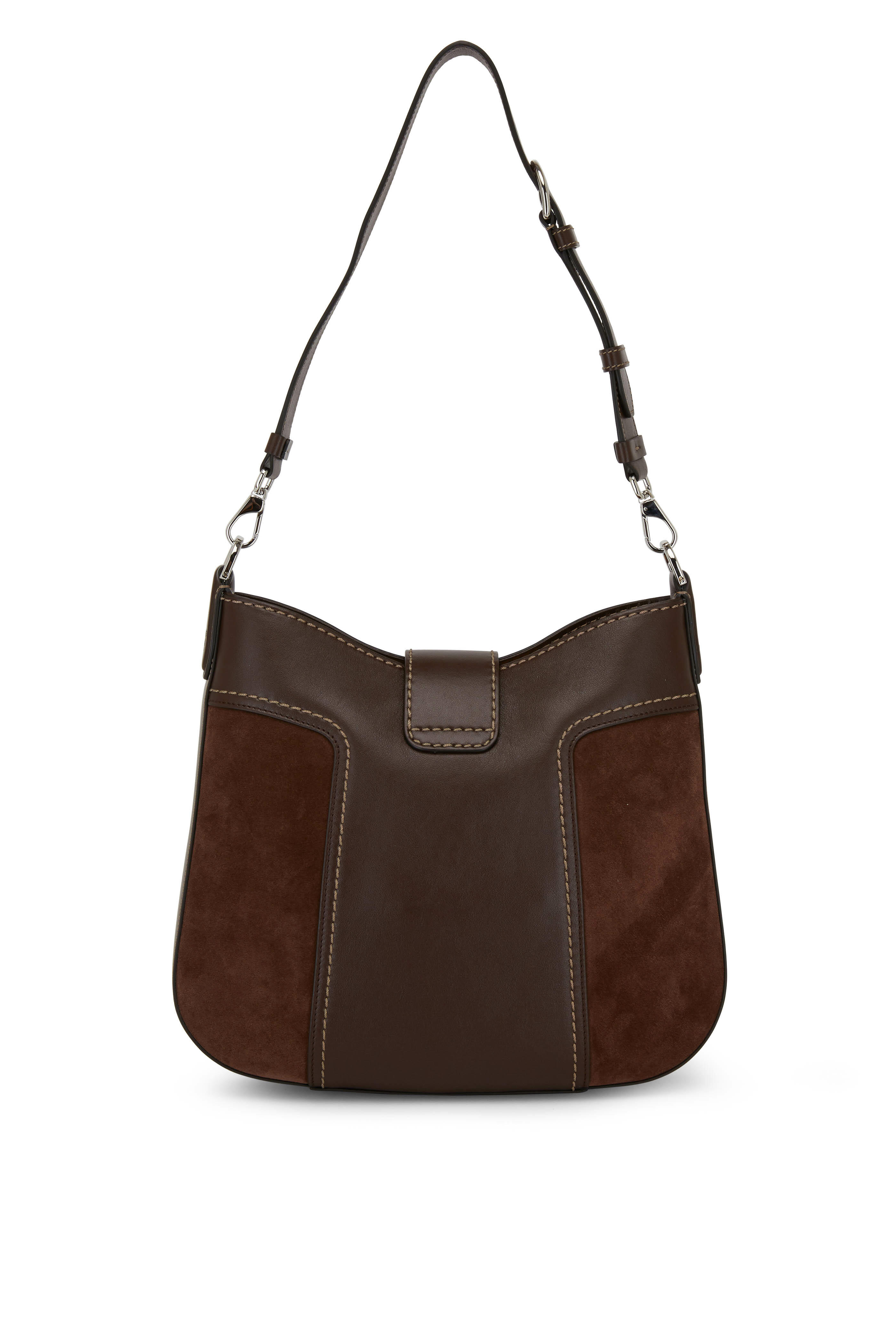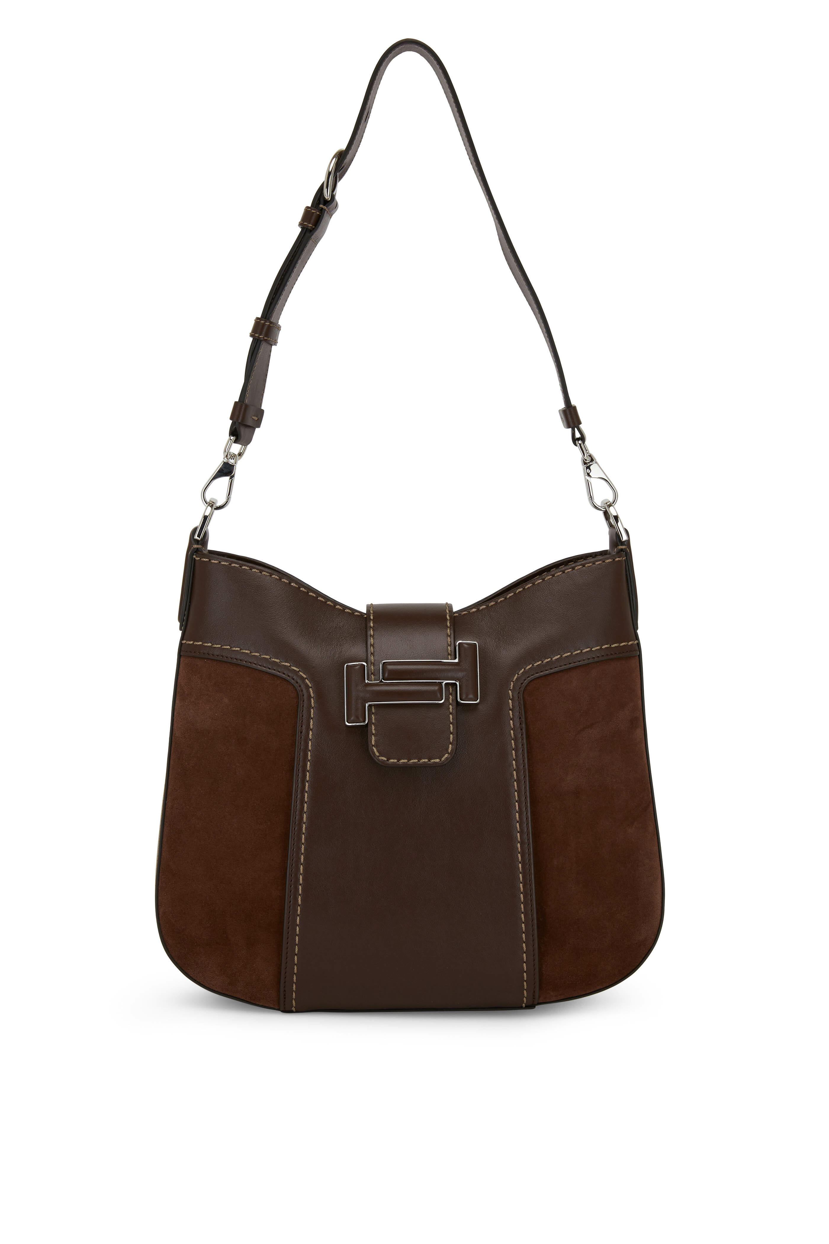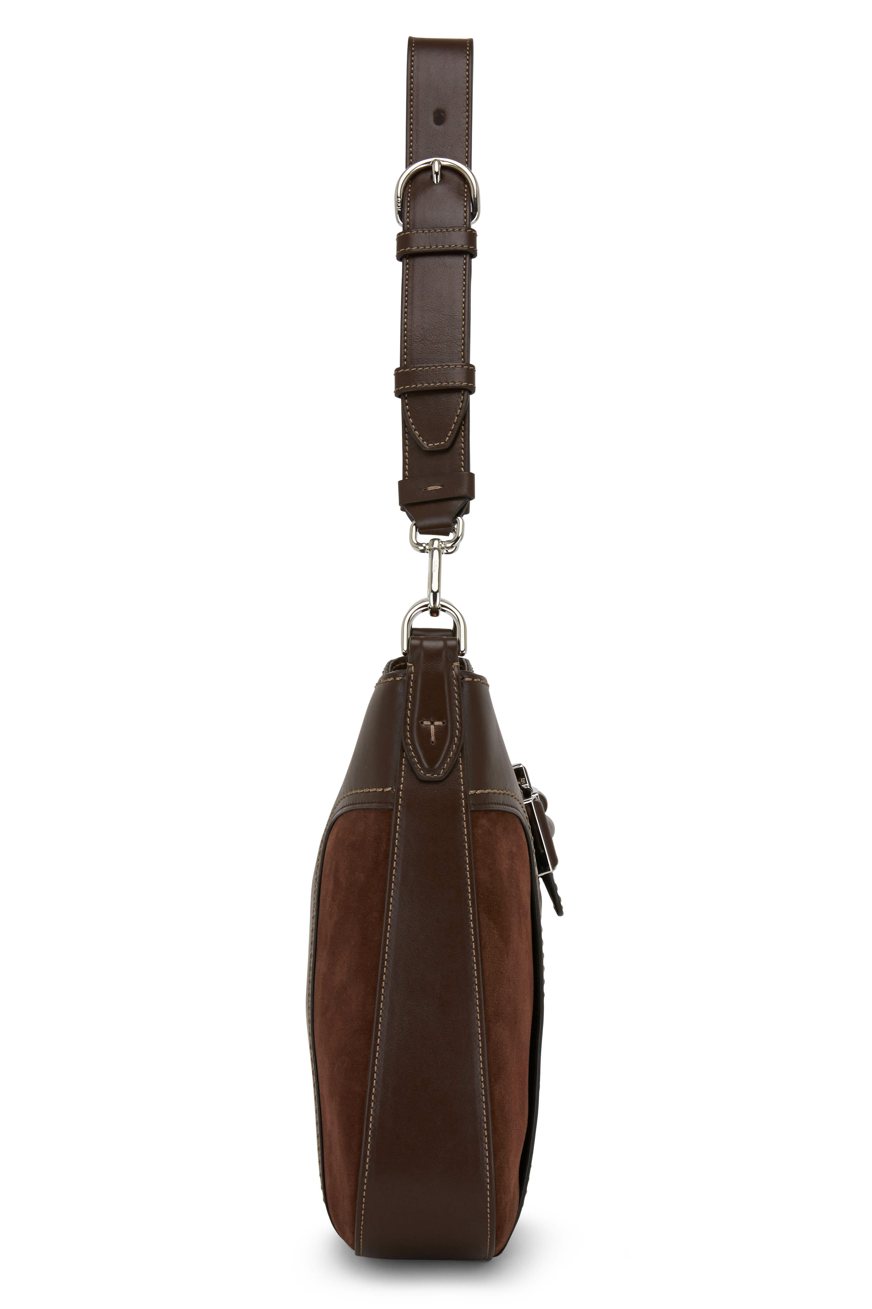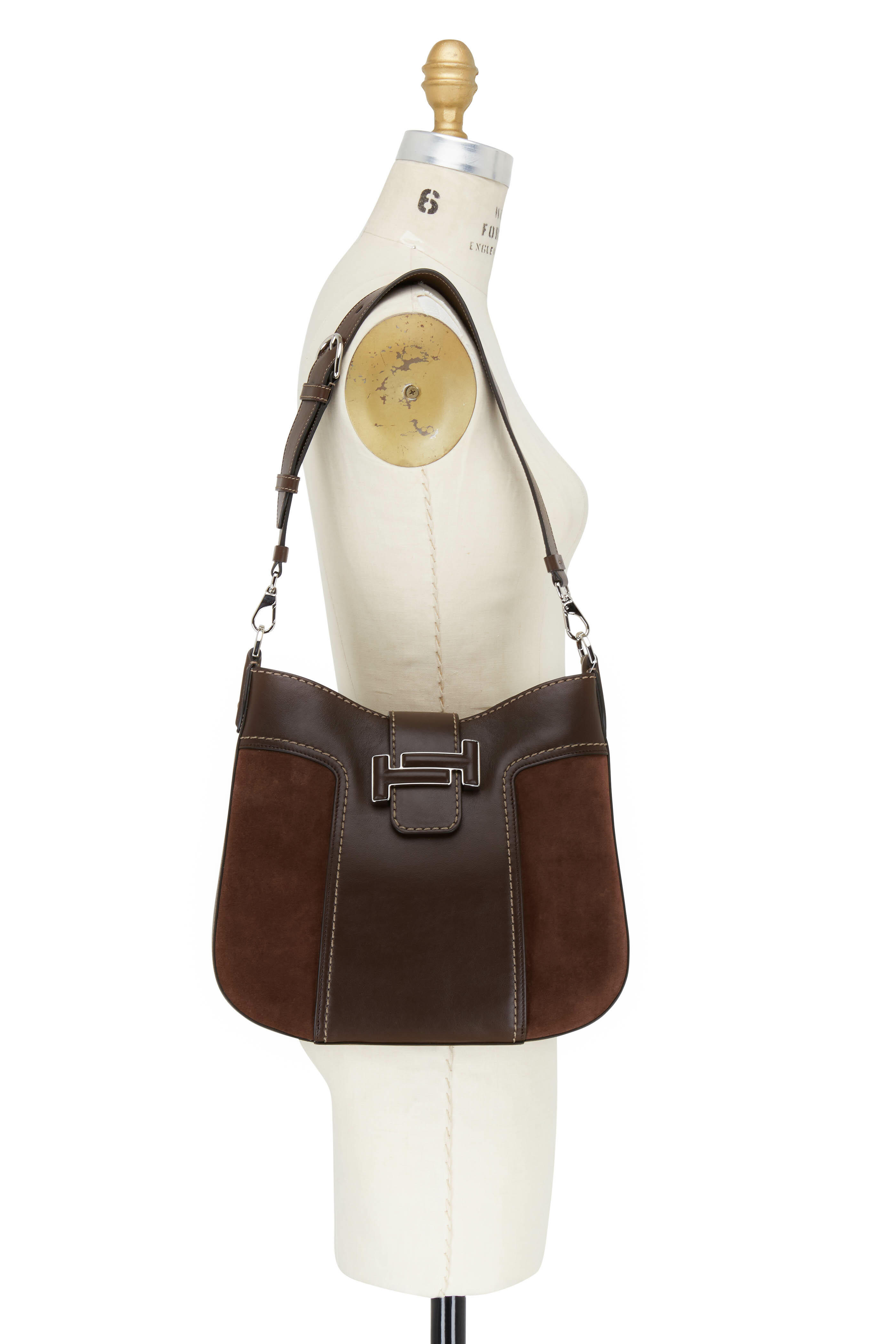 Calfskin leather and suede. Detachable and adjustable strap. Flap across top, signature double T pull through. Contrast top-stitching. Two interior open and one zip pocket. Lined in canvas. Made in Italy. Width: 12". Height: 10". Depth: 2". Detachable and adjustable strap: 12".