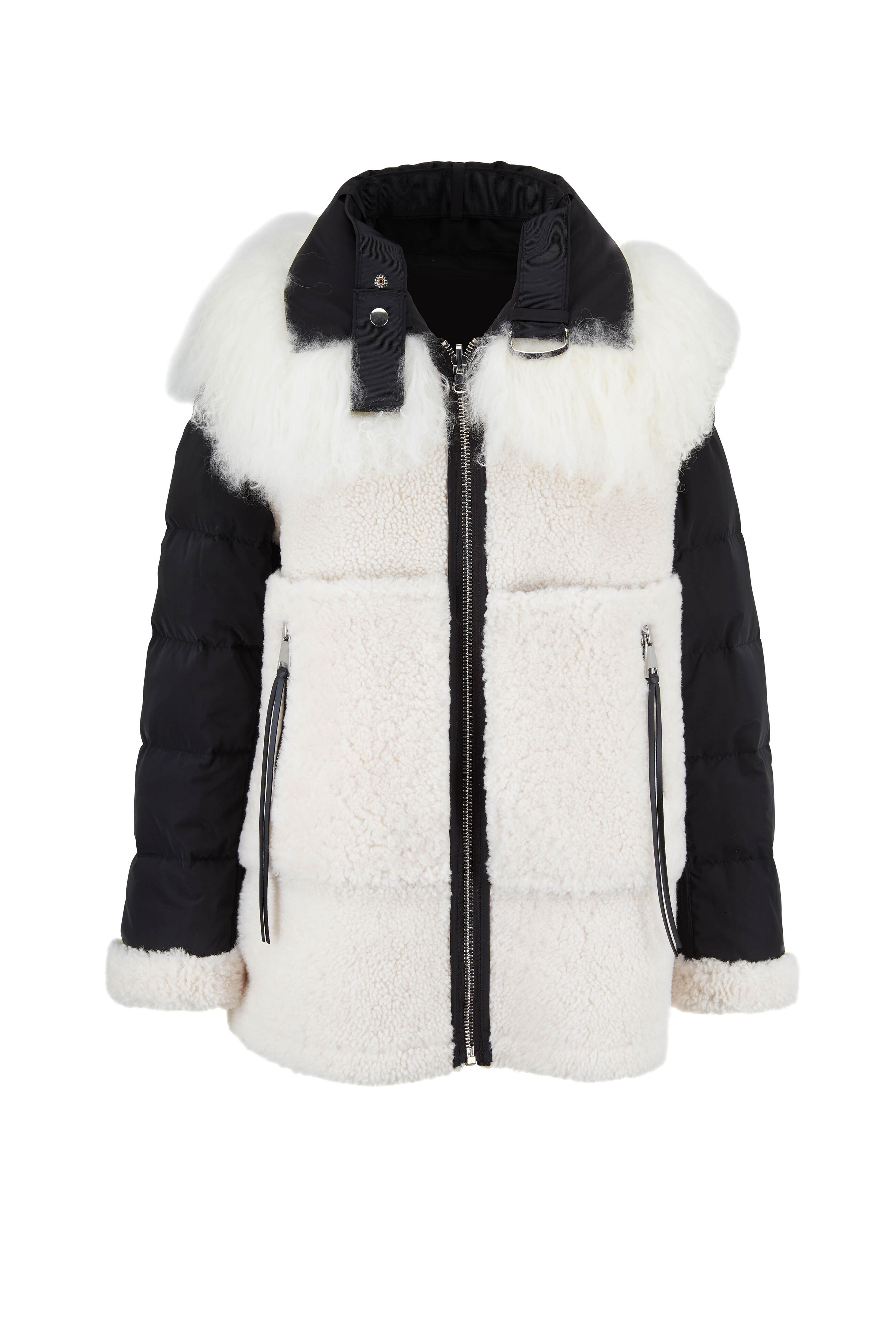 Specialist clean. Fur spread collar. Front zip closure. Contrast quilted sleeves; shearling cuffs. Lower slip pockets. Imported. 100% lambskin; fabric 2: 100% polyester; filling: 90% goose down, 10% feathers; trim: lamb (China).