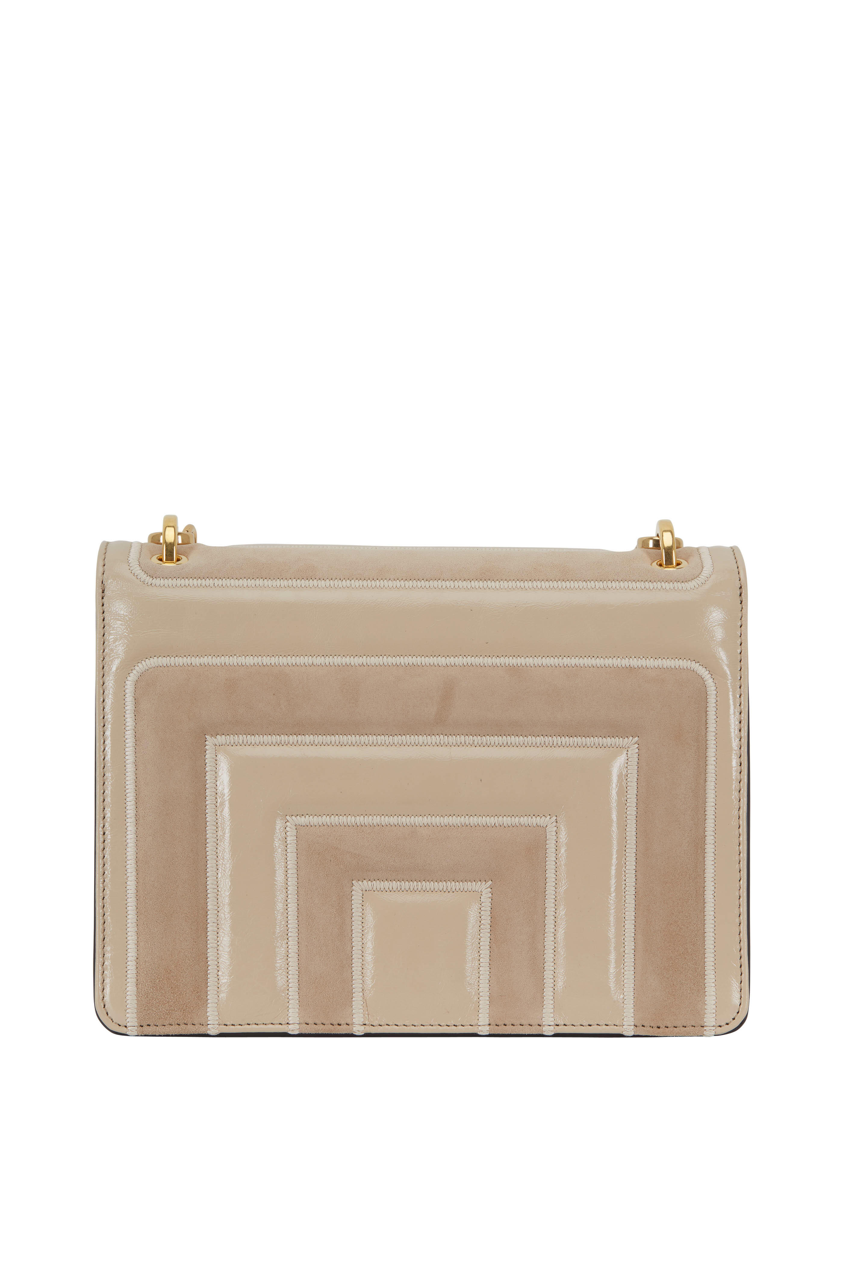 Calfskin leather and suede. Detachable gold chain link hand strap. Detachable and adjustable flat leather strap. Flap front, FF logo push-lock closure. Interior snap pocket. Lined in suede. Made in Italy. Width: 10". Height: 7". Depth: 4". Detachable handle drop: 5". Detachable and adjustable strap drop: 18".