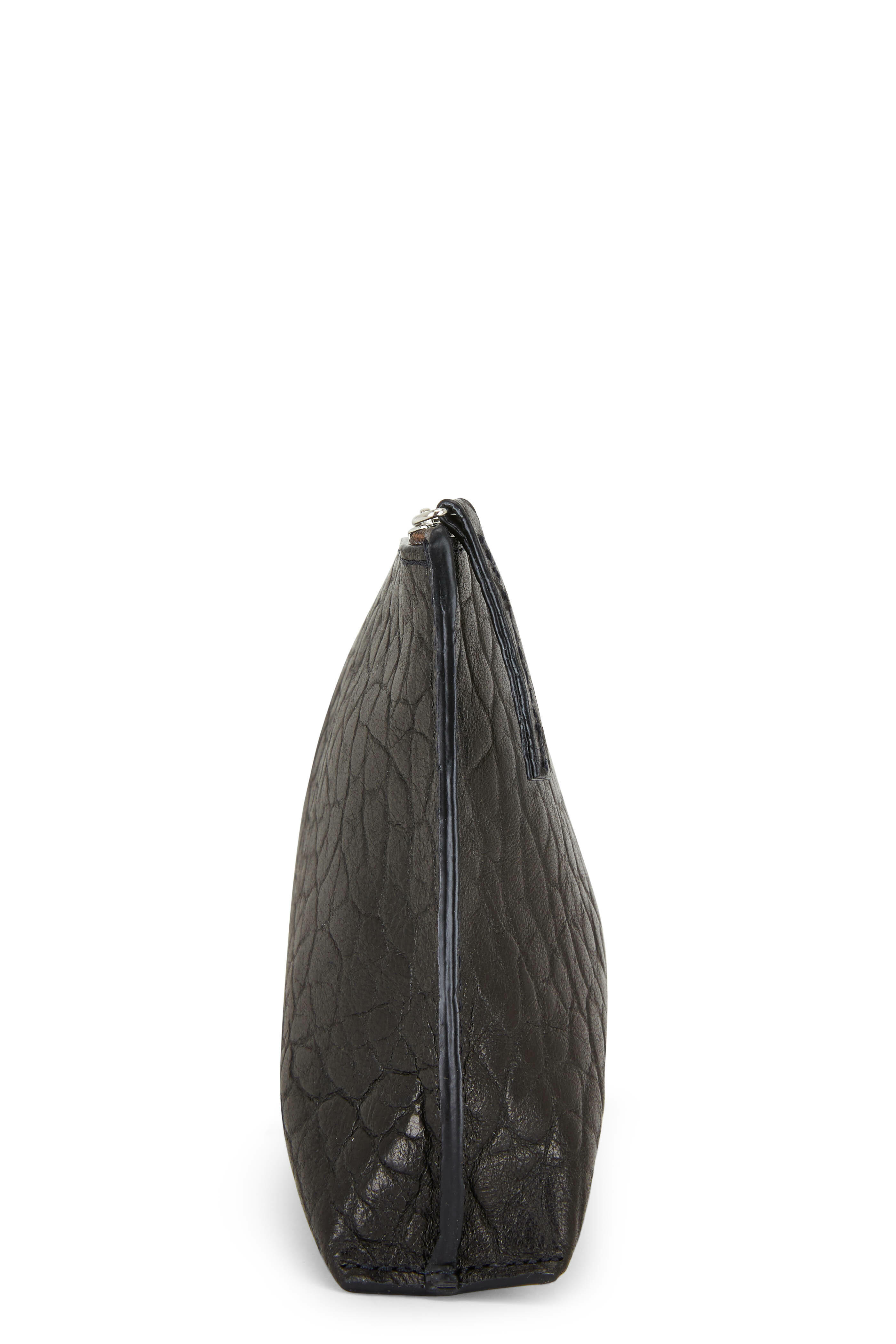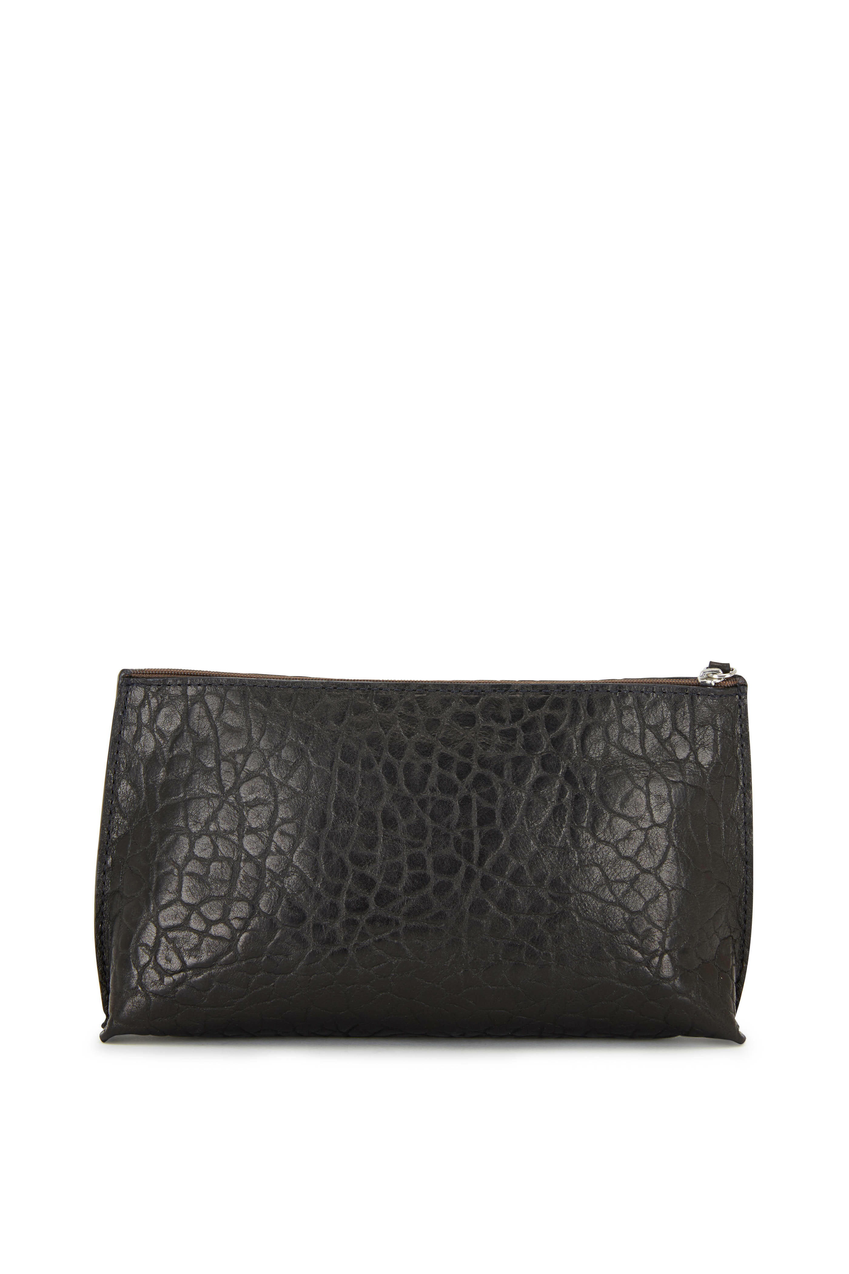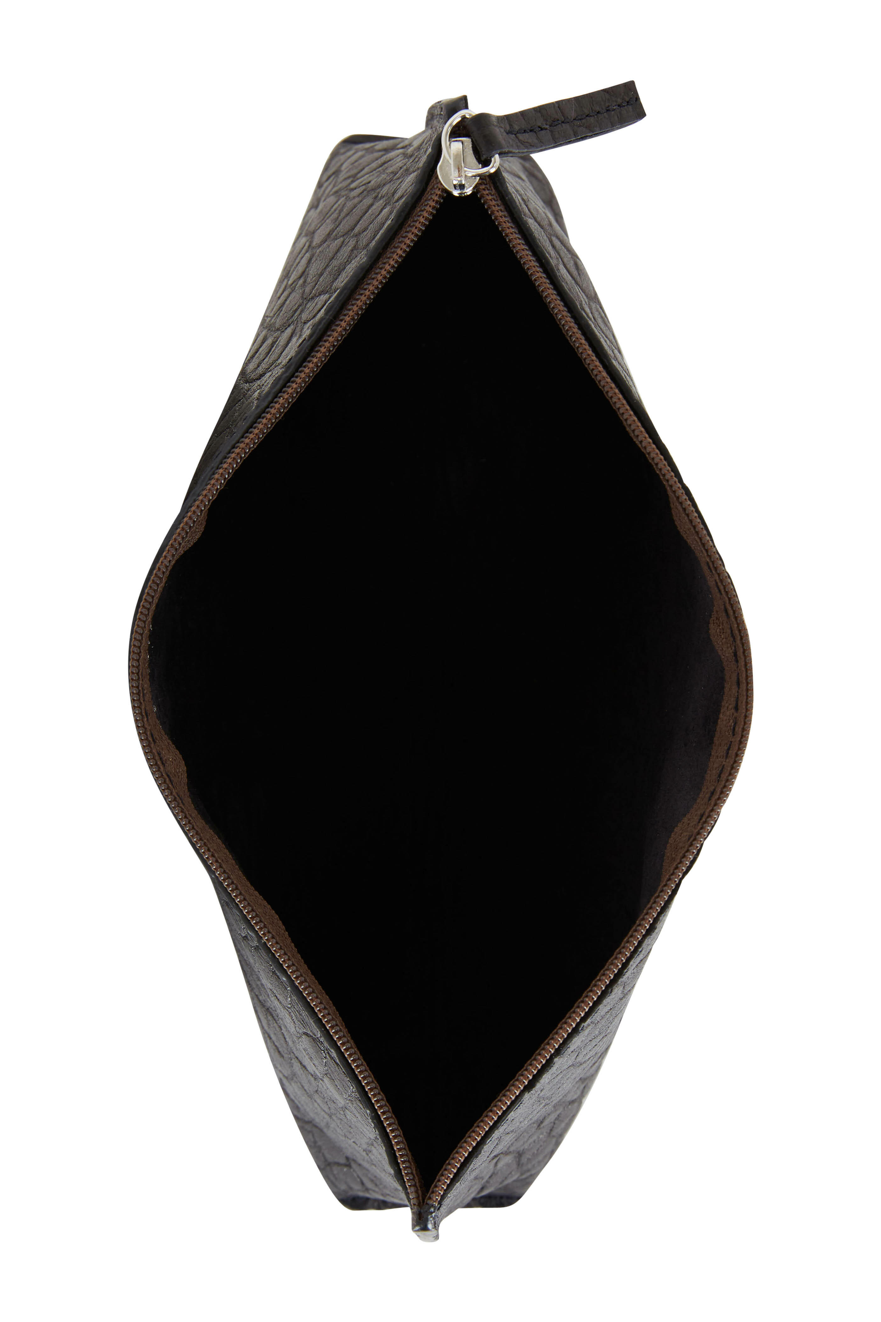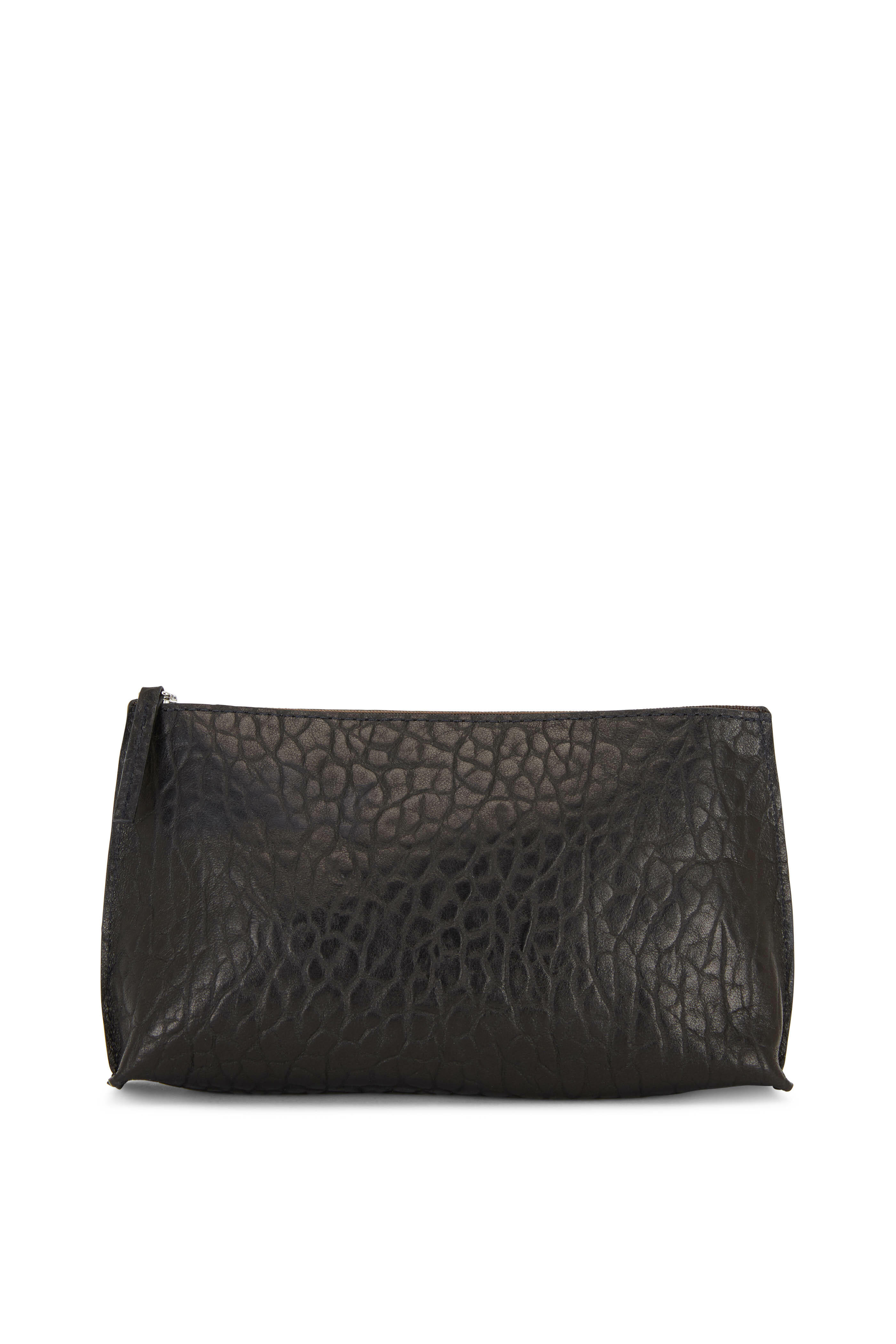 Embossed sheepskin. Top zip closure. Lined in suede. Made in the USA. Width: 9". Height: 6". Depth: 2".