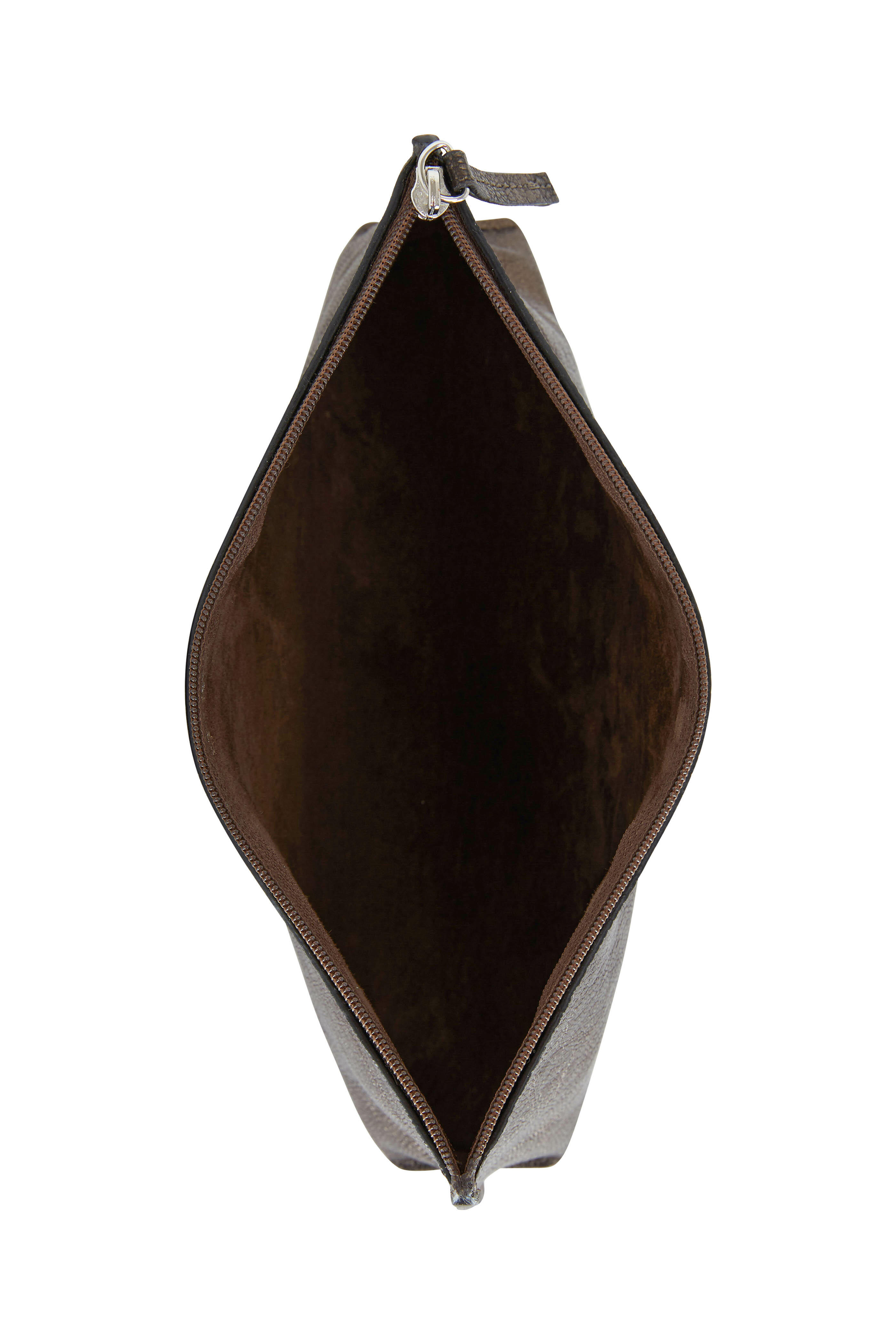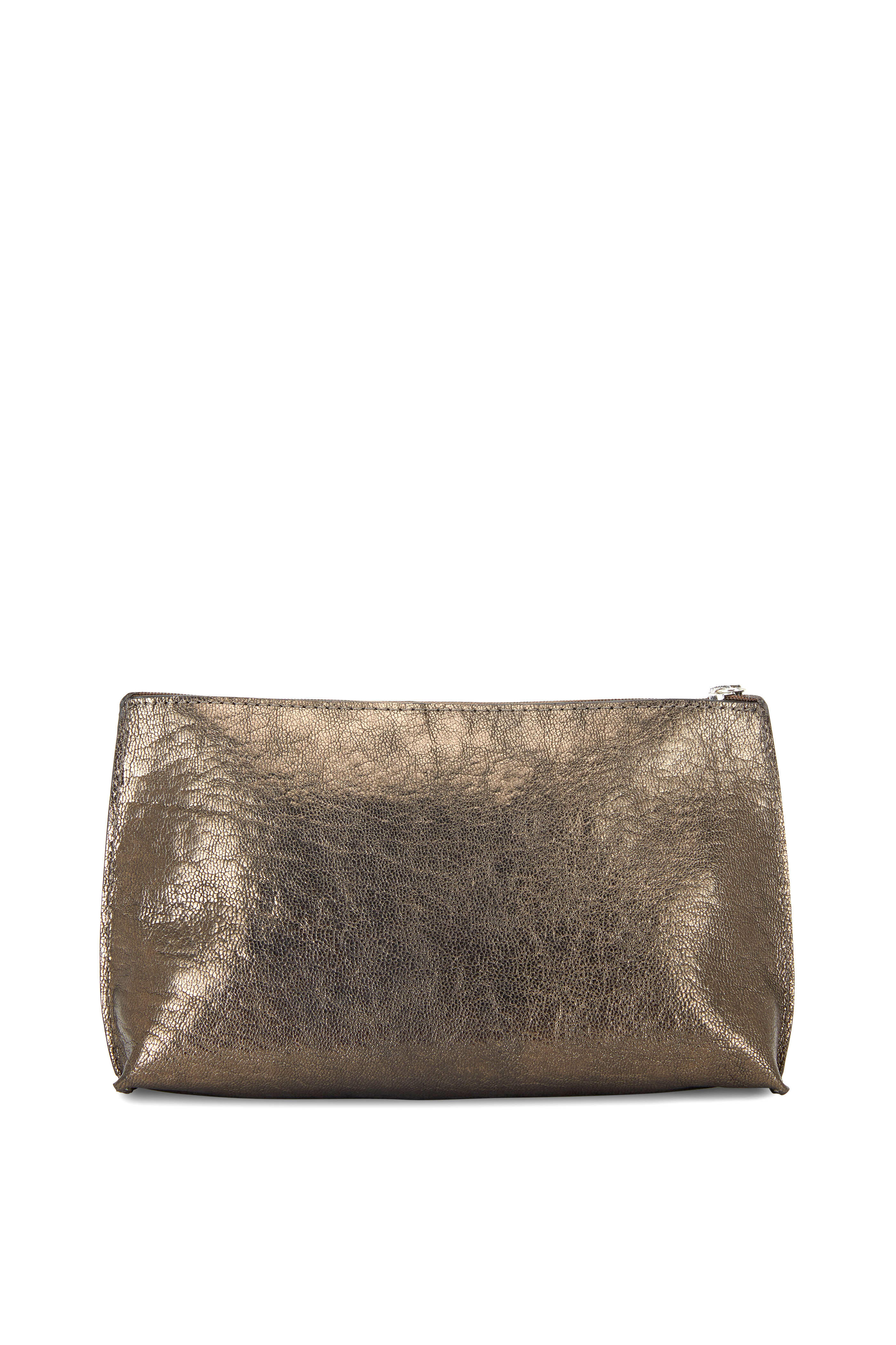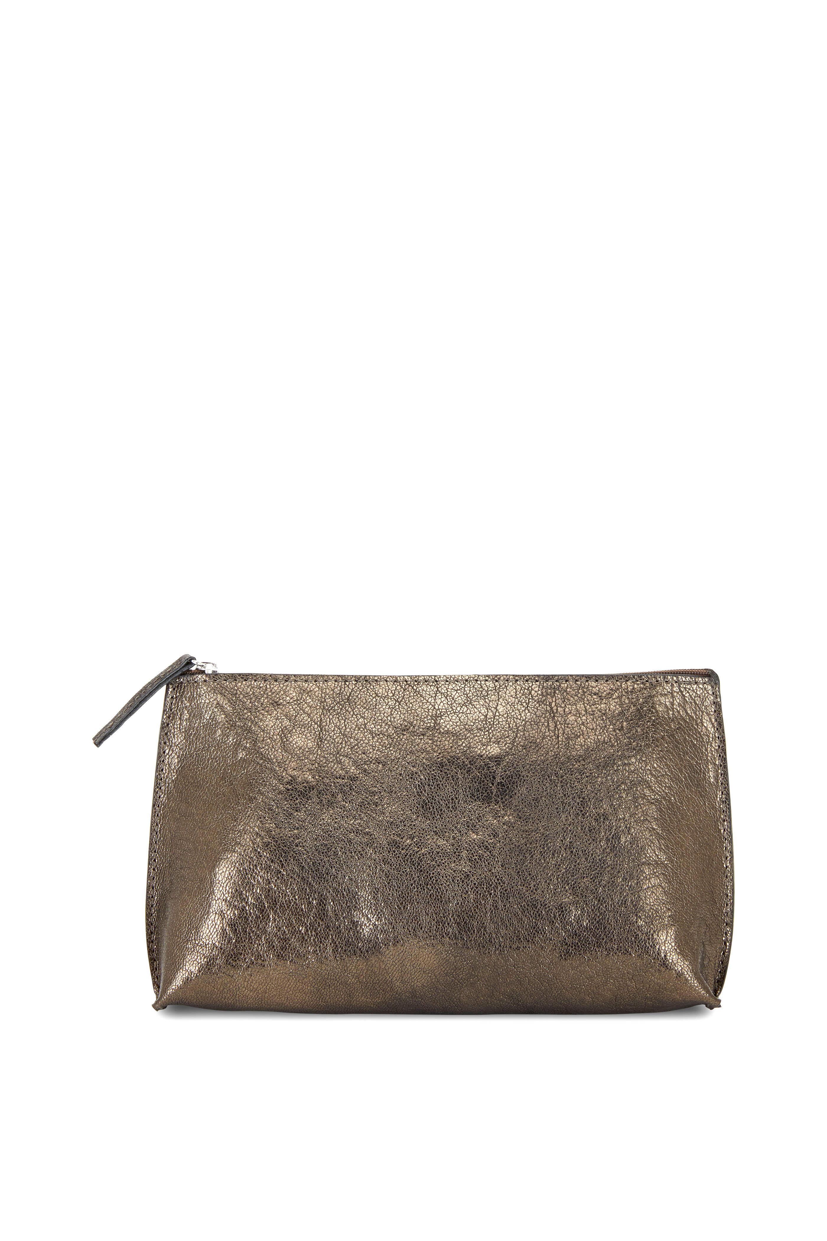 Metallic leather. Top zip closure. Lined in suede. Made in the USA. Width: 9". Height: 6". Depth: 2".