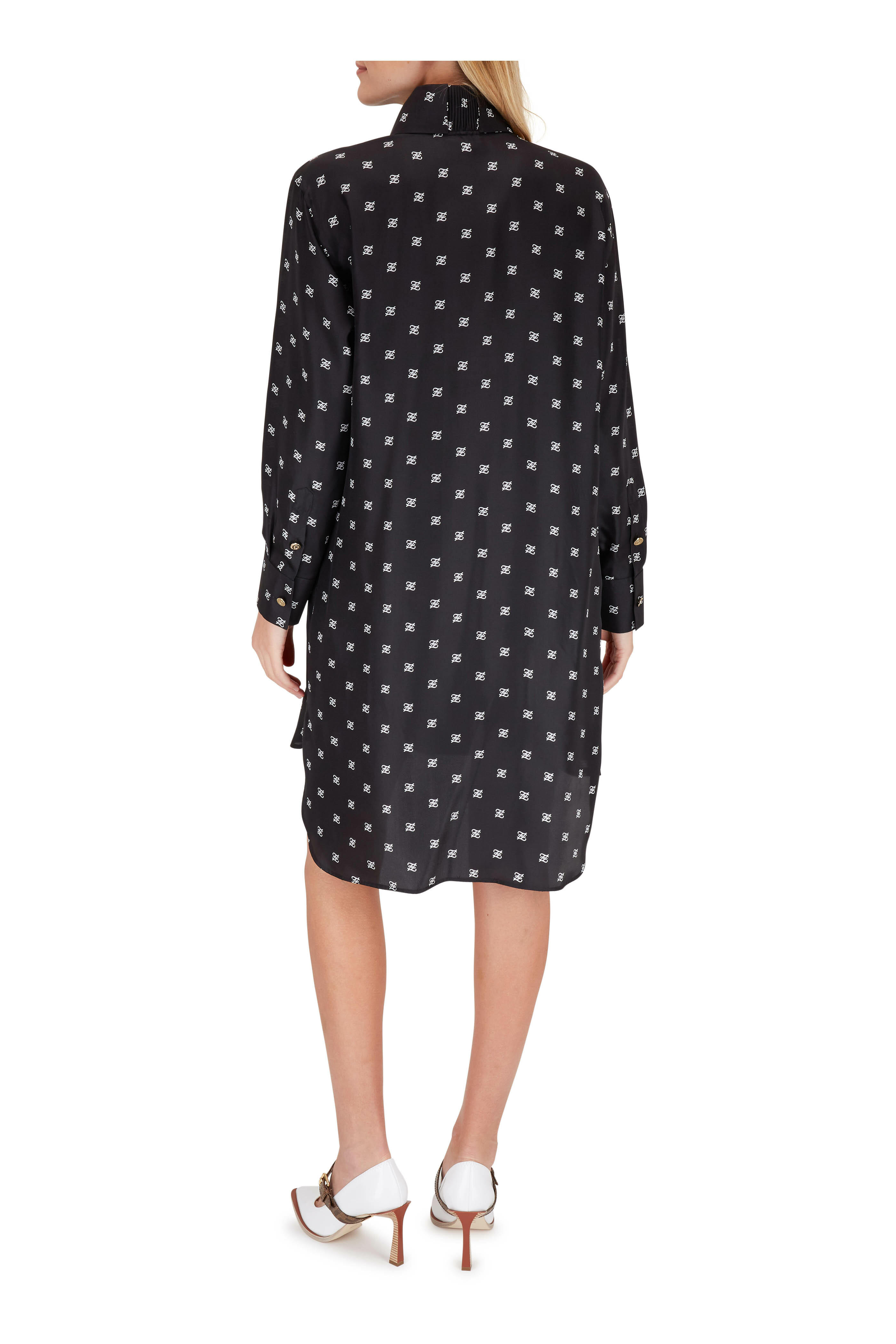Edwardian collar. Concealed front button placket. Button cuffs. Hi-low hem. Made in Italy. 35" shoulder to front hem. 39½" shoulder to back hem. 100% silk; unlined. Dry clean.