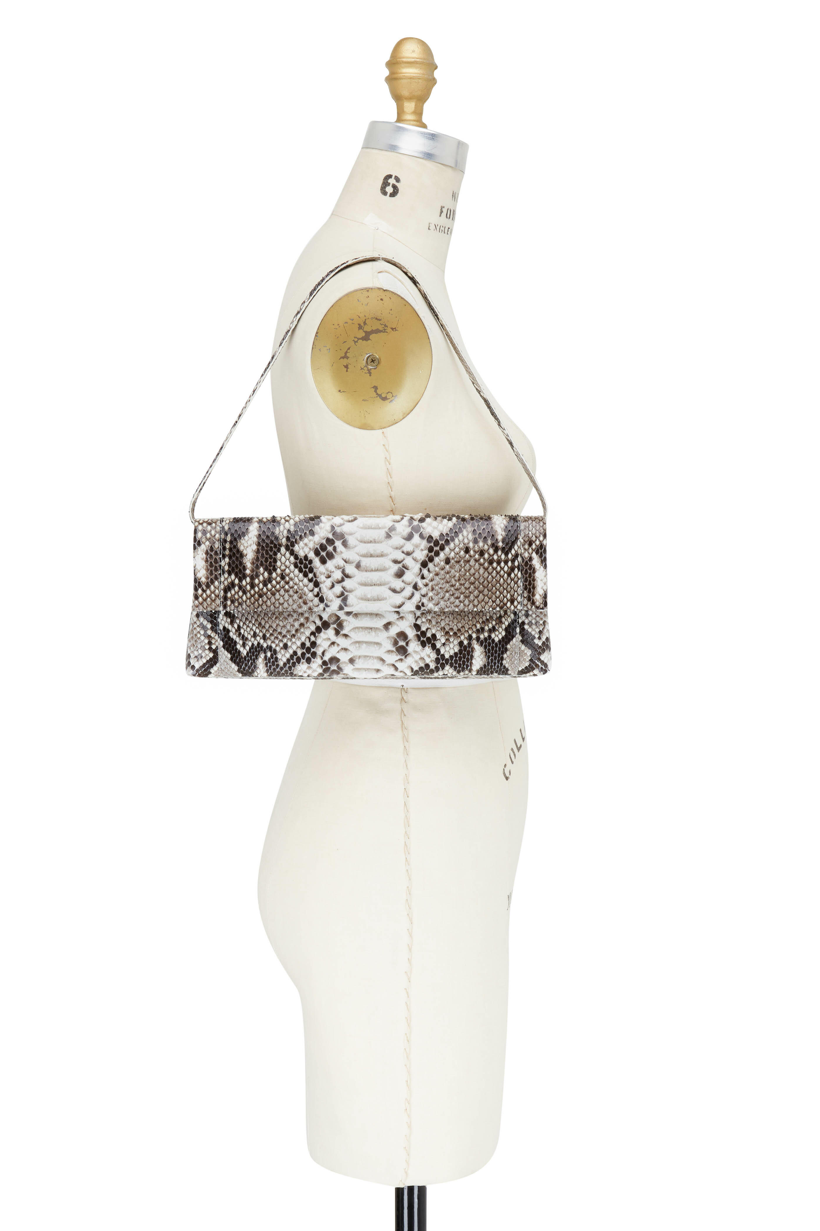 Natural phyton. Detachable shoulder strap. Front flap; magnetic snap closure. Exterior back slip pocket. Center zip compartment, two open compartments. Interior slip pocket. Lined in suede. Made in Columbia. Width: 11". Height: 5". Depth: 2". Detachable strap drop: 8".