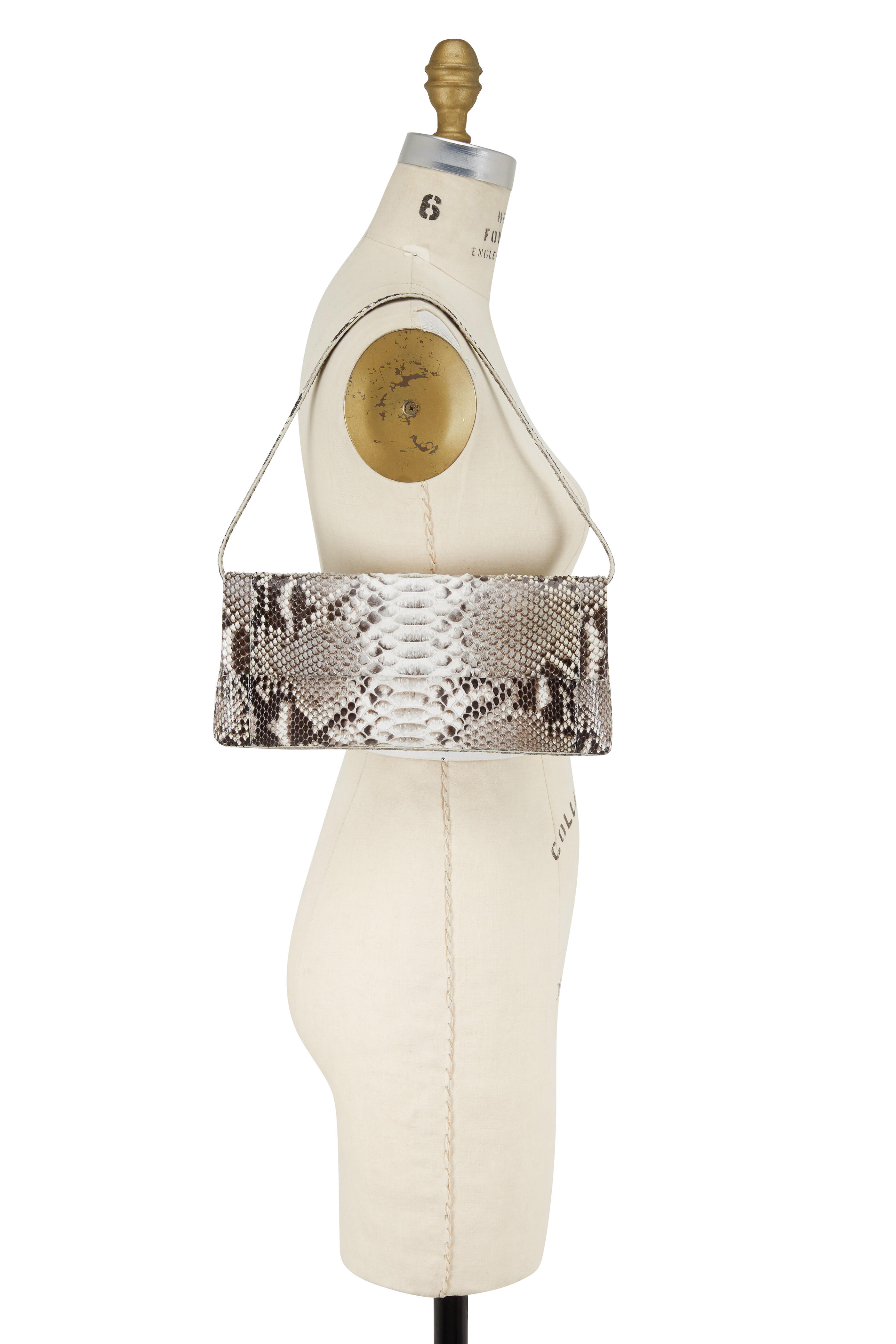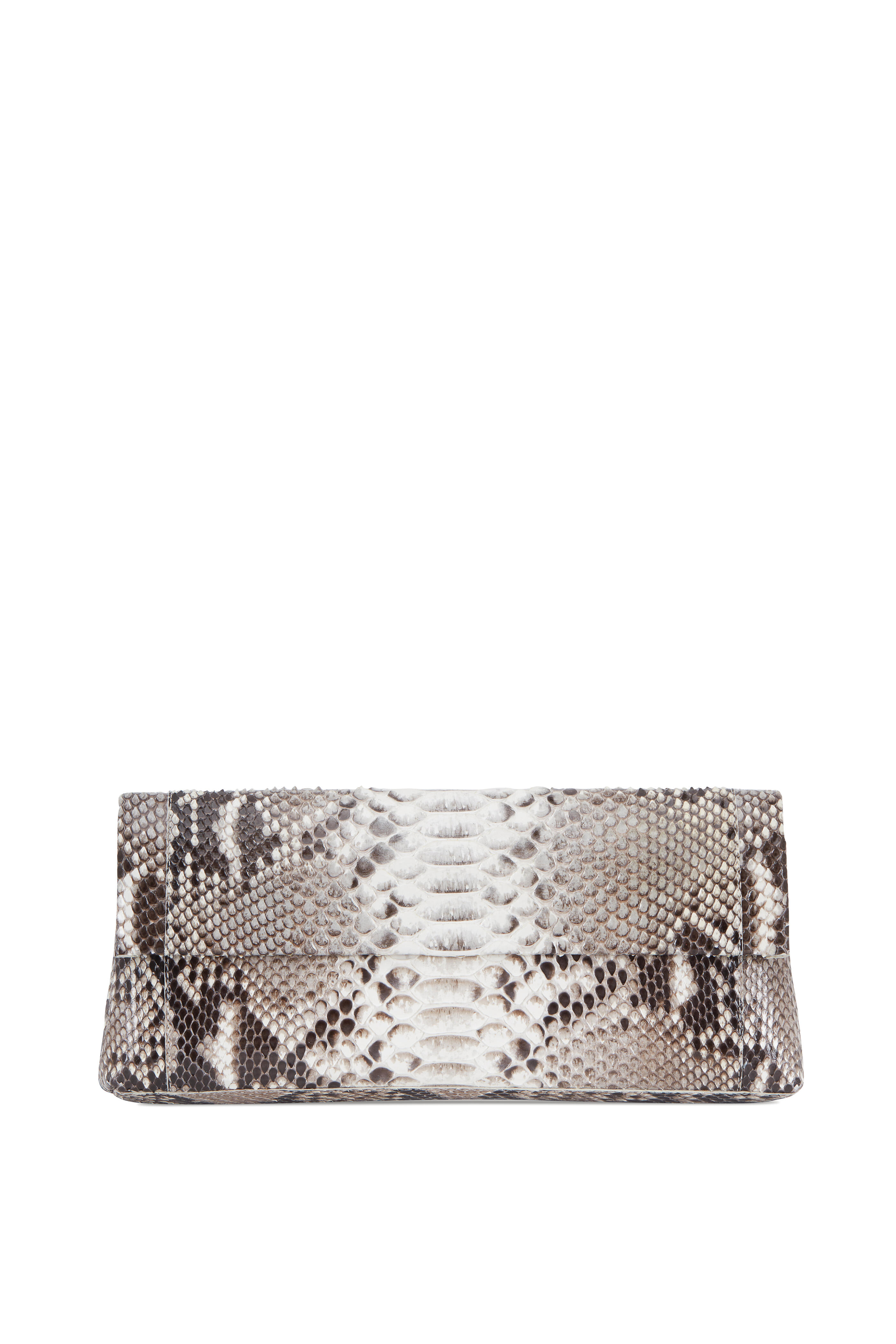 Natural python. Flap front, magnetic snap closure. Exterior back slip pocket. Interior center zip compartment, two open compartments. One interior slip pocket. Lined in suede. Made in Colombia. Width: 11". Height: 5". Depth: 2".