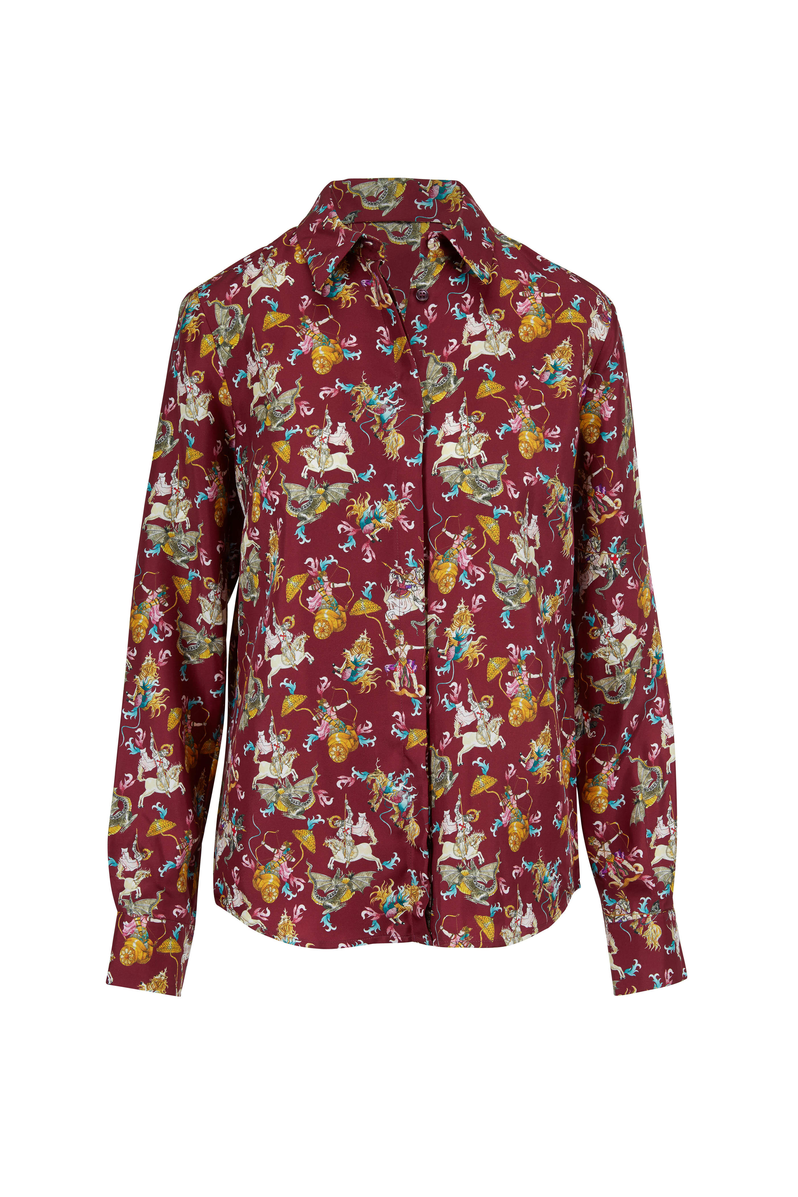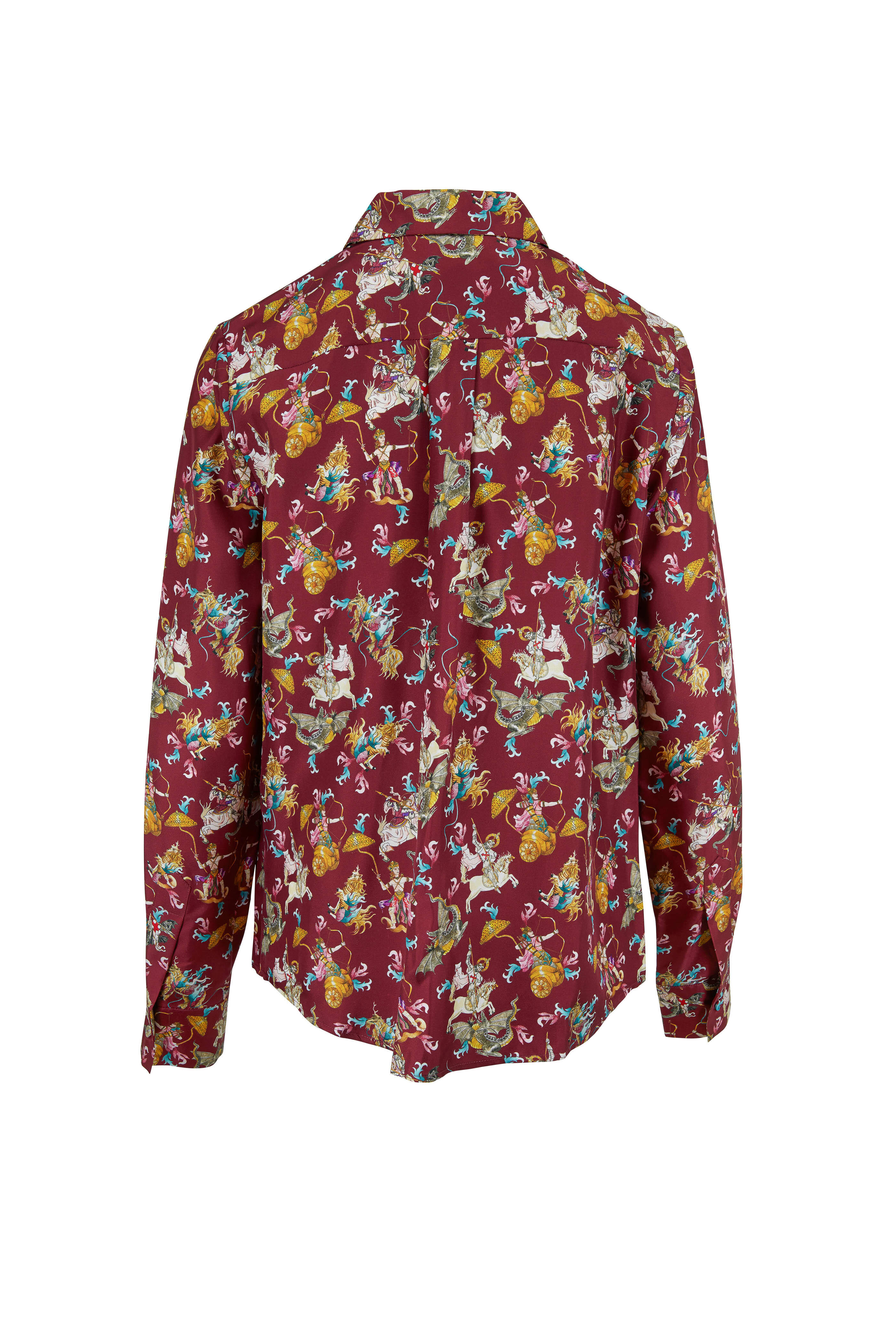 Spread collar. Concealed button front placket. Inverted back pleat. Single button squared cuffs. Made in Italy. 100% silk. Dry clean.