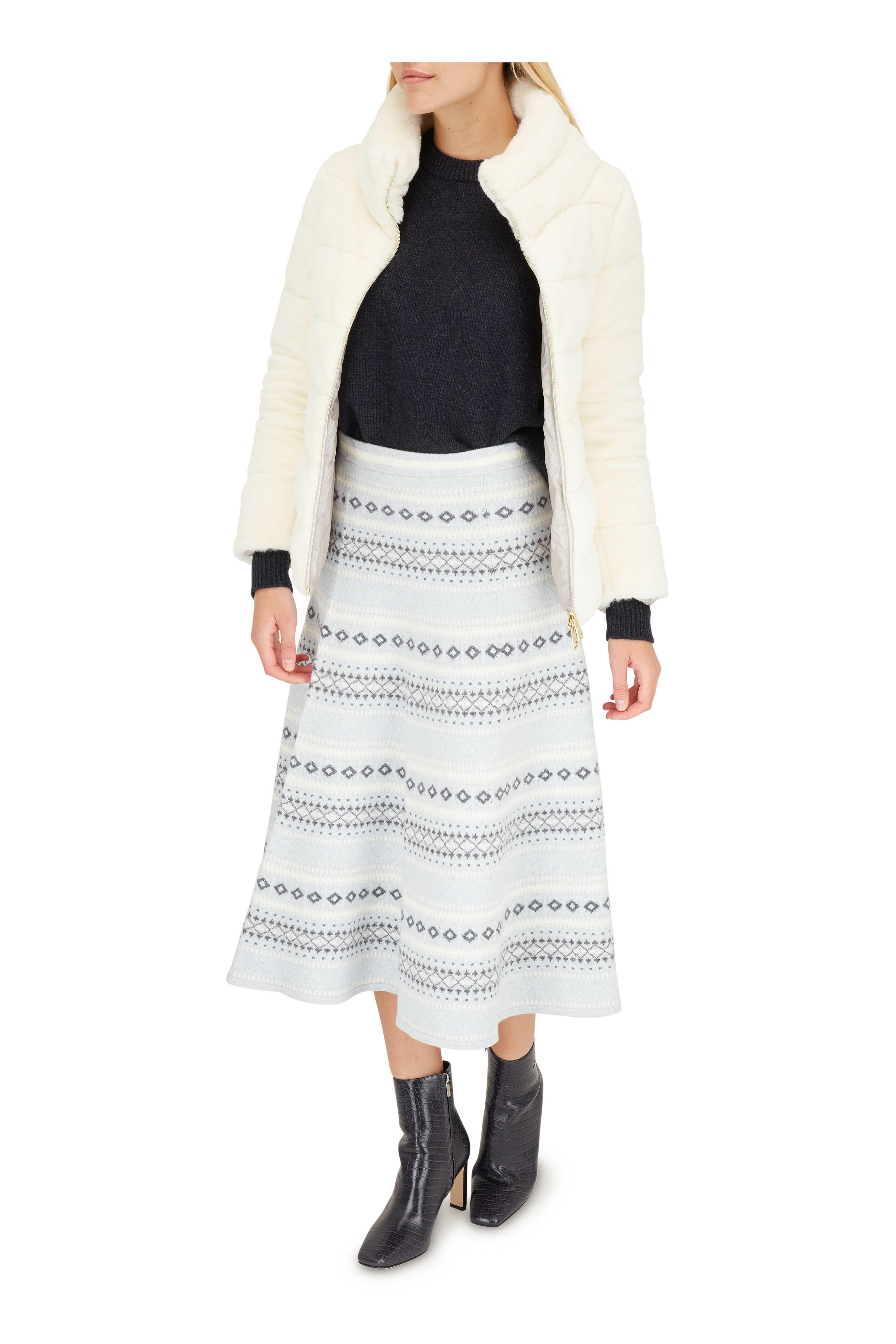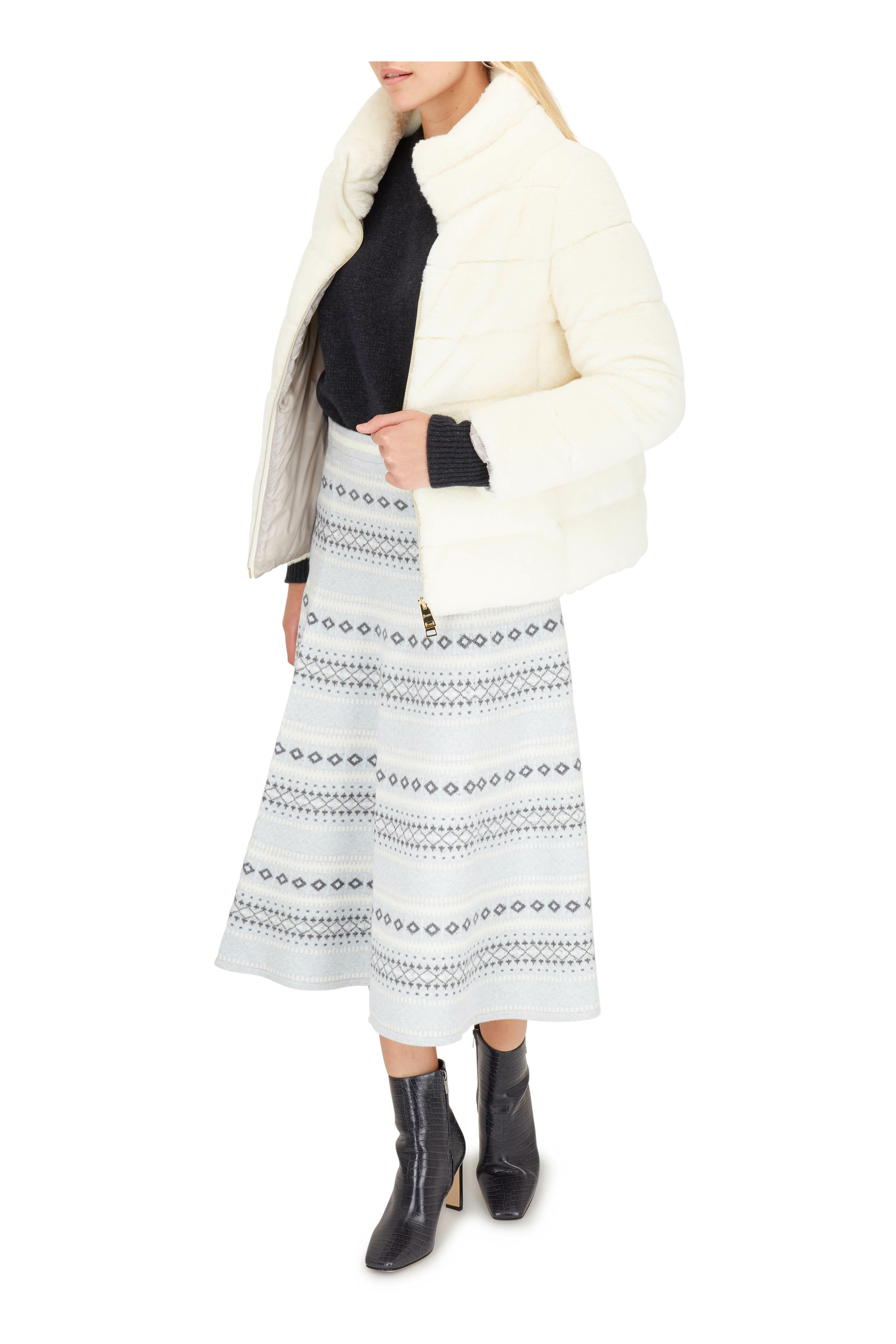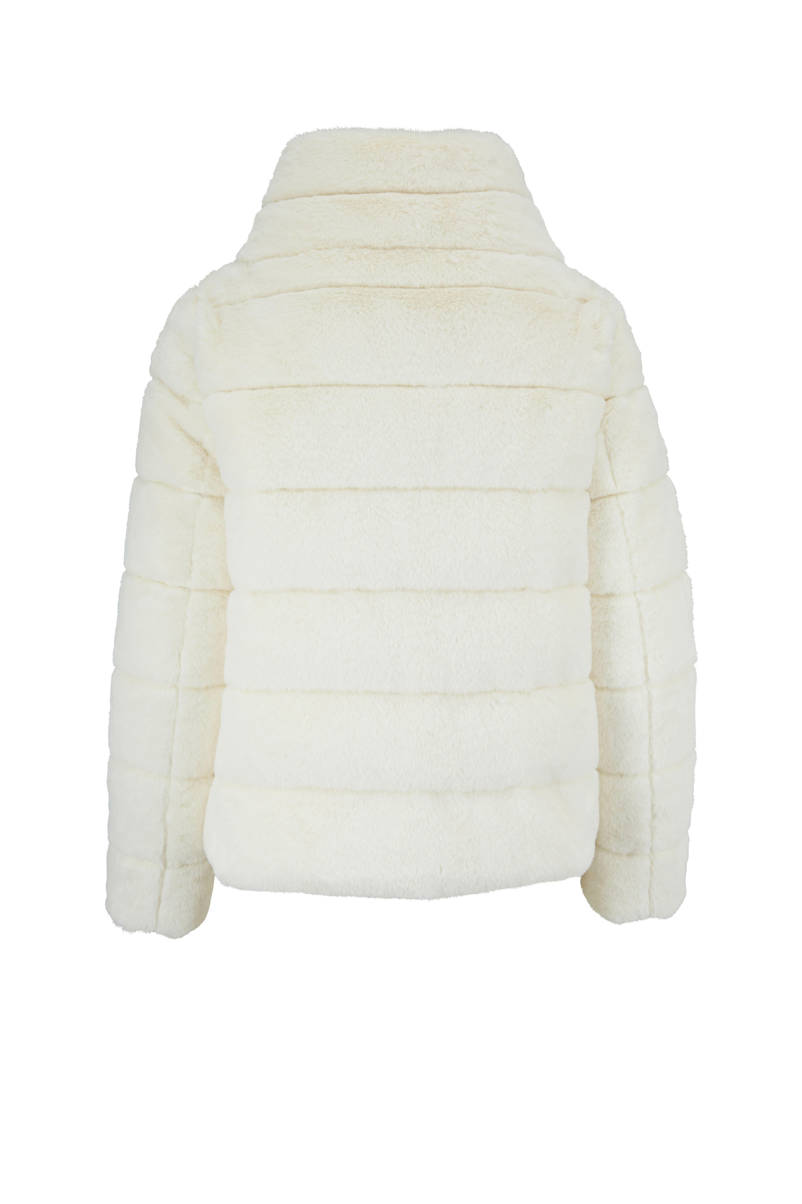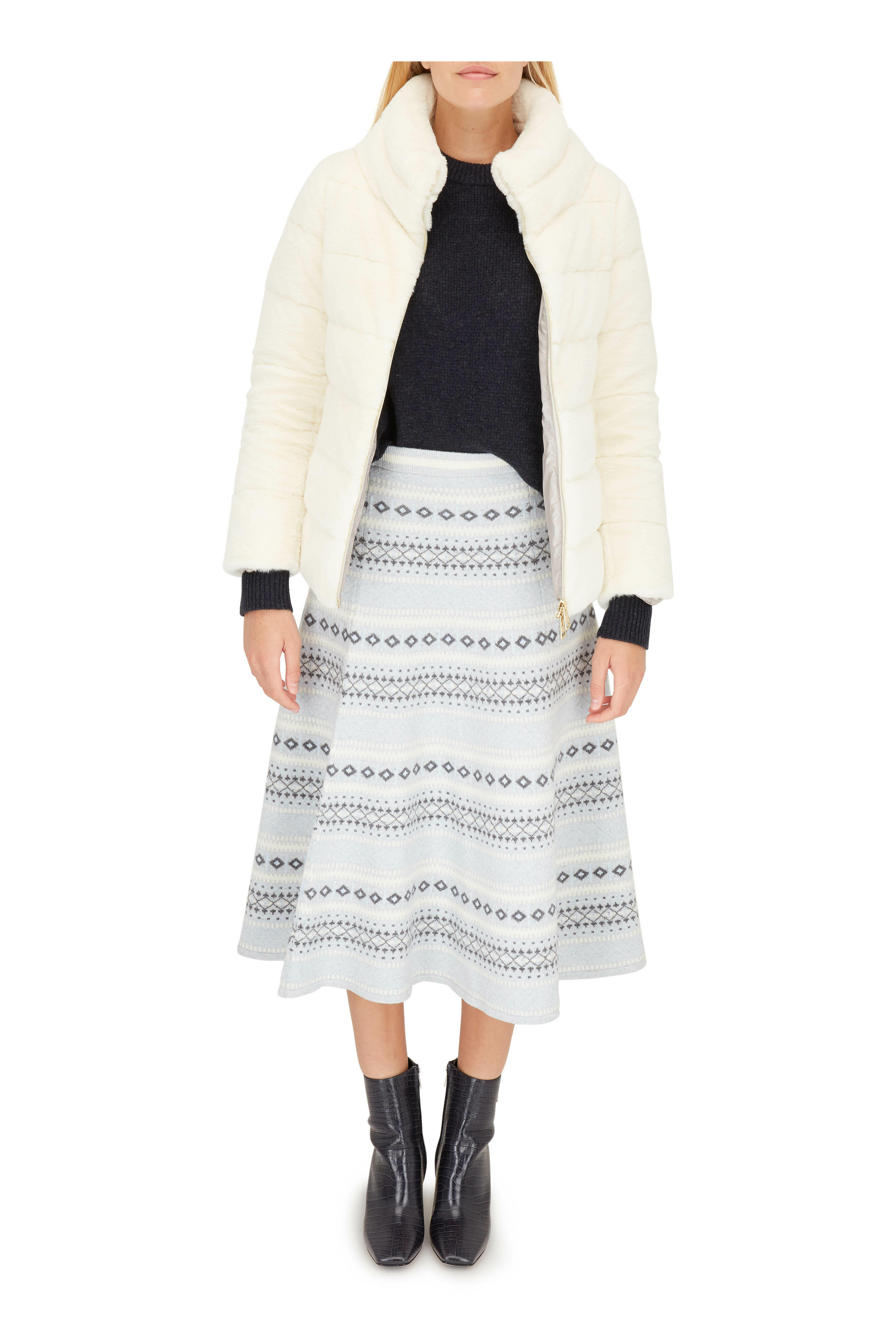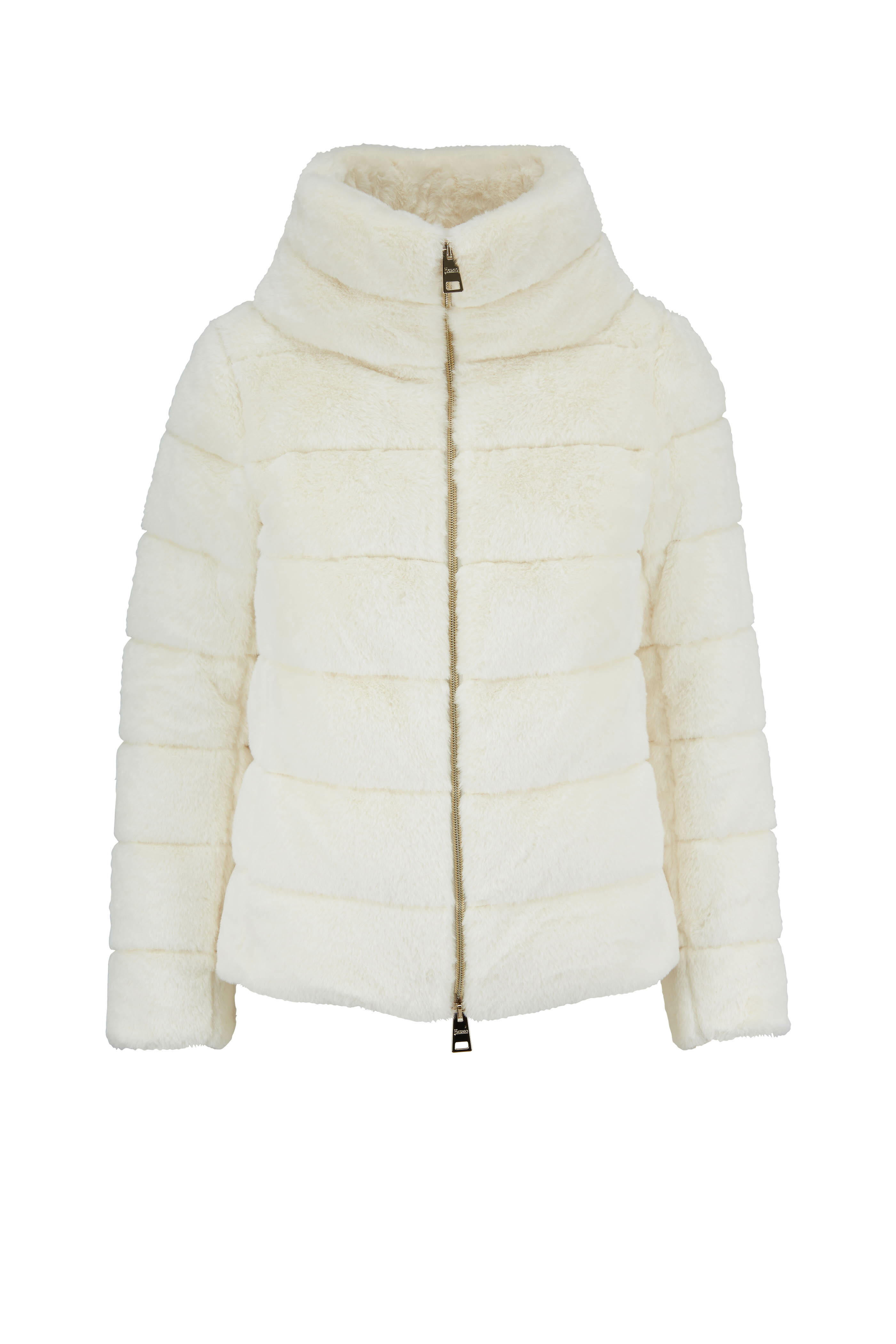 Funnel collar. Front two-way zip. Lower side seam pockets. Imported. 100% polyester; filling: 80% goose down, 20% feathers. Dry clean.