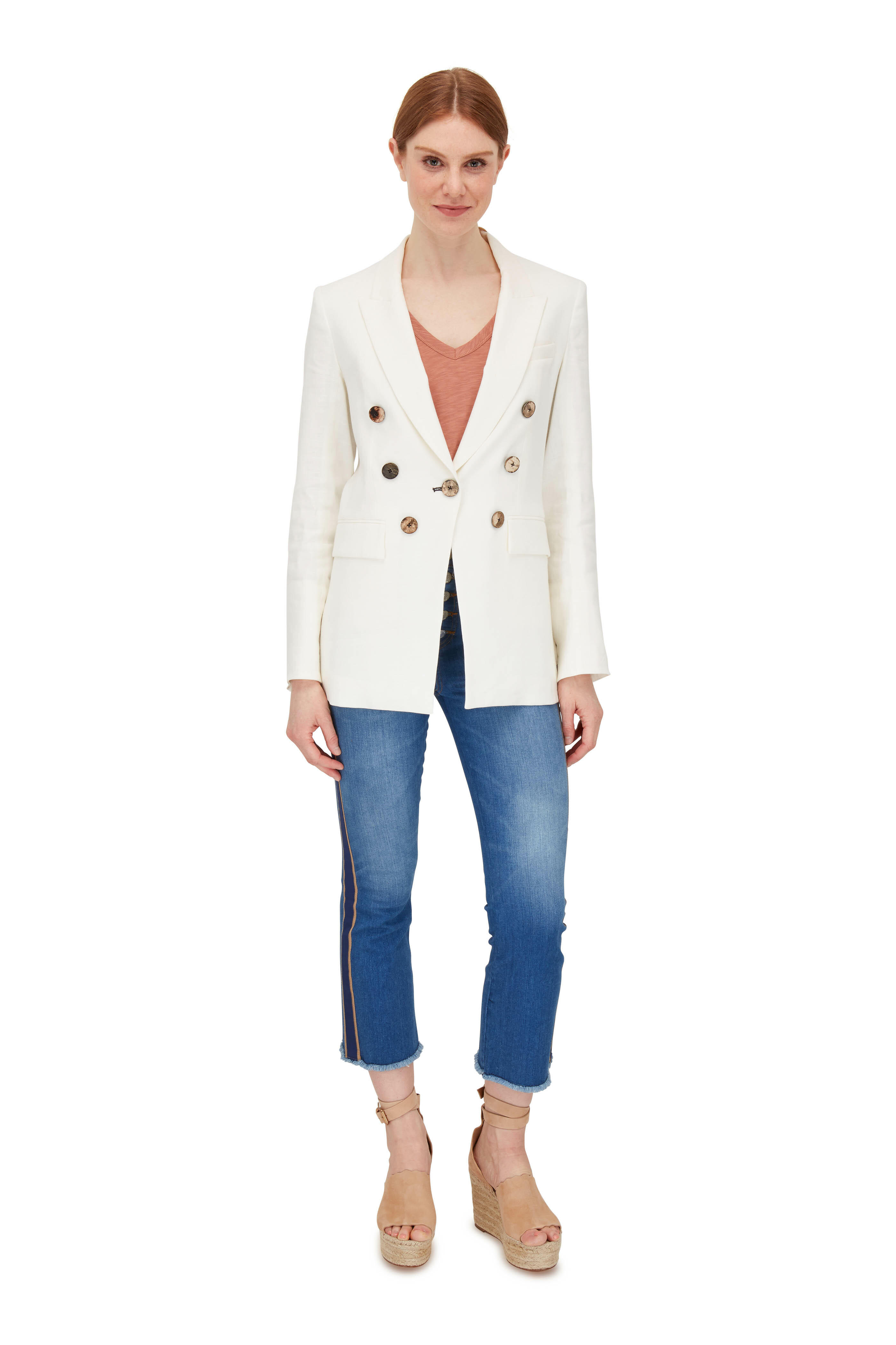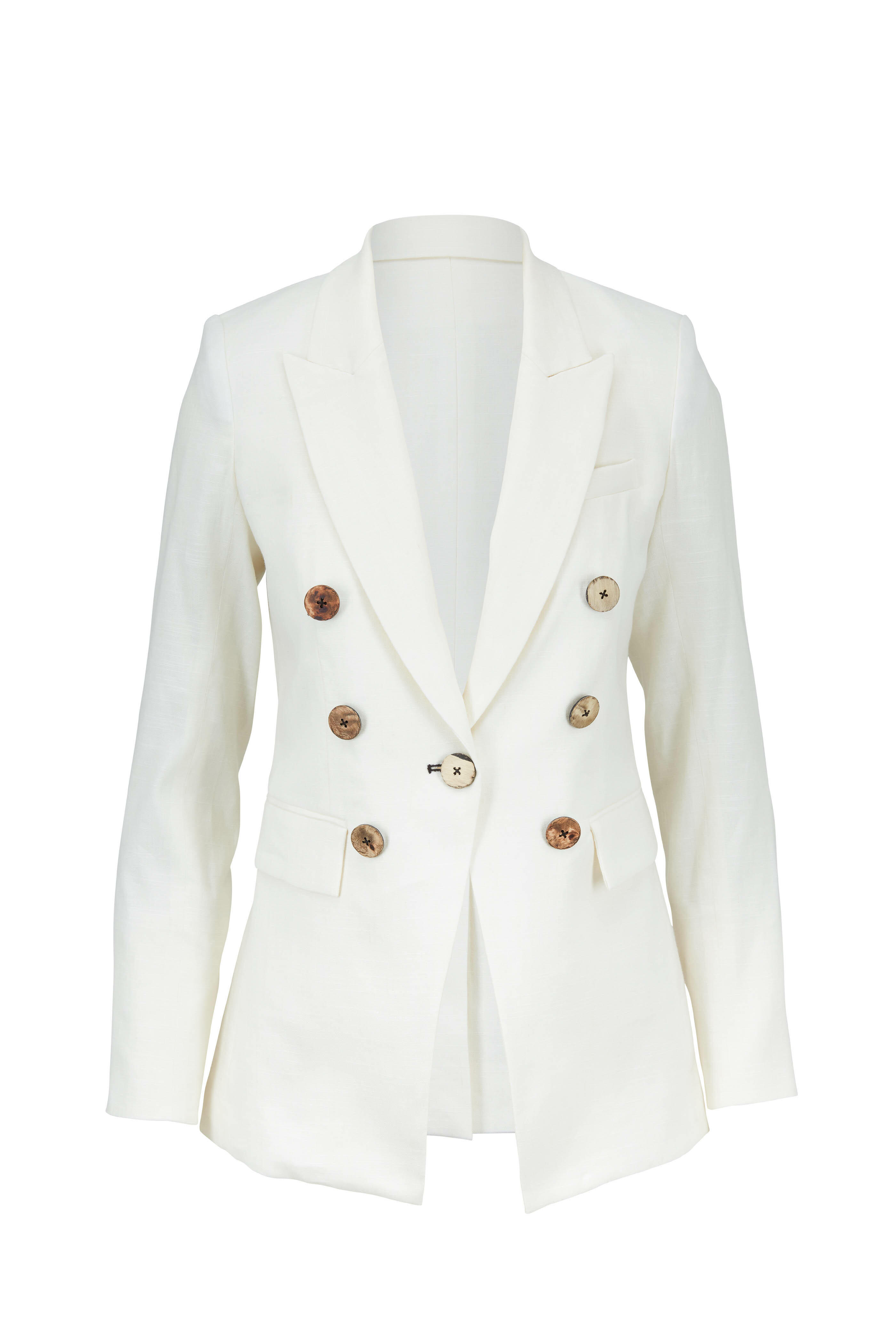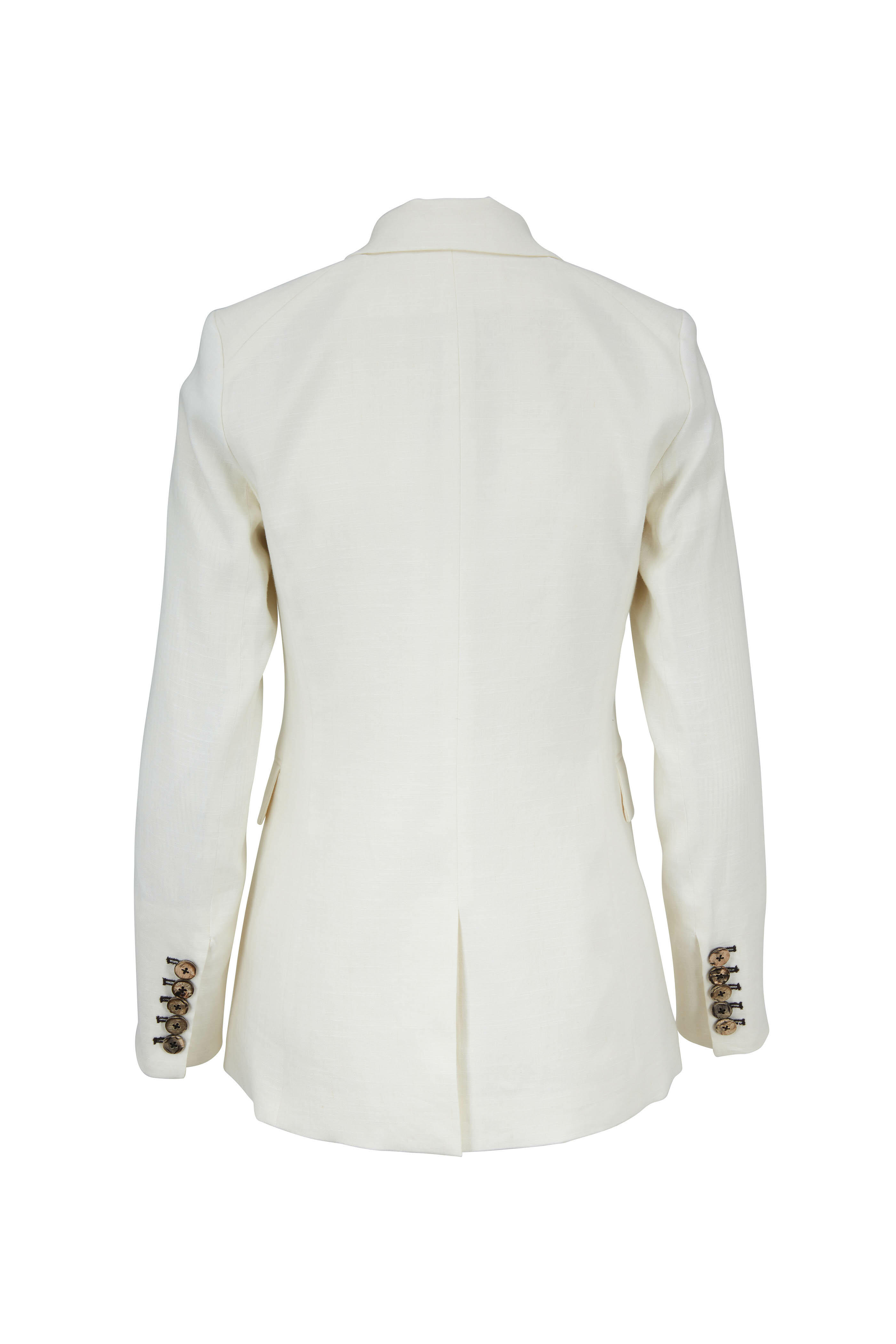 Peak lapels. Single button front closure. Lower front flap pockets. Single back vent. Imported. 55% linen, 43% viscose, 2% elastane; fully lined. Dry clean.