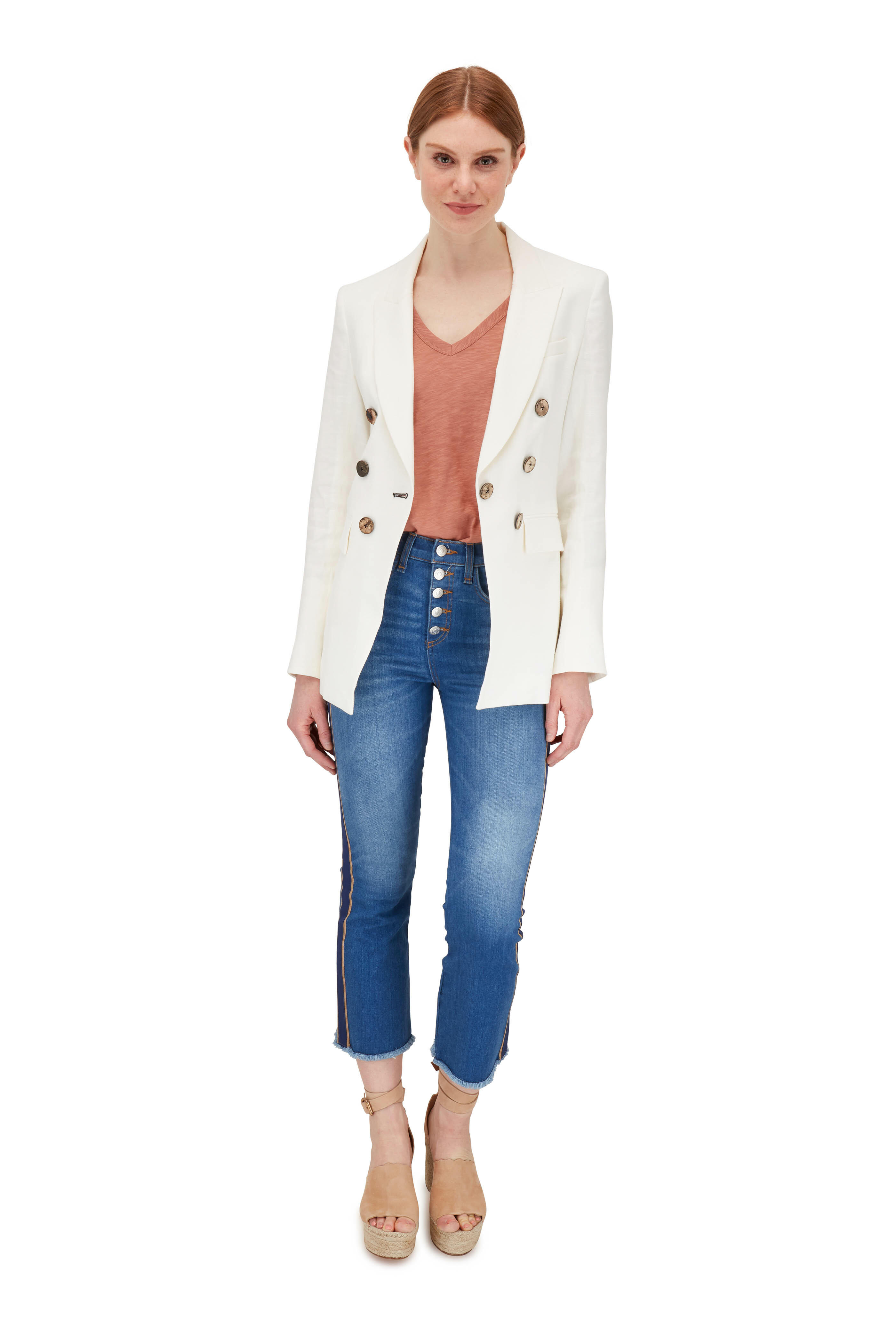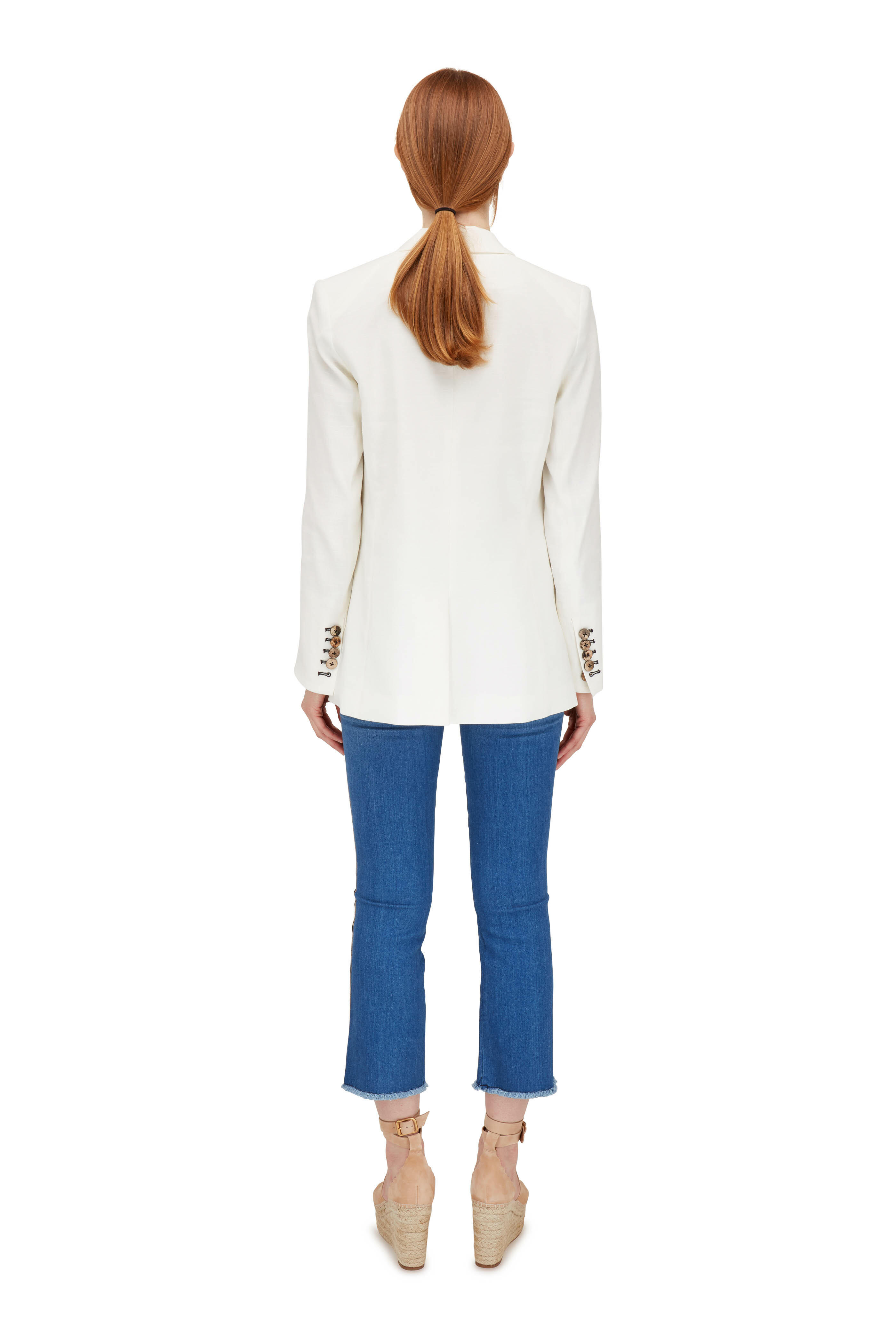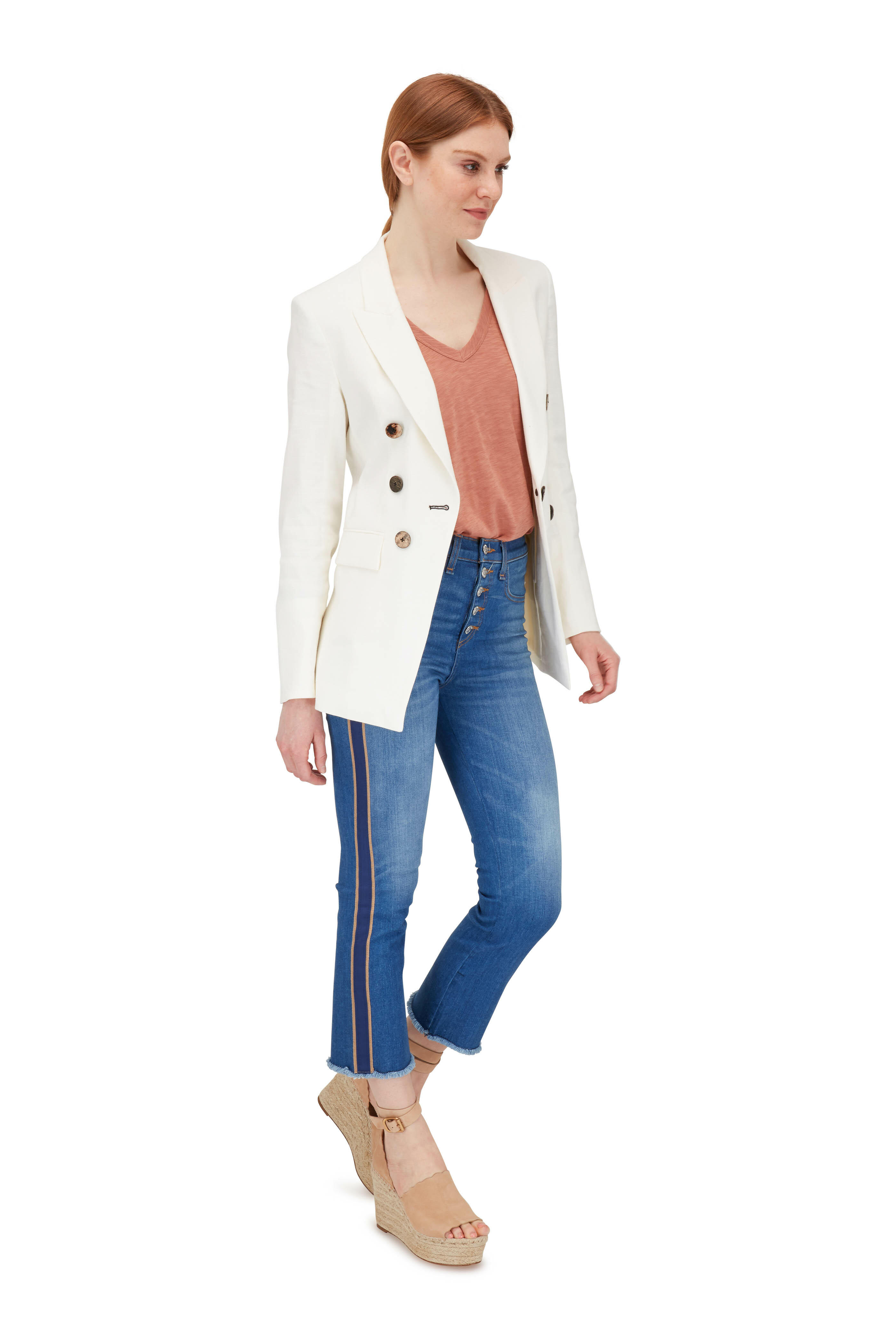 Peak lapels. Single button front closure. Lower front flap pockets. Single back vent. Imported. 55% linen, 43% viscose, 2% elastane; fully lined. Dry clean.
