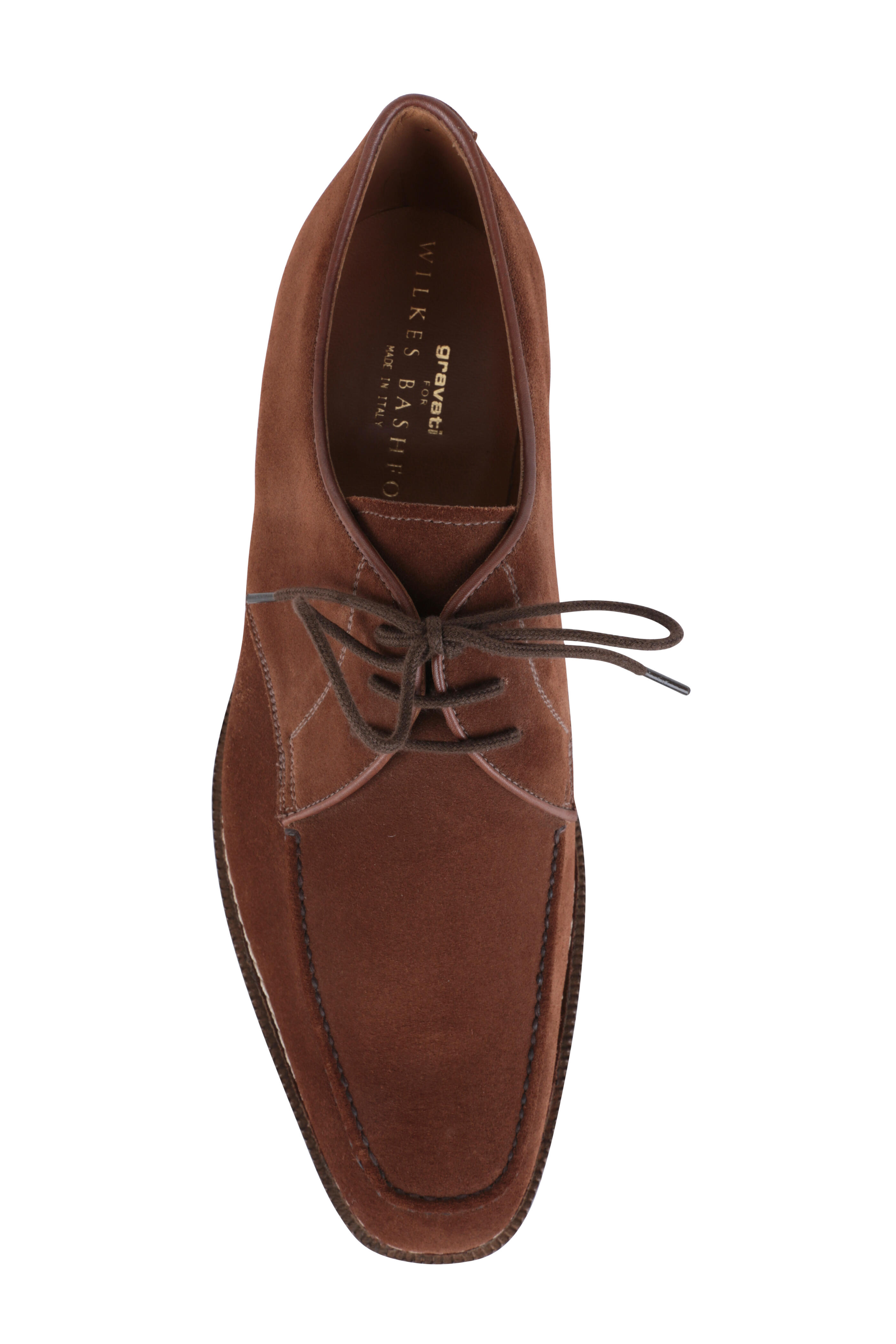 Suede upper. Tapered toe. Three eyelet lace up closure. Leather lining and insole. Stacked heel. Goodyear rubber sole. Made in Italy. 23/25 moustache sole goodyear construction.