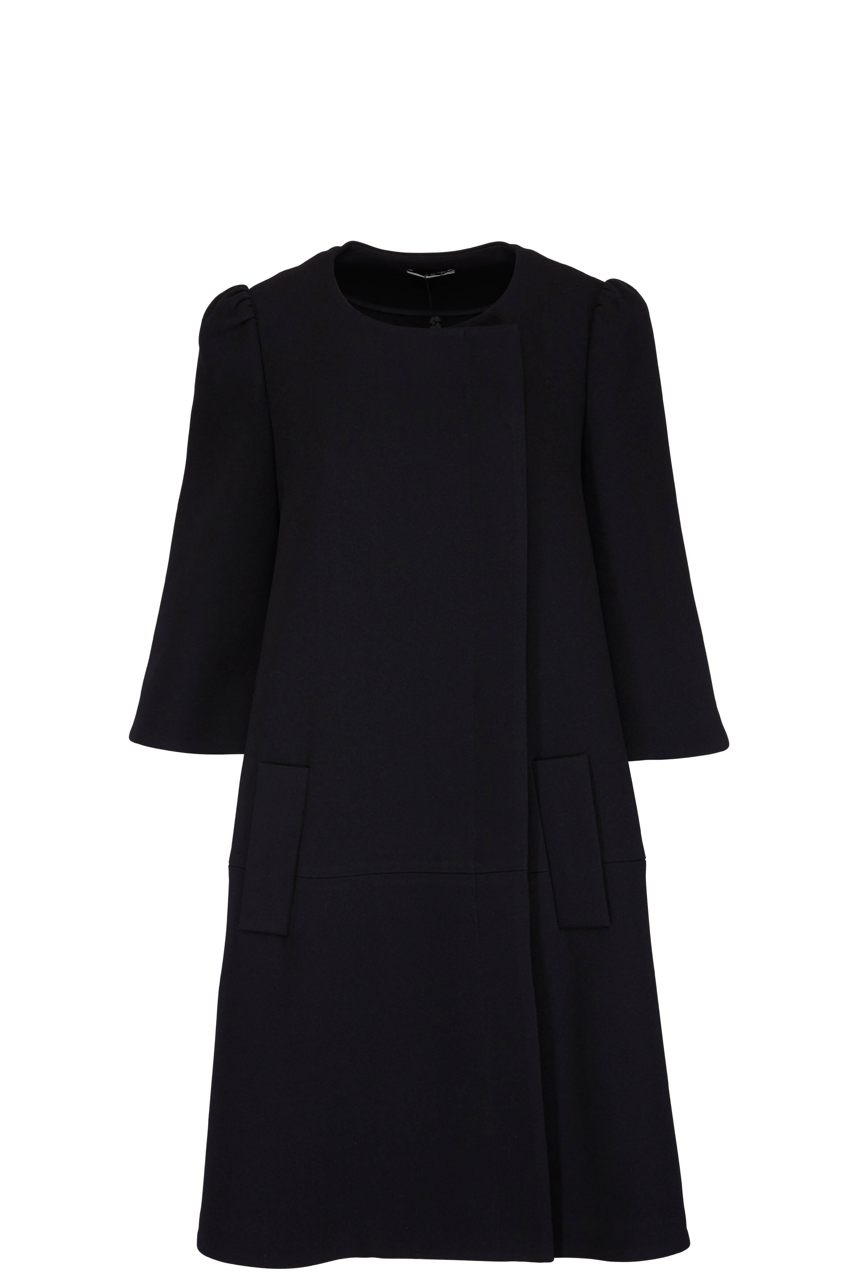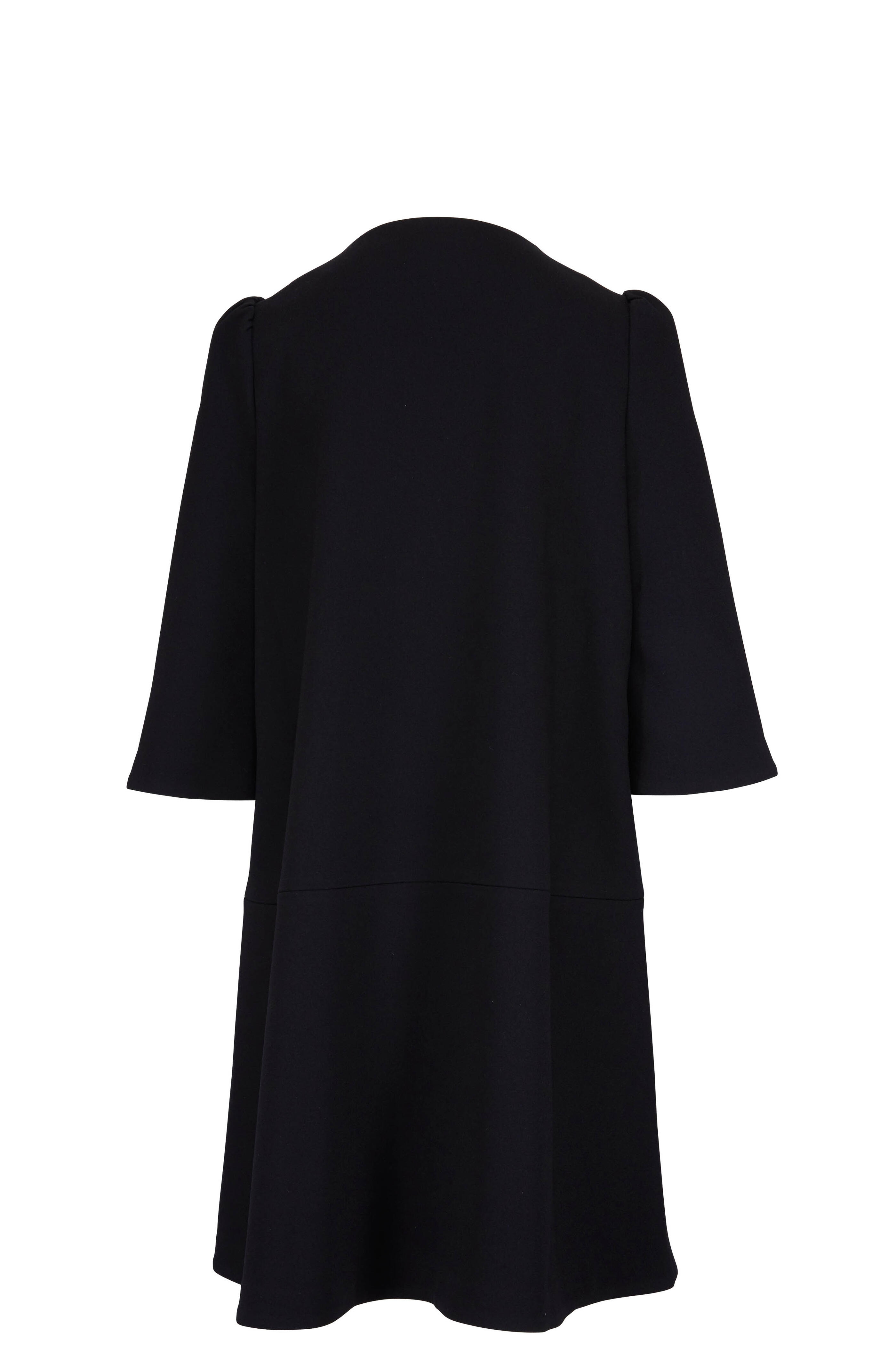 Jewel neckline. Asymmetric concealed button-up closure. Three-quarter length bell sleeves. Front slip pockets. Imported. Shoulder to hem: 39". 80% acetate, 20% polyester. Dry clean.