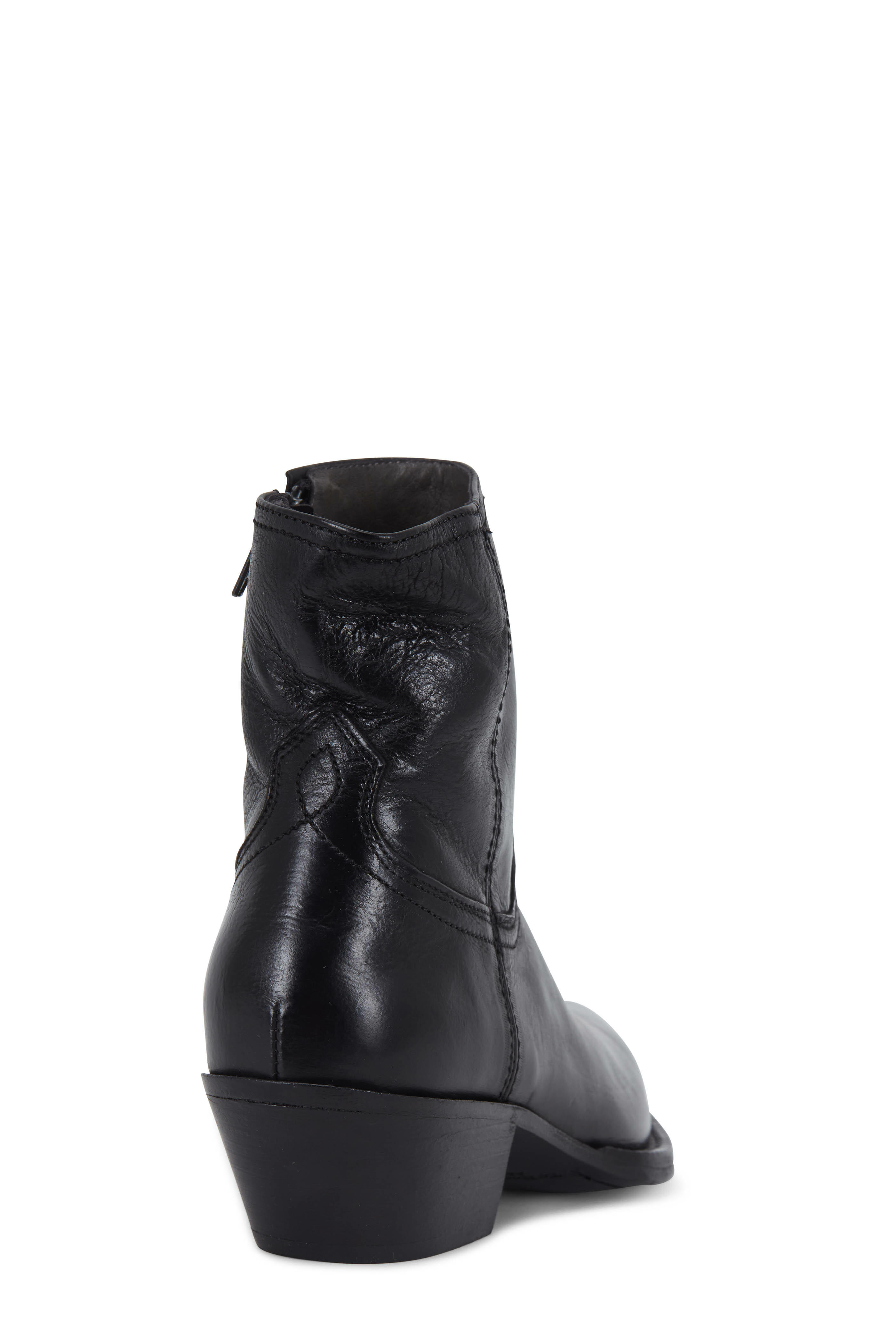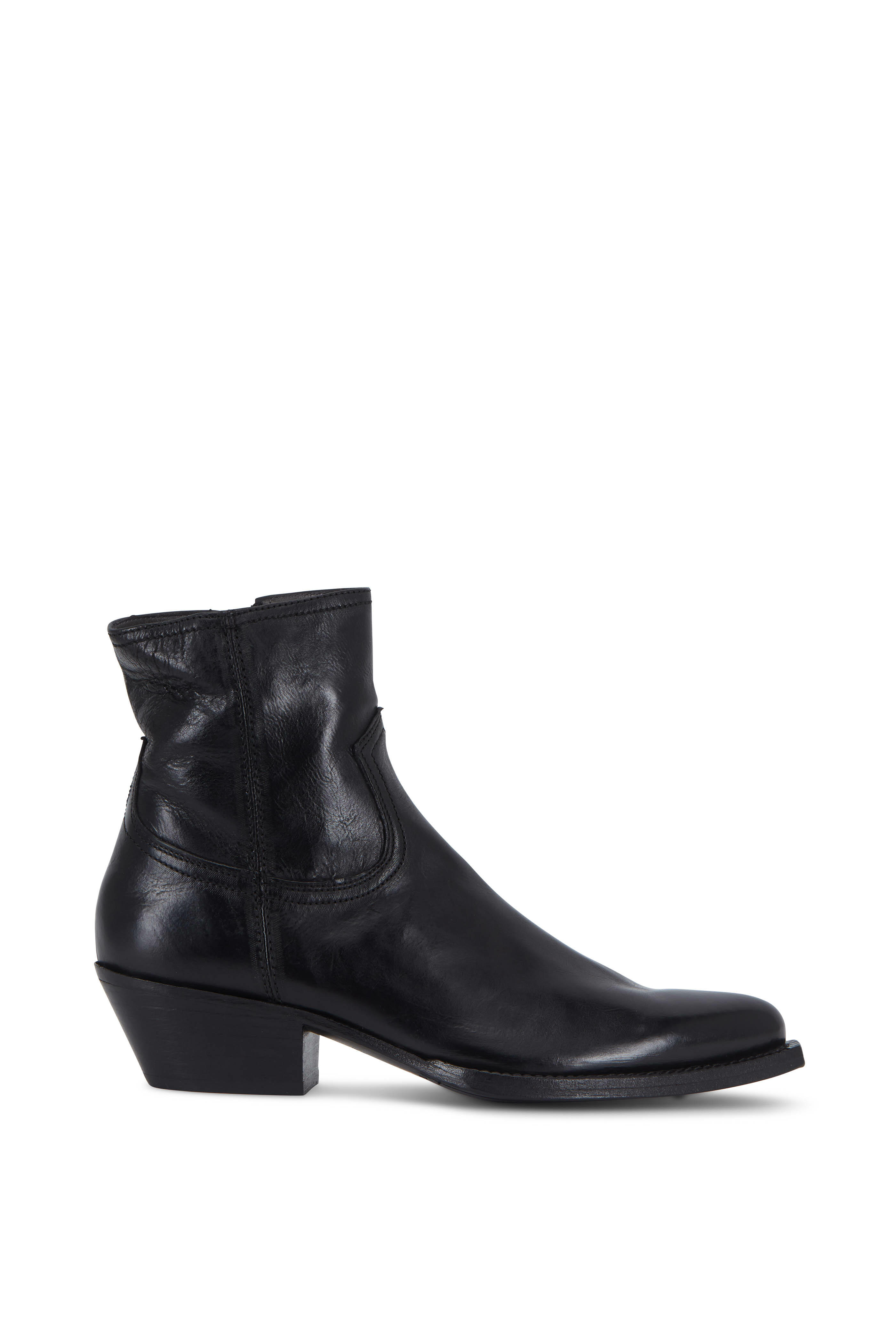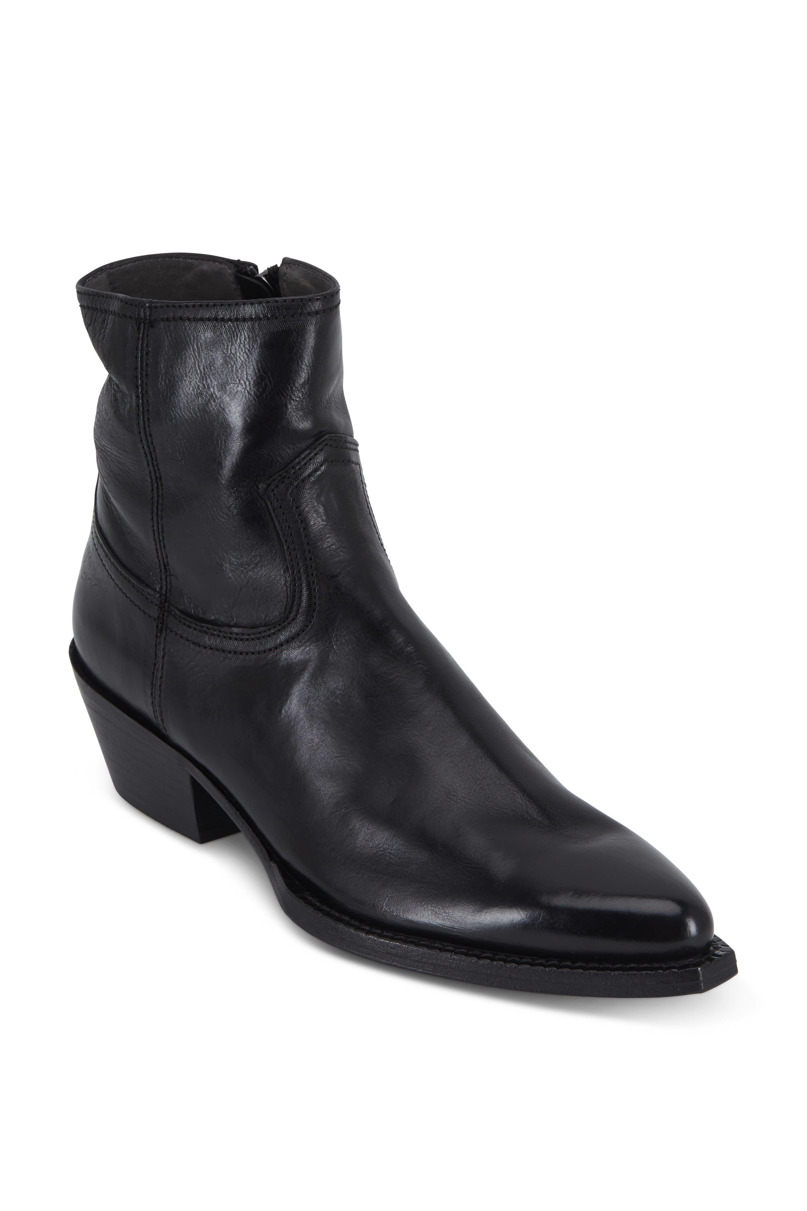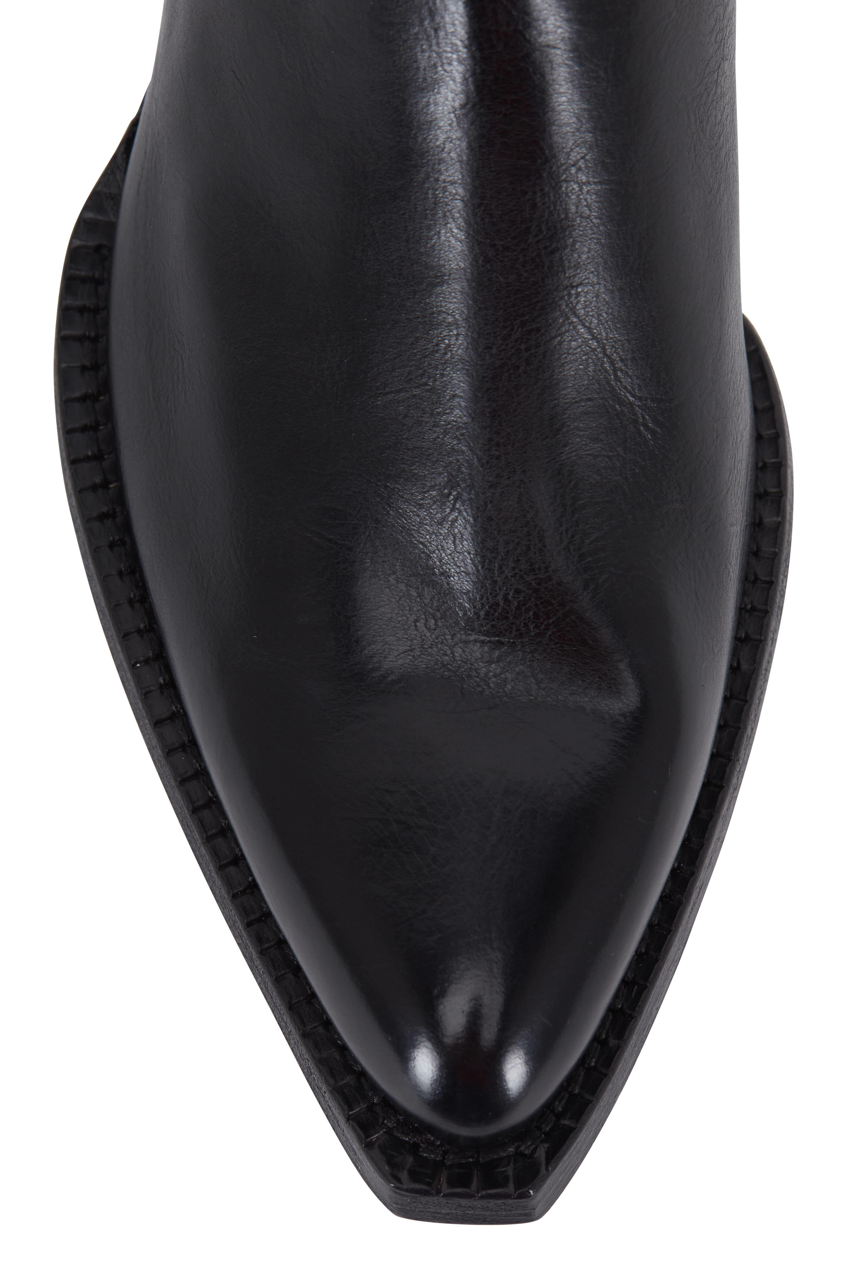 Calfskin leather upper. Pointed toe. Side zip closure. Leather lining and insole. Stacked wooden heel. Leather sole. Made in Italy.