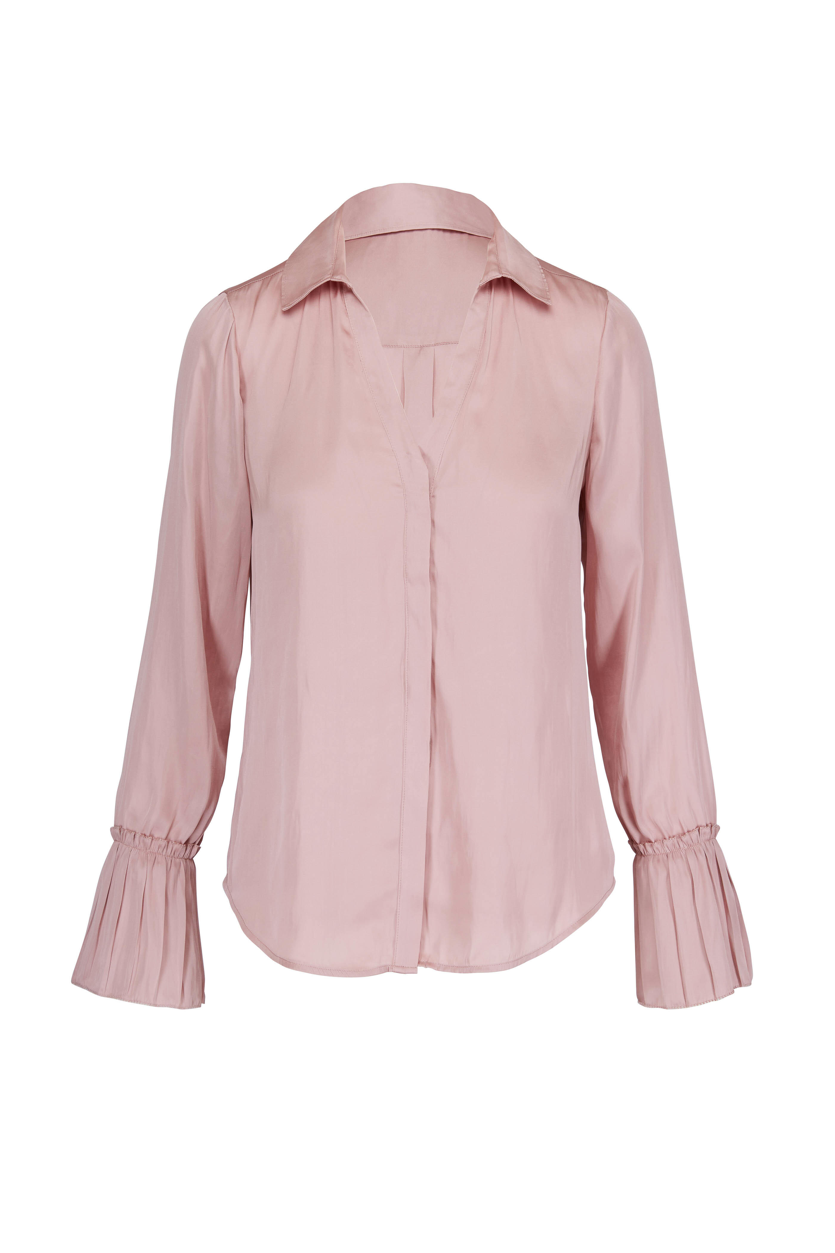Spread collar. V-neckline. Concealed button-up front closure. Ruffled bell cuffs. Imported. 100% polyester. Machine wash.