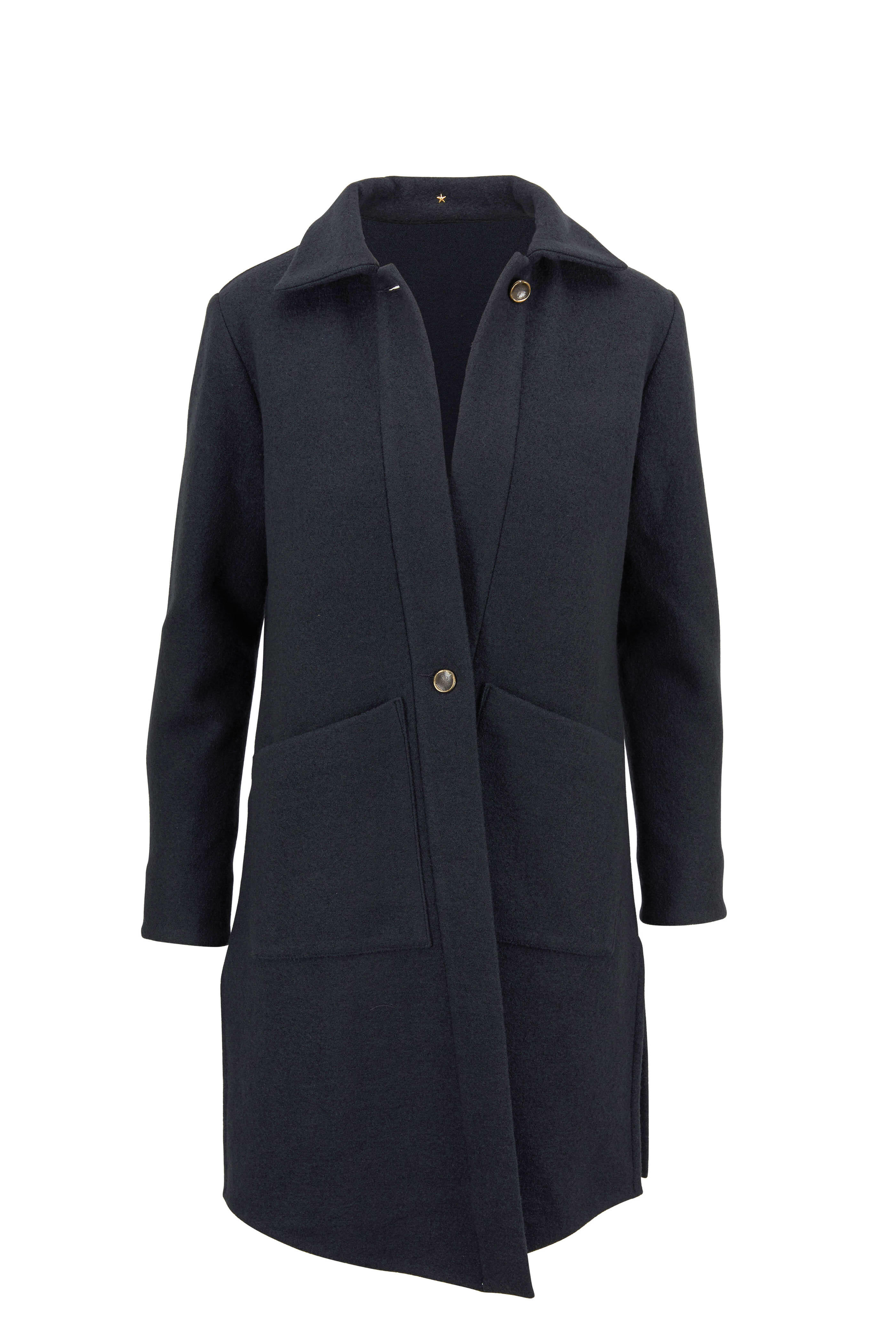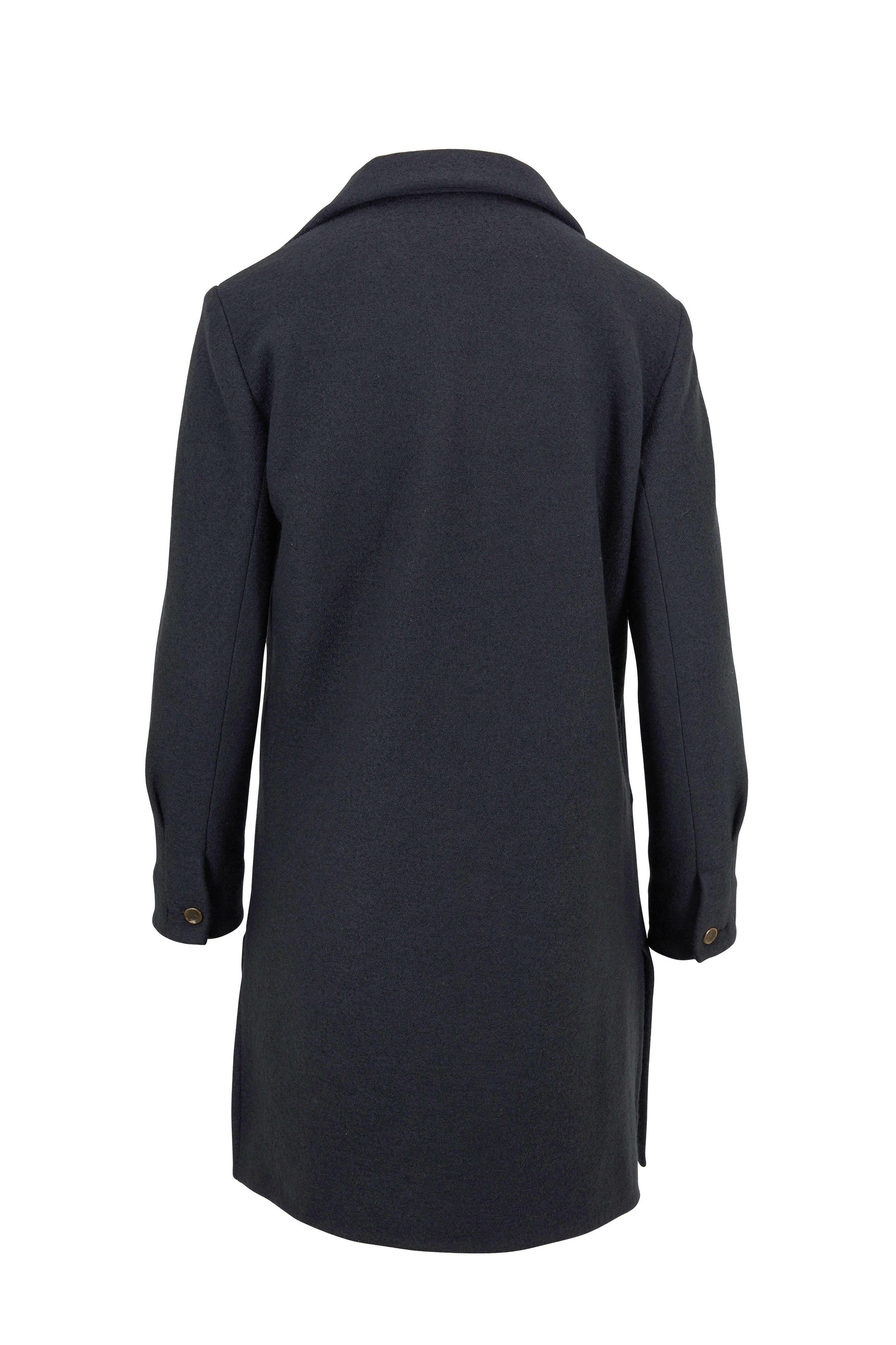 Spread collar. Single button closure. Lower patch pockets. Single button cuffs. Split hem. Made in the USA. 100% wool. Dry clean.