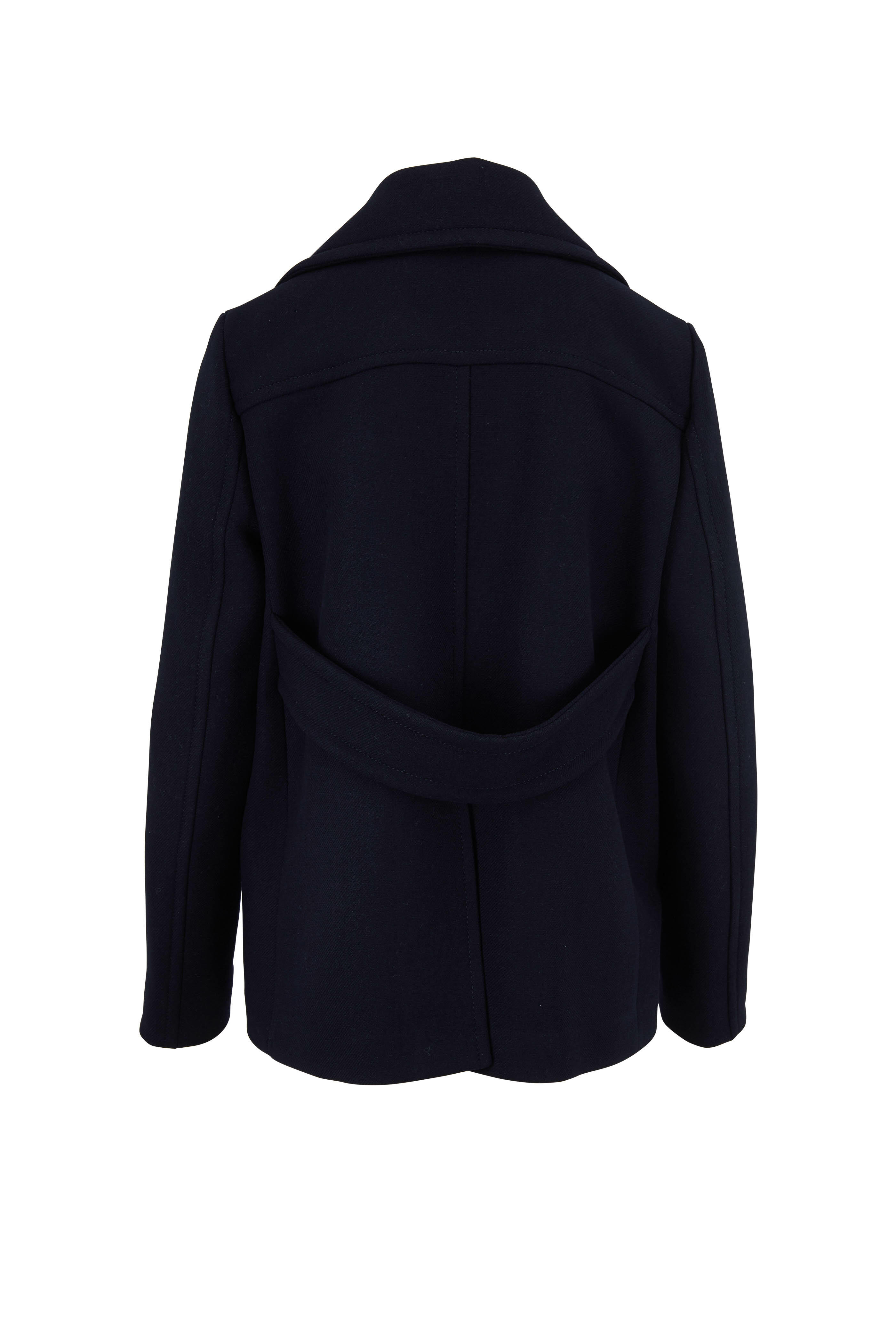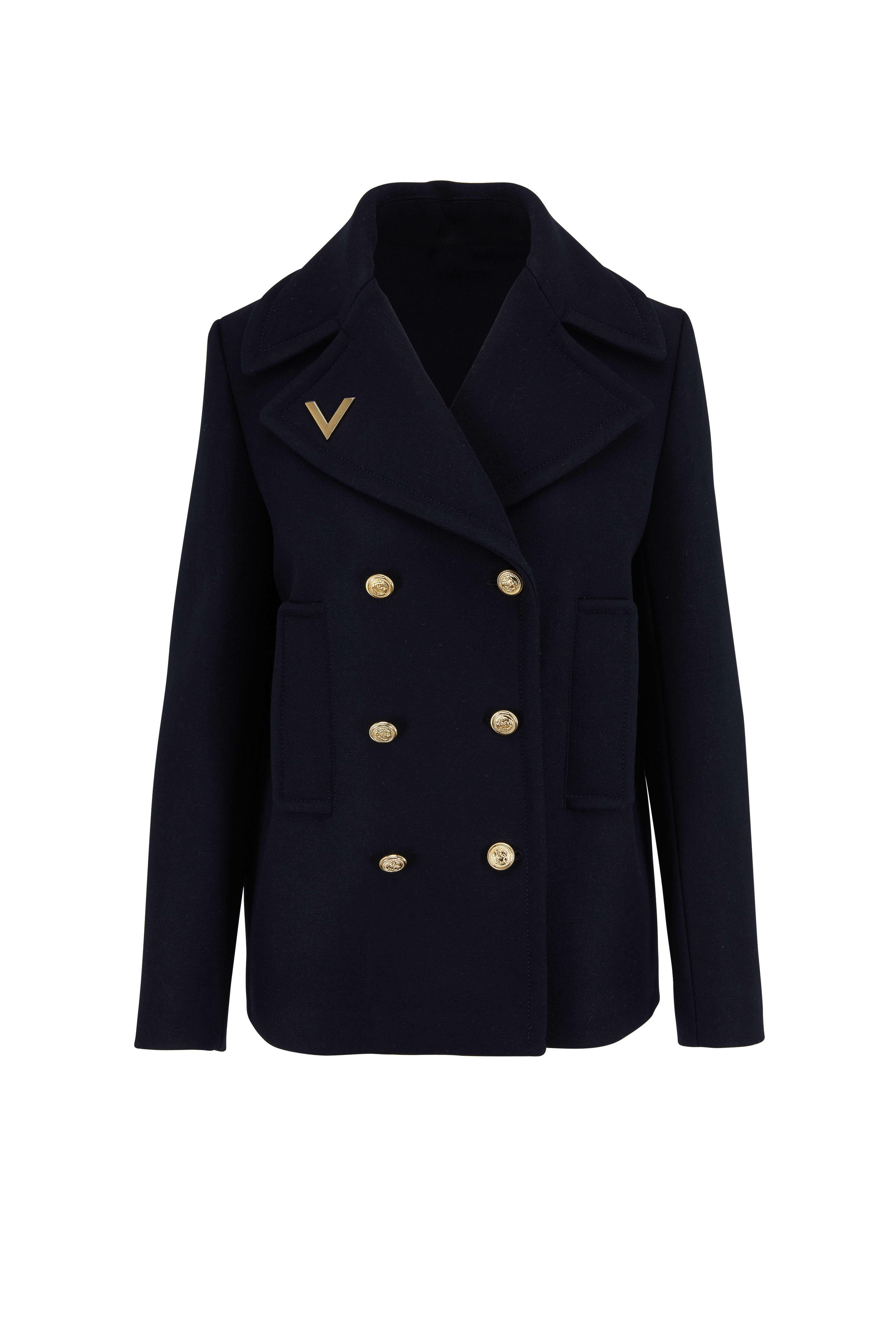 Notched lapels. Double-breasted button closure. Lower slip pockets. Back vent. Back attached martingale half-belt. Gold-tone V logo detail. Made in Italy. 100% wool. Dry clean.