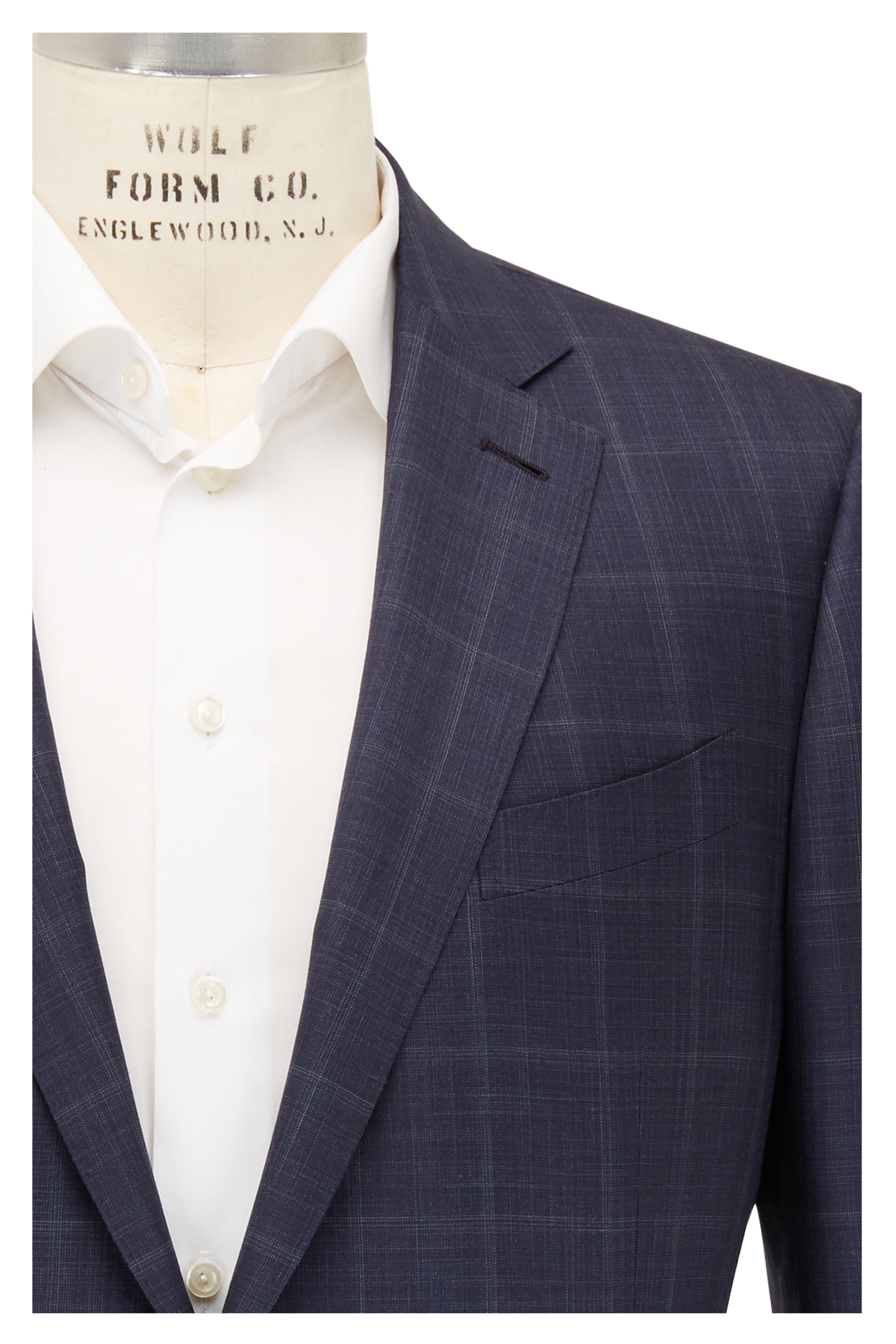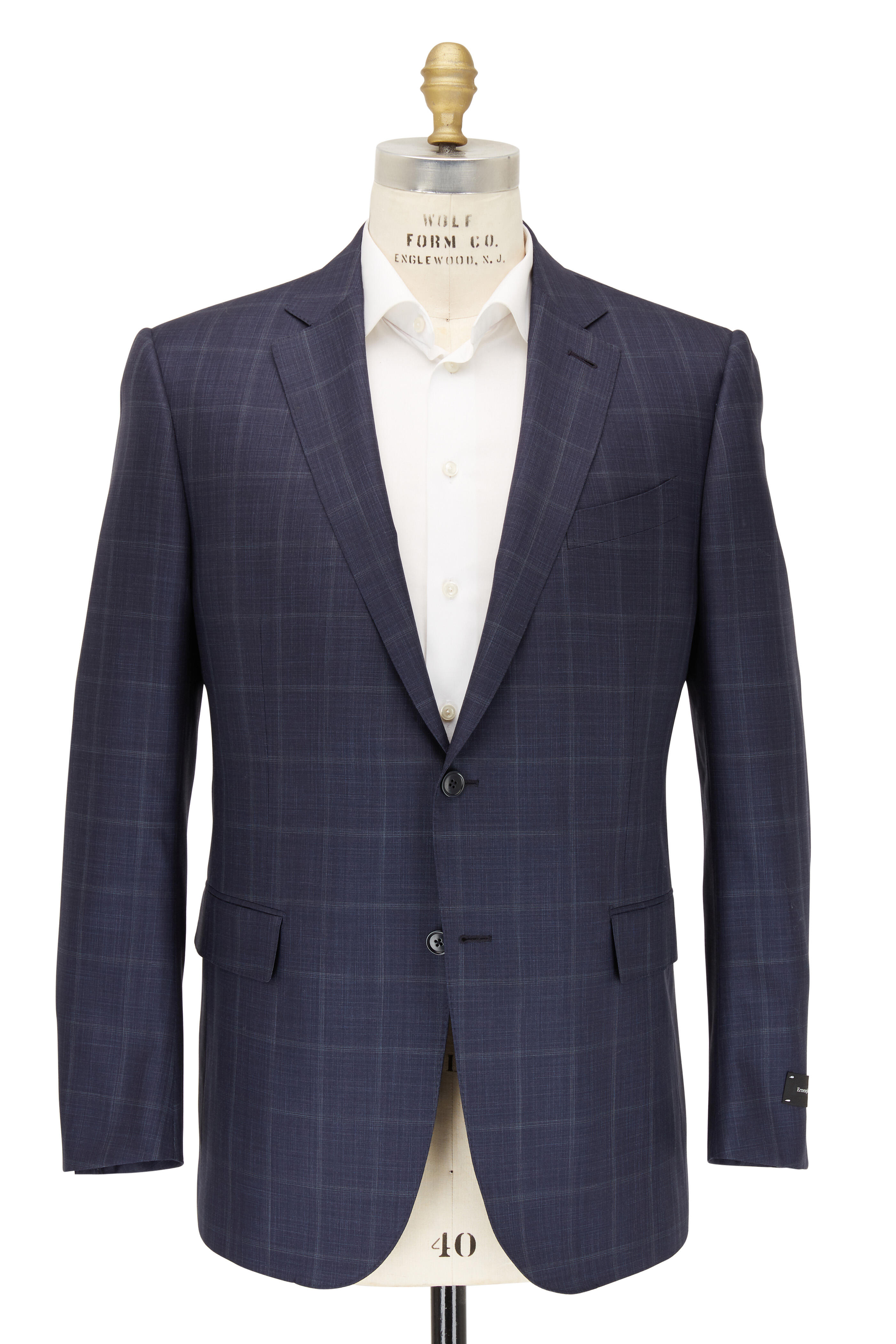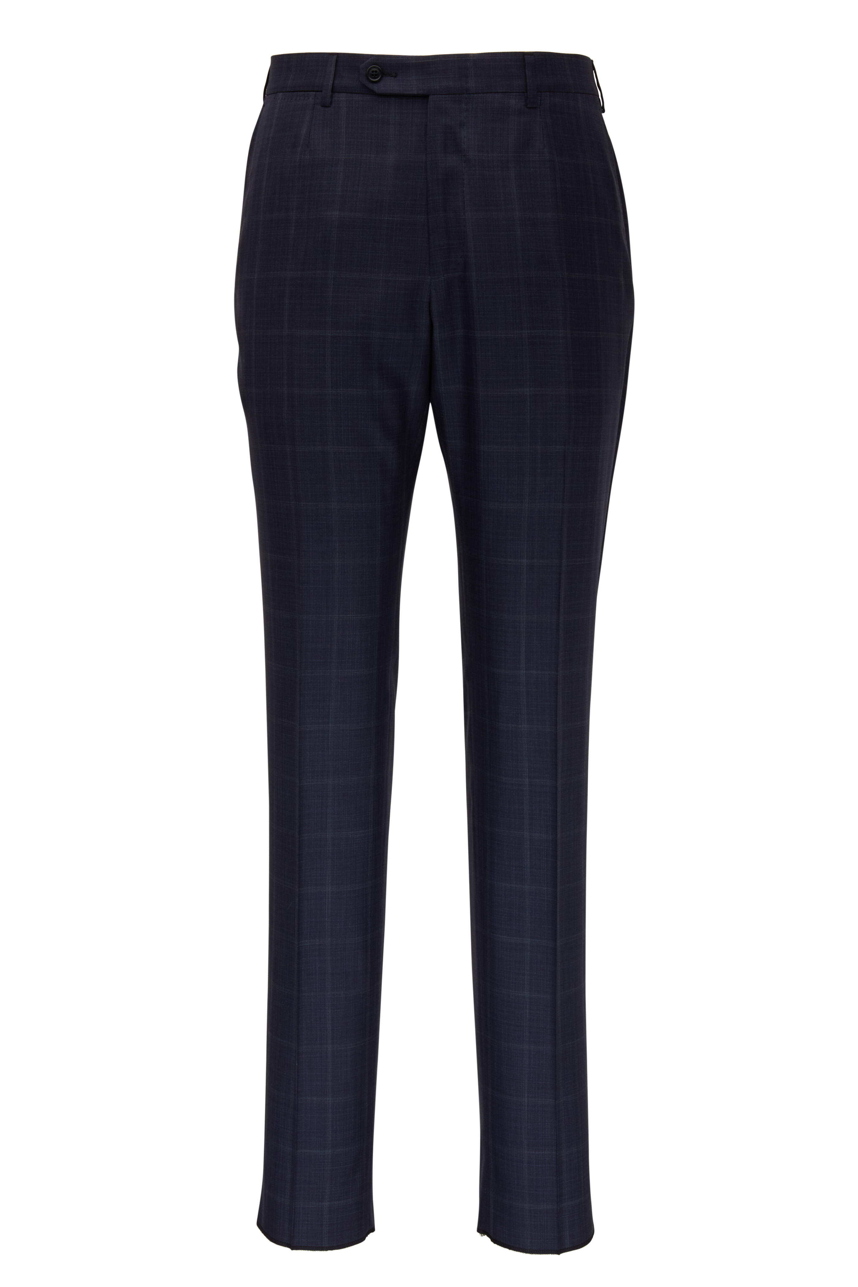 Imported. Jacket: Fully lined. Notched lapels. Front two button closure. Lower flap pockets; chest welt pocket. Double vent. Pant: Banded waist; belt loops. Front slip pockets; back besom pockets. Unfinished hem. 85% wool, 15% silk; lined. Dry clean.
