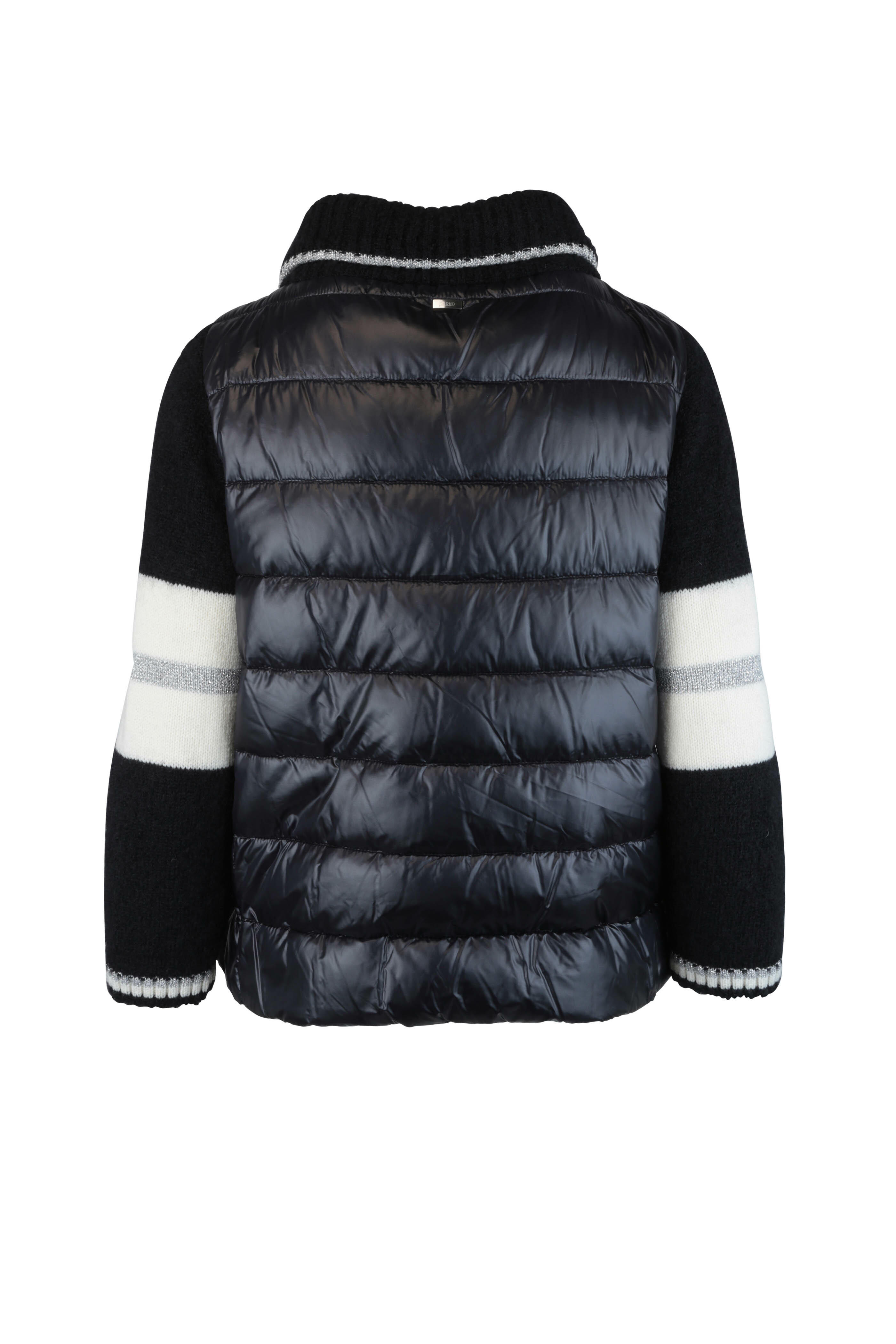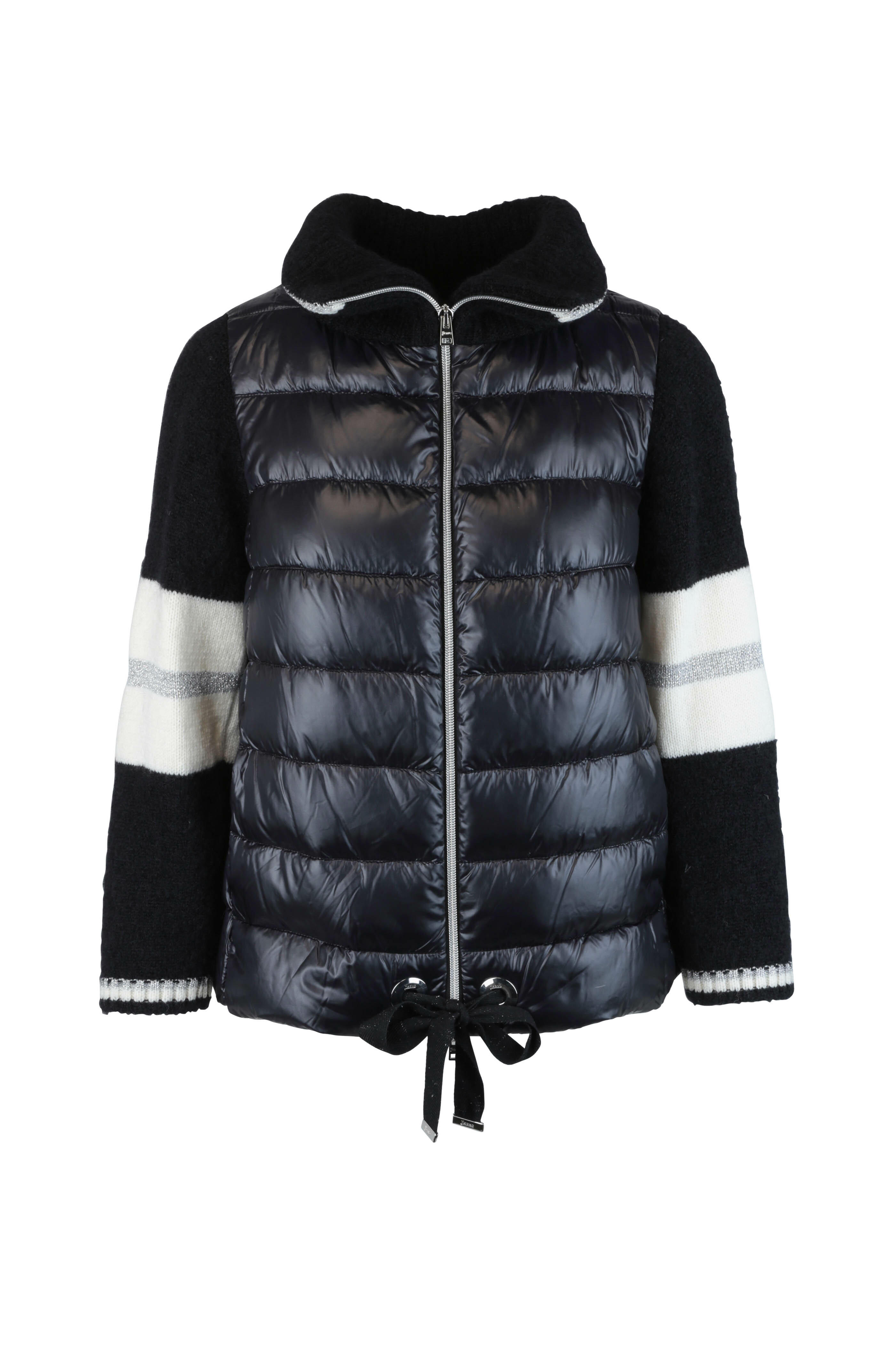 Fold down collar. Three-quarter sleeves. Two-way zip closure. Side slip pockets. Gros grain ribbon drawstring at hem. Imported. 100% polyamide; sleeves: 62% mohair, 14% wool, 12% nylon, 6% acrylic, 3% viscose, 2% elastane, 1% polyester. padding: 90% goose down, 10% goose feathers. Dry clean.