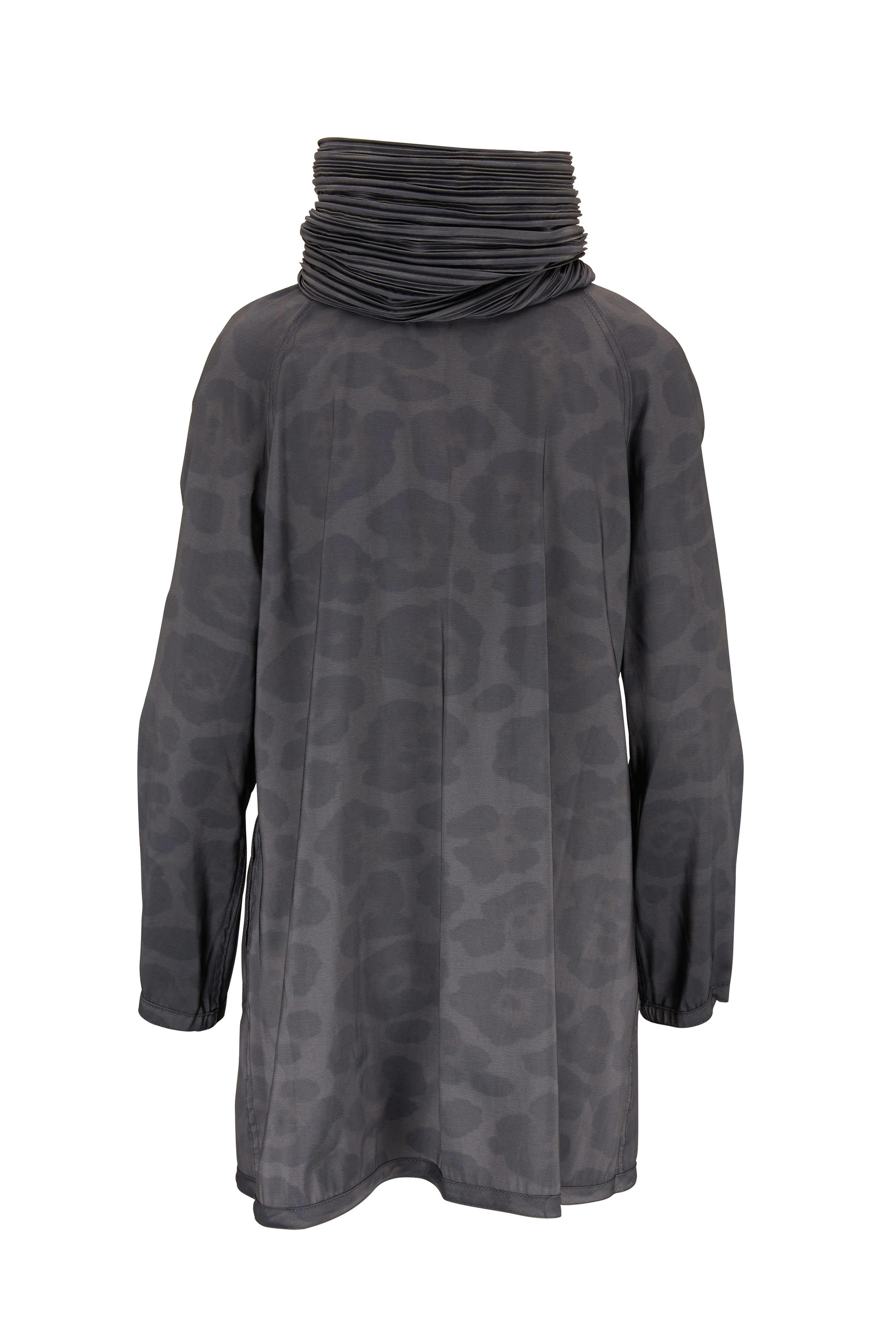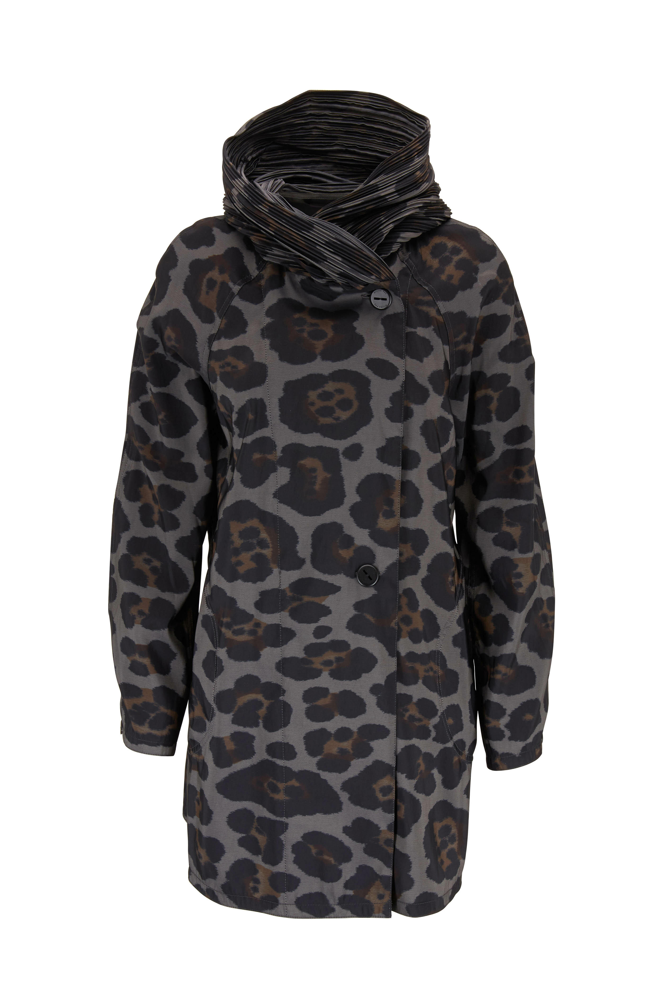 Pleated hood. Button placket. Adjustable single button cuffs. Lower slip pockets. Reversible lighter tonal animal print. Made in the USA. 55% nylon, 45% polyester. Machine wash.