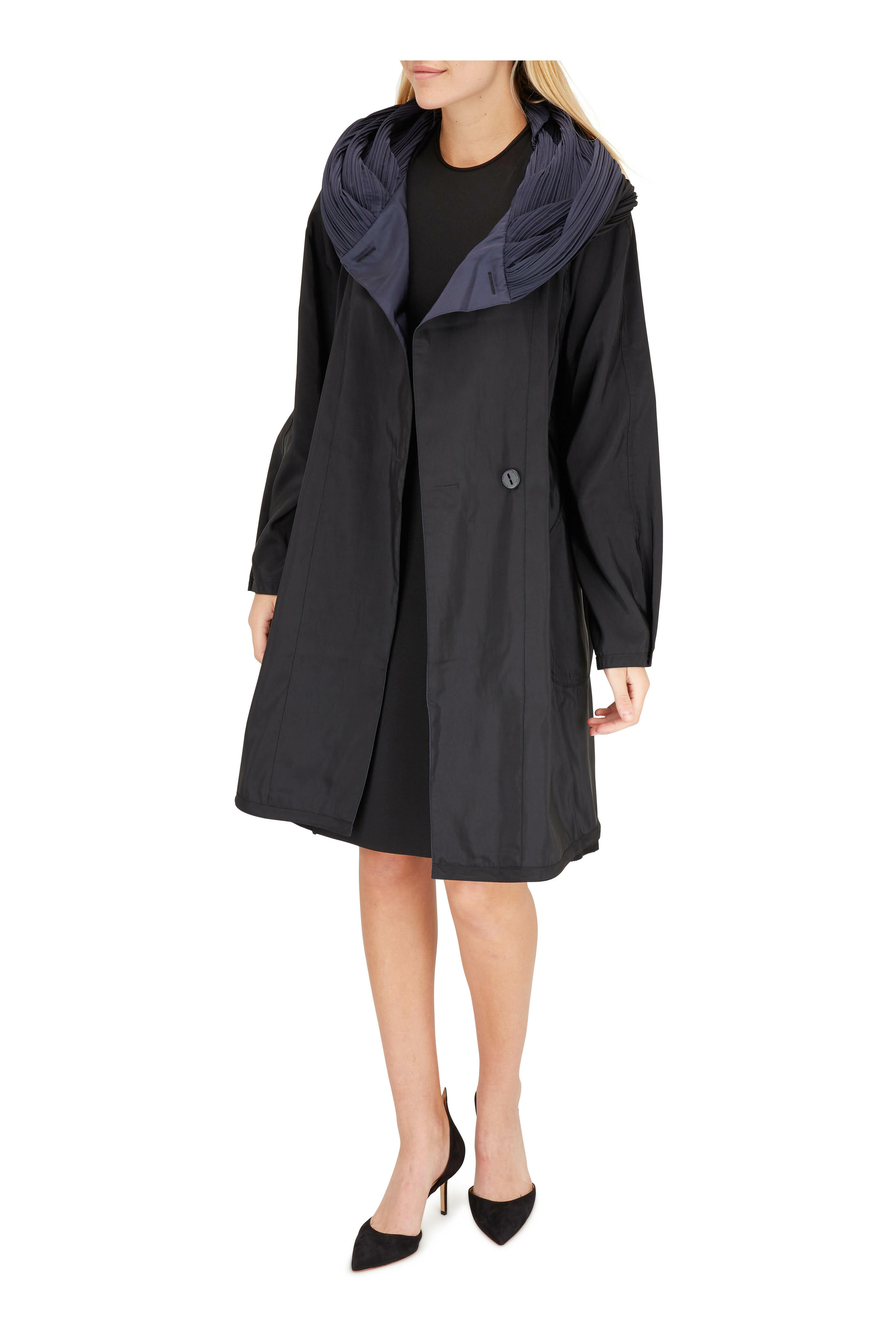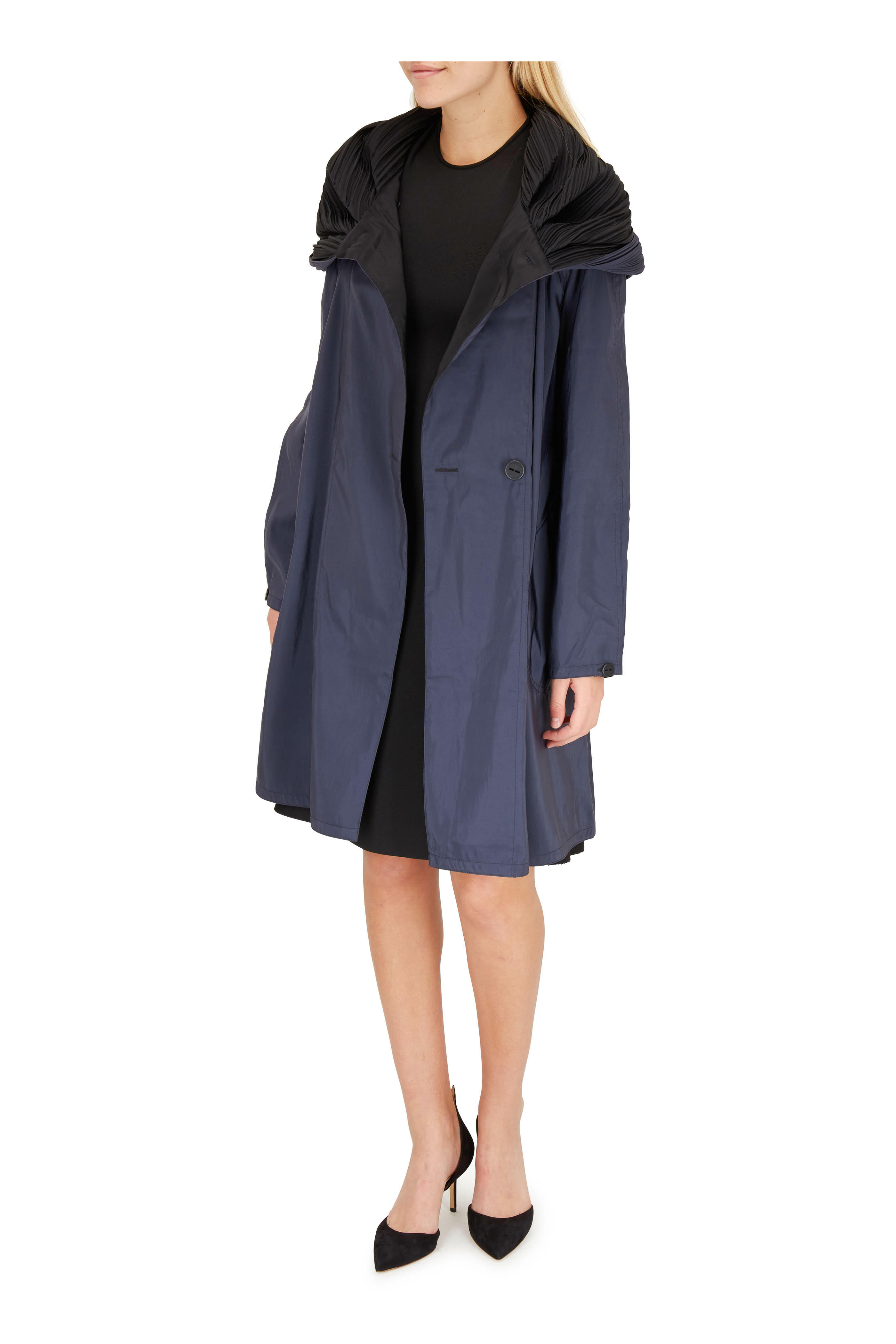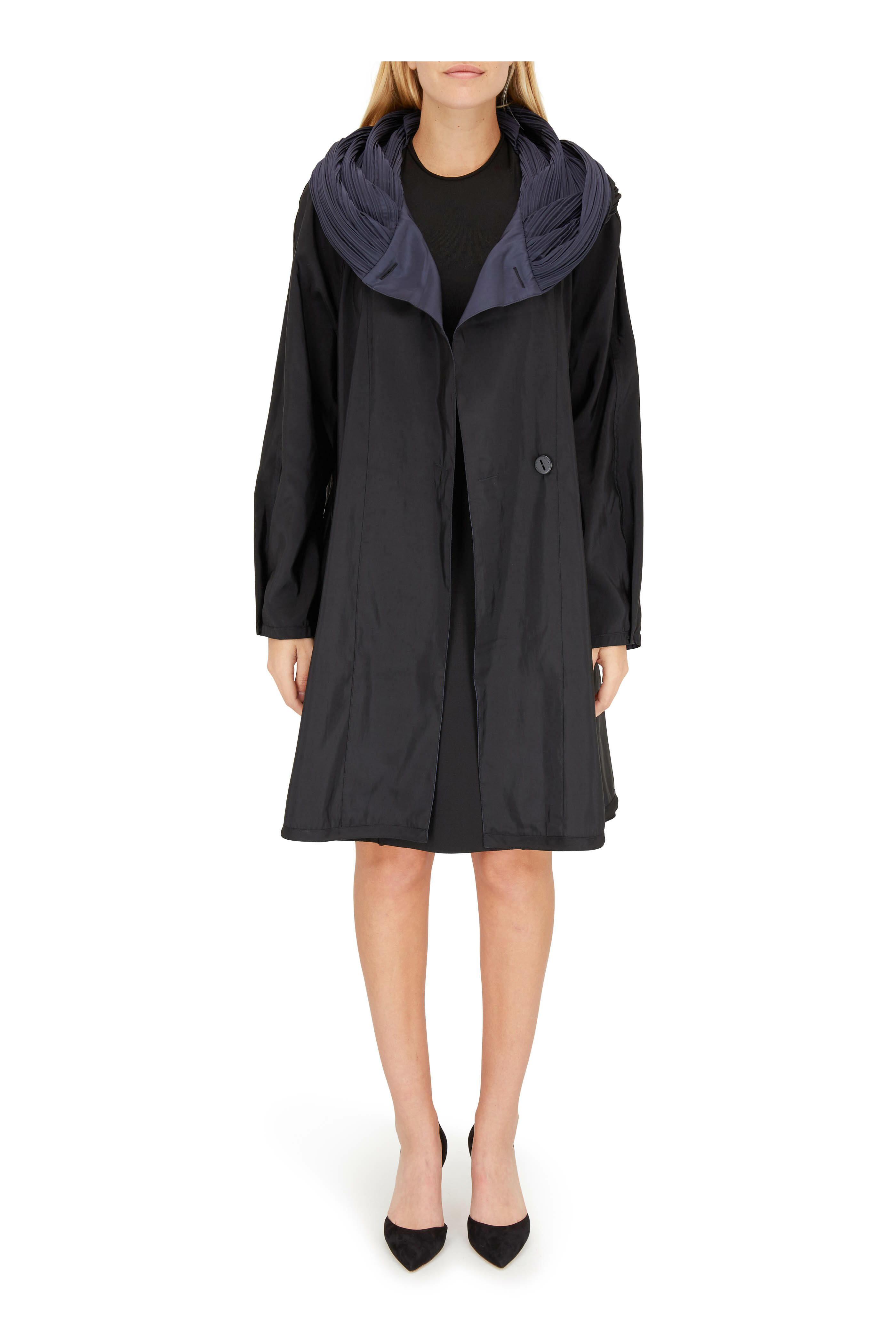 Convertible plissé hood that converts to an oversized collar. Button front closure. Front slip pockets. Raglan sleeves. Single button at cuffs. Reversible to black. Flaired A-line silhouette. Made in the USA. Runs large. We recommend sizing down one size.. Water resistant.. 37" shoulder to hem.. 55% nylon, 45% polyester; unlined. Machine wash.