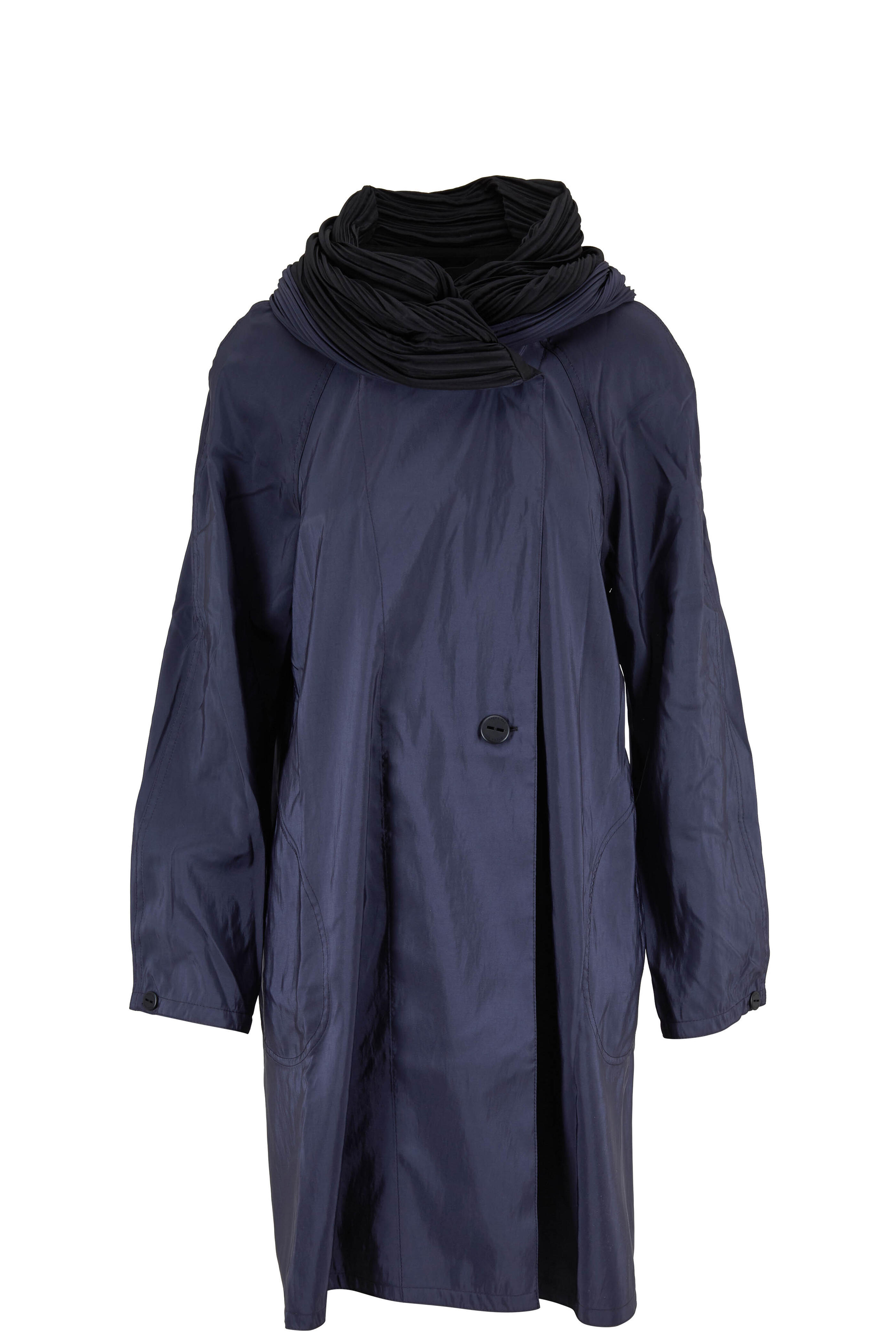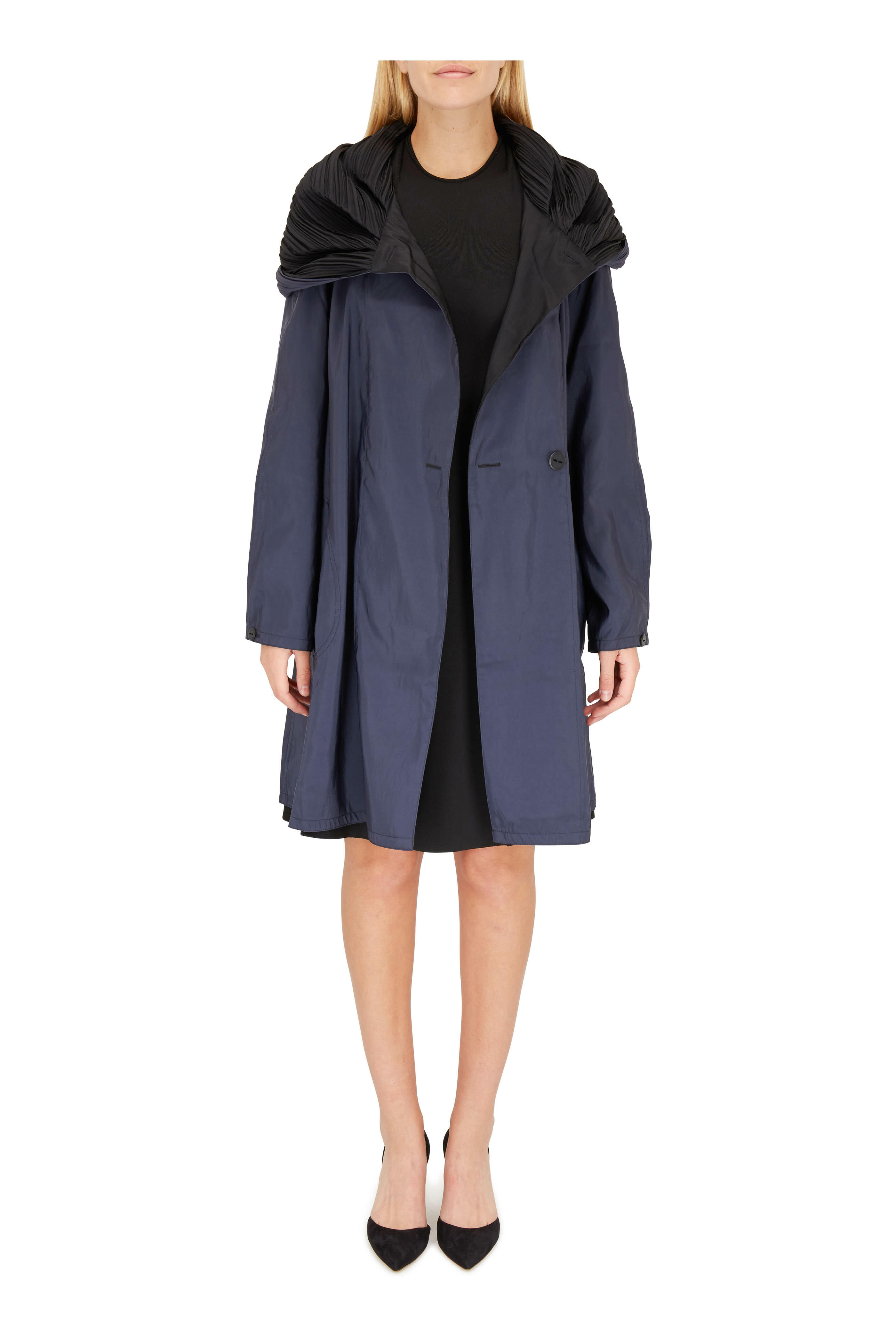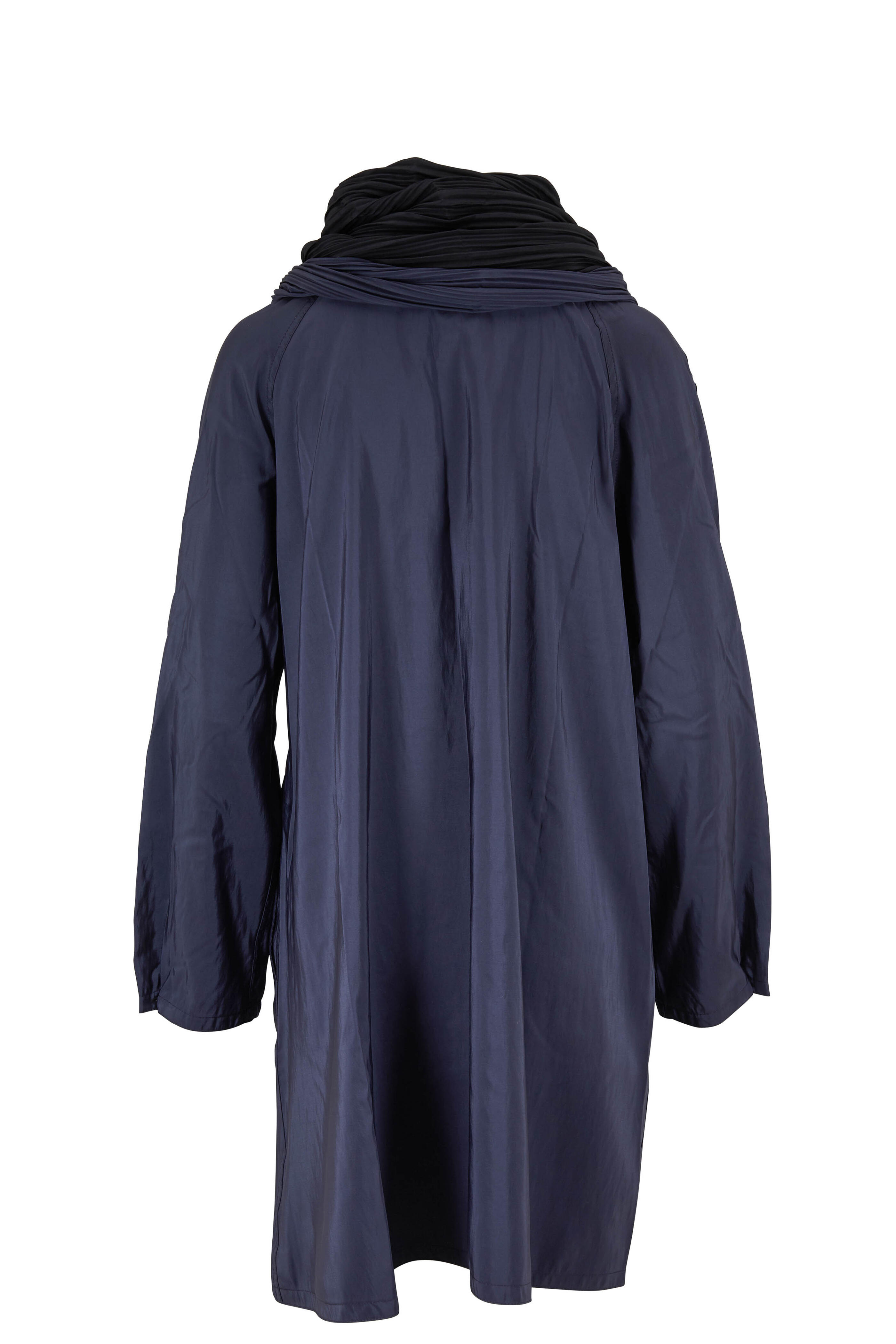 Convertible plissé hood that converts to an oversized collar. Button front closure. Front slip pockets. Raglan sleeves. Single button at cuffs. Reversible to black. Flaired A-line silhouette. Made in the USA. Runs large. We recommend sizing down one size.. Water resistant.. 37" shoulder to hem.. 55% nylon, 45% polyester; unlined. Machine wash.