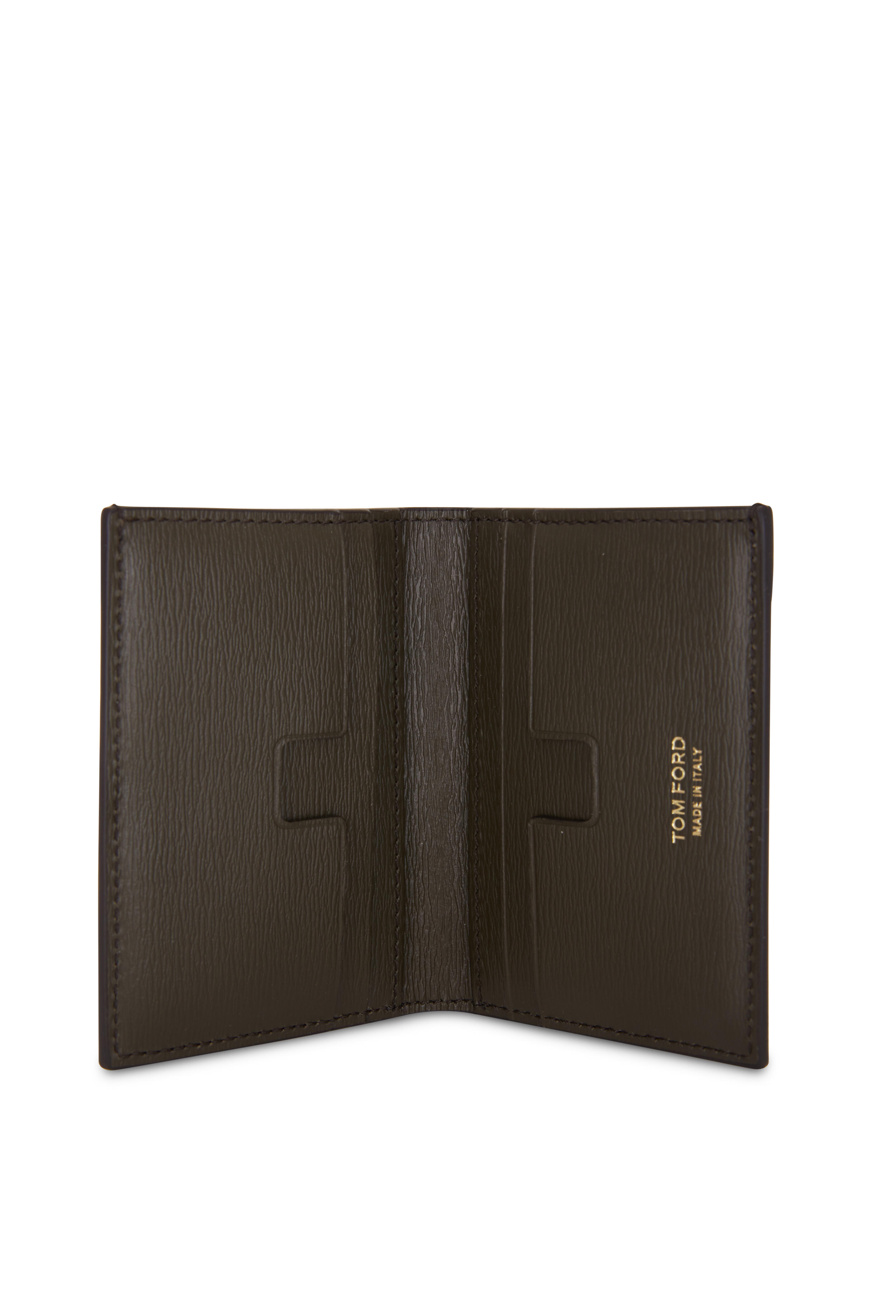 Grained calfskin leather. Gold-tone signature detail. Currency slot, two slit pockets and four card slots. Lined in leather. Made in Italy. Width: 3". Height: 4". Depth: 1".