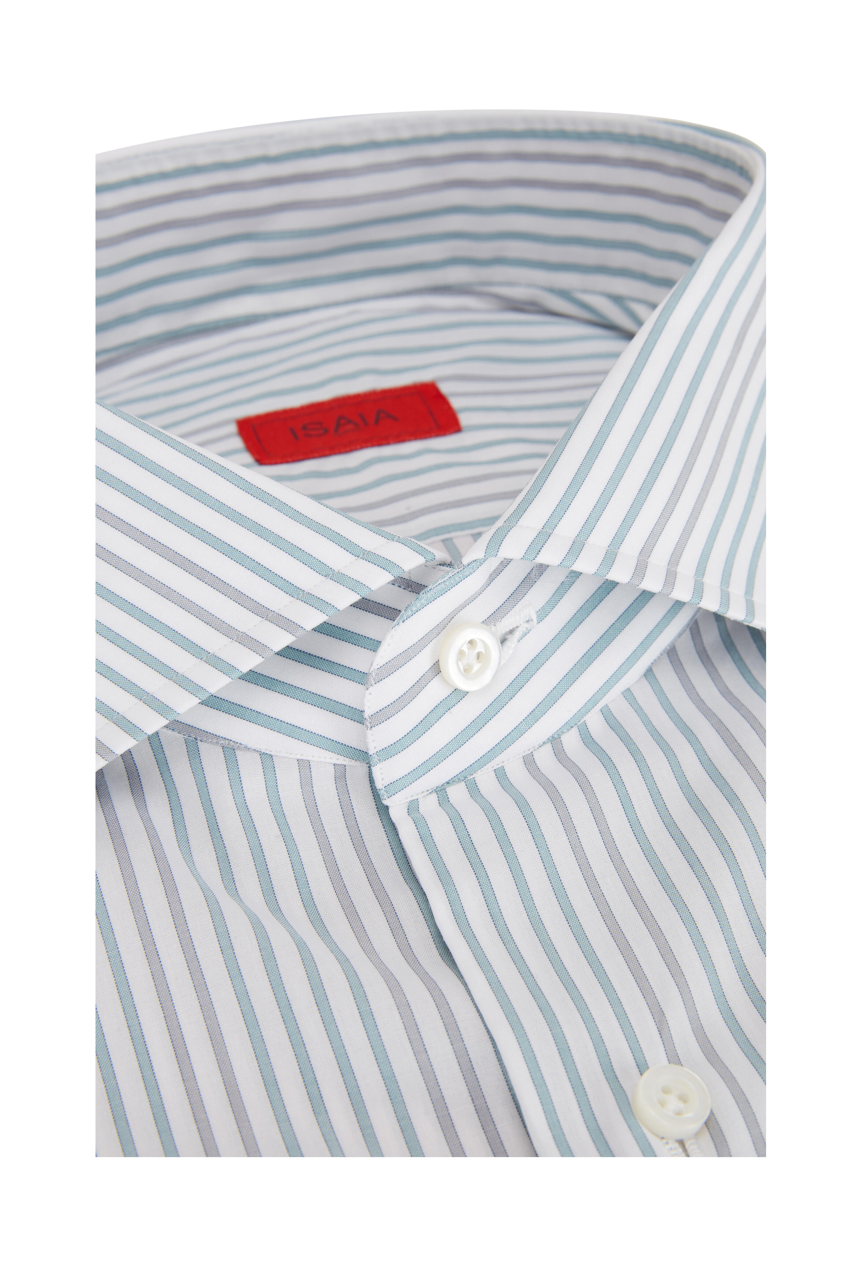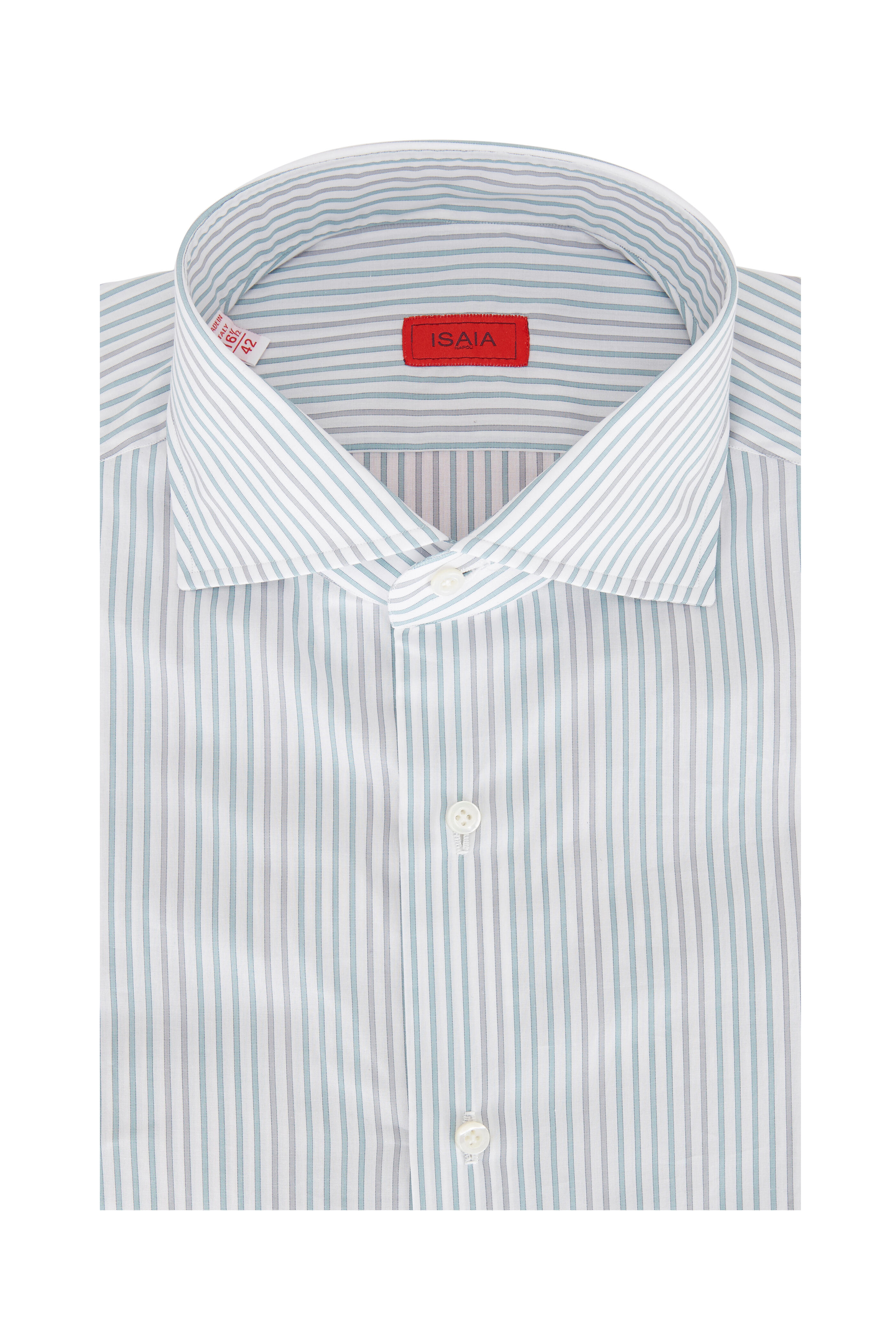 Spread collar. Single button mitered cuffs. Made in Italy. 100% cotton. Machine wash.