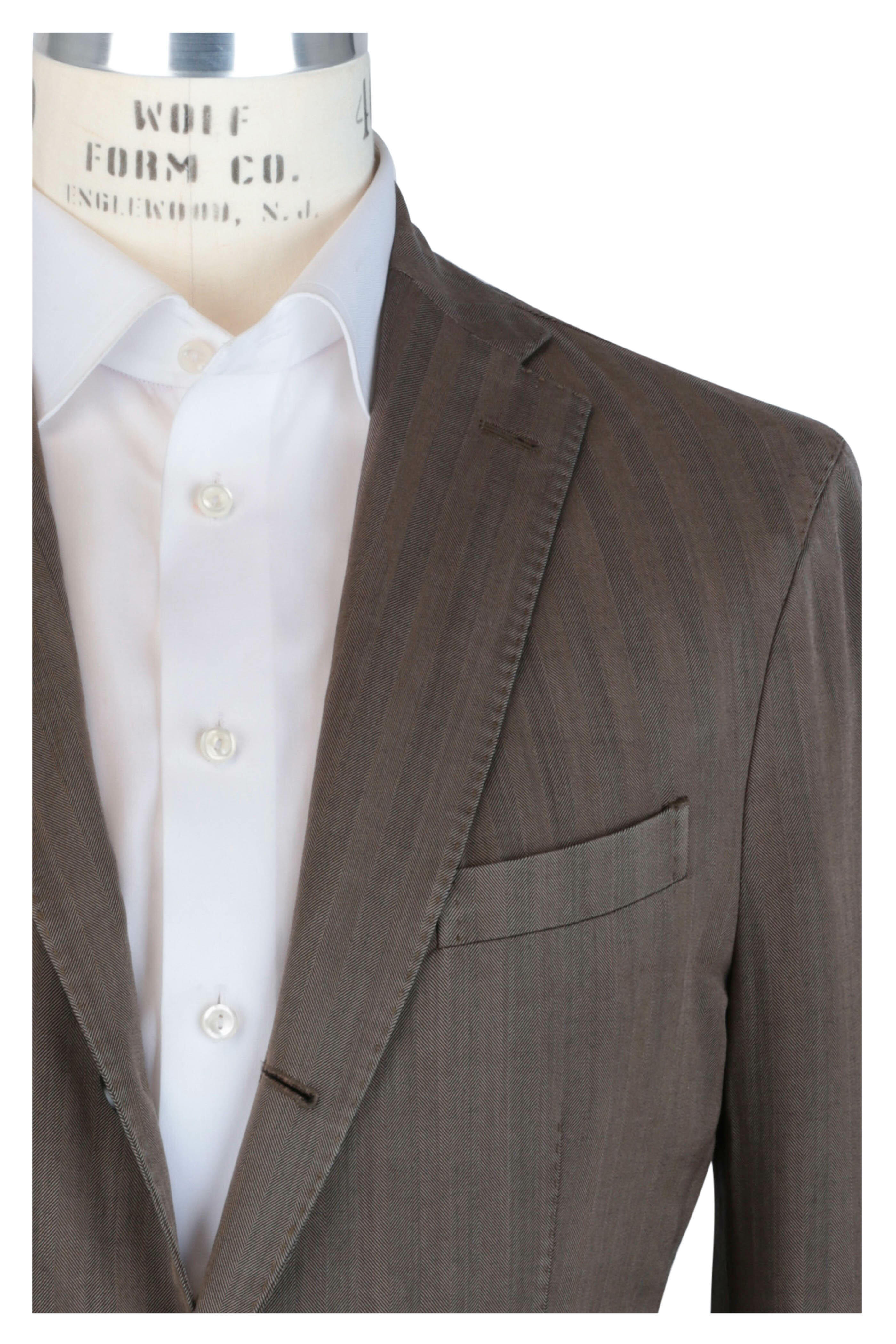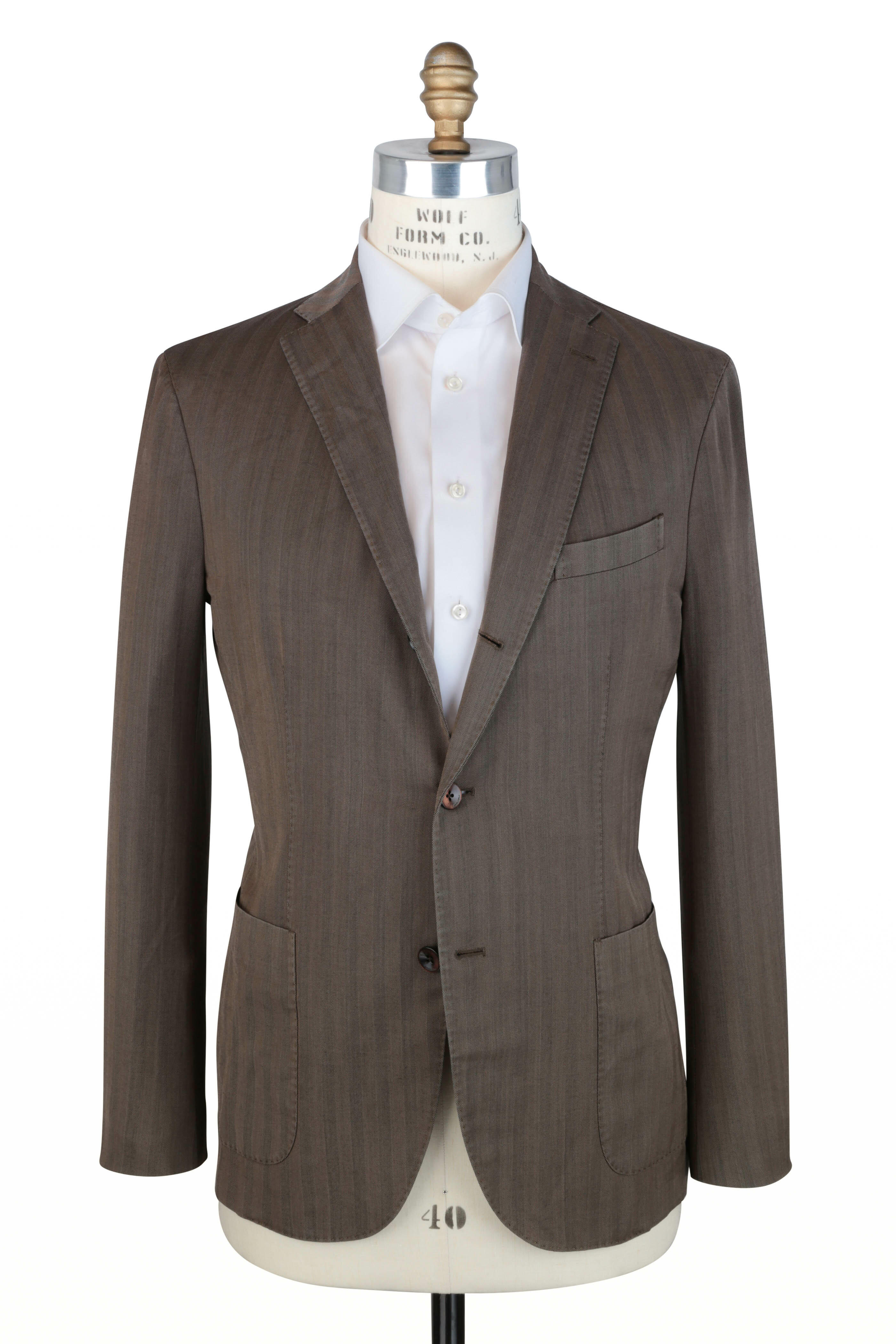 Notched lapels. Three button closure. Chest welt pocket, lower patch pockets. Double vent. Made in Italy. 100% wool; partially lined. Dry clean.
